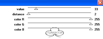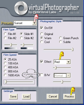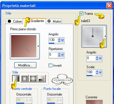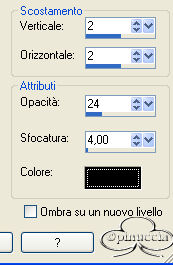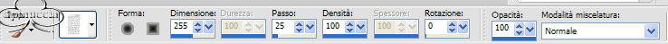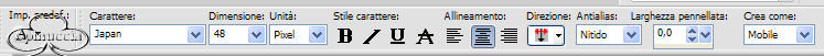 qui puoi trovare qualche risposta ai tuoi dubbi. Se l'argomento che ti interessa non è presente, ti prego di segnalarmelo. Questo tutorial è stato realizzato con PSP X. Materiale qui I tubes utilizzati per questo tutorial sono di Filly e di Patry. Filtri: FM Tile Tools qui. PhotoEffex qui Unlimited 2.0. qui Xero qui Bordermania qui Penta.com qui 1. Metti il materiale nelle rispettive cartelle. 2. Apri i tubes. Duplicali (shift+D) e chiudi gli originali. 3. Apri la trama "lee-text052". Immagine>Ridimensiona a 600 x 450 pixels. ![]() 4. Livelli>Carica/Salva maschera/Carica maschera da disco (inverti trasparenza non selezionato). ![]() Livelli>Unisci>Unisci tutto (appiattisci). 5. Effetti>Plugins>FM Tile Tools / Blend emboss, con i settaggi standard: ![]() 6. Imposta come colore di primo piano #6b2d25 (colore scuro), e come colore di sfondo #d9b9ae (colore chiaro). 7. Con questi colori imposta un gradiente di primo piano/sfondo, con i seguenti settaggi (la trama "tuile63" è nello zip): ![]() Livelli>Nuovo livello raster. 8. Riempi il nuovo livello con questo gradiente.9. Nella paletta dei livelli, abbassa l'opacità di questo livello al 34%. ![]() 10. Effetti>Plugins>Penta.com/Color dot. ![]() 11. Effetti>Effetti di bordo>Aumenta. 12. Apri il tube dell'ombrello. Posizionati sul livello del tube e vai a Modifica>Copia. Torna al tuo lavoro e vai a Modifica>Incolla come nuovo livello. Spostalo in basso a sinistra. (vedi tag finale).Immagine>Ridimensiona, 50 % (tutti i livelli non selezionato). ![]() 13. Nella paletta dei livelli, cambia la modalità di miscelatura di questo livello in "Sovrapponi". ![]() 14. Effetti>Plugins>FM Tile Tools/Blend Emboss, con i settaggi standard. ![]() 15. Effetti>effetti 3D>Sfalsa ombra, con i seguenti settaggi: ![]() 16. Apri il misted Romantic Face. Posizionati sul livello del tube e vai a Modifica>Copia. Torna al tuo lavoro e vai a Modifica>Incolla come nuovo livello. Spostalo a destra (vedi tag finale).Immagine>Ridimensiona, 80 % (tutti i livelli non selezionato). Dovresti avere questo: ![]() Livelli>Nuovo livello raster. 17. Nella paletta dei materiali, imposta come colore di primo piano il bianco (ricordati di deselezionare Trame). Riempi il nuovo livello con questo colore.18. Nella paletta dei livelli abbassa l'opacità di questo livello al 30%. Livelli>Nuovo livello raster. 19. Nella paletta dei materiali, imposta come colore di primo piano #d9b9ae e riempi il nuovo livello con questo colore.20. Nella paletta dei livelli abbassa l'opacità di questo livello al 24%. Dovresti avere questo. ![]() ![]() 21. Effetti>Plugins>FM Tile Tools/Blend Emboss, con i settaggi standard. ![]() Livelli>Nuovo livello raster. 22. Nella paletta dei materiali imposta come primo piano il colore bianco. Attiva lo strumento Pennello ![]() Cerca e applica il pennello "a-t_recrumpled_9" due o tre volte in alto e in basso (a tuo piacimento). ![]() 23. Apri il tube 06-Oriental_21. Posizionati sul livello del tube e vai a Modifica>Copia. Torna al tuo lavoro e vai a Modifica>Incolla come nuovo livello. Immagine>Ridimensiona, 30% (tutti i livelli non selezionato). Spostalo in alto a sinistra (vedi come esempio la tag finale).24. Effetti>Effetti 3D>Sfalsa ombra, con gli stessi settaggi del passo 15. ![]() Nella paletta dei livelli cambia la modalità di miscelatura in "Sovrapponi". Livelli>Nuovo livello raster. 25. Nella paletta del livelli, imposta il colore scuro come colore di primo piano. Attiva nuovamente lo strumento Pennello ![]() Seleziona il pennello "old text" (dimensione 255) ![]() e applicalo tra il tube del carattere e la donna (vedi la tag finale). 26. Nella paletta dei livelli cambia la modalità di miscelatura di questo livello in Sovrapponi e abbassa l'opacità al 48%. Dovresti avere questo. ![]() 27. Apri il tube della farfalla e vai a Modifica>Copia. Torna al tuo lavoro e vai a Modifica>Incolla come nuovo livello. Immagine>Ridimensiona, 40% (tutti i livelli non selezionato). ![]() Con lo strumento Spostamento posiziona la farfalla in alto (vedi esempio finale).Attiva lo strumento Puntatore ![]() (per chi usa PSP 9 è lo strumento Deformazione ![]() e applica alla farfalla una leggera rotazione verso sinistra. ![]() Nella paletta dei livelli, cambia la modalità di miscelatura di questo livello in "Filtra". 28. Apri il tube del fiore. Posizionati sul livello del tube e vai a Modifica>Copia. Torna al tuo lavoro e vai a Modifica>Incolla come nuovo livello. Spostalo in basso a destra (vedi esempio finale).Immagine>Ridimensiona, 50 % (tutti i livelli non selezionato). ![]() 29. Effetti>Plugins>PhotoEffex/Backround Blur. ![]() 30. Effetti>Plugins>FM Tile Tools/Blend Emboss, con i settaggi standard. ![]() 31. Livelli>Nuovo livello raster. 32. Nella paletta dei colori, imposta come colore di sfondo #947274 e chiudi il colore di primo piano. Attiva lo strumento Testo , seleziona il font "Japan",dimensione 48 (o a tua scelta, a seconda della lunghezza della tua firma); larghezza pennellata 0, Crea come Mobile ![]() e firma la tua tag. 33. Effetti>Effetti 3D>Sfalsa ombra, con i seguenti settaggi: ![]() Selezione>Deseleziona. 34. Nella paletta dei livelli, abbassa l'opacità di questo livello al 50%. Livelli>Nuovo livello raster. 35. Nella paletta dei colori, mantieni il colore #947274 come colore di sfondo. Attiva lo strumento Testo con un font a tua scelta.Io ho scelto Verdana, dimensione 9 e scrivi l'indirizzo del tuo sito, se ne hai uno. Immagine>Ruota>Ruota per gradi (270 a destra). ![]() Posiziona il testo sulla sinistra della tag. Selezione>Deseleziona. 36. Nella paletta dei livelli abbassa l'opacità di questo livello all'80%. Livelli>Unisci>Unisci tutto (appiattisci). 37. Effetti>Plugins>Bordermania / Frame #2. ![]() 38.Effetti>Plugins>Unlimited 2.0/Buttons and Frames/Glass Frame 2. ![]() 39. Effetti>Plugins>FM Tile Tools/Blend Emboss, con i settaggi standard. 40. Effetti>Plugins>OptikVerve/Virtual Photographer/Sunset. Clicca sul triangolino indicato dalla manina rossa
