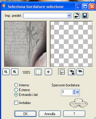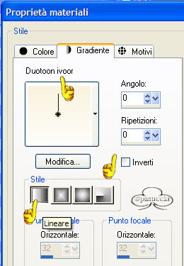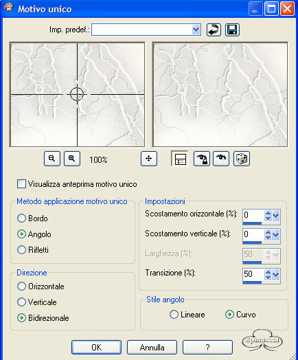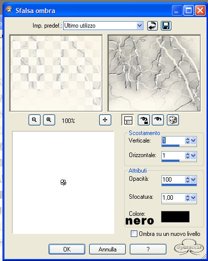qui puoi trovare qualche risposta ai tuoi dubbi. Se l'argomento che ti interessa non è presente, ti prego di segnalarmelo. Occorrente: Materiale qui Filtri: Xero - Porcelain qui Xero - Tekstya qui Metti il gradiente nella cartella Gradienti. Metti la maschera nella cartella Maschere. Apri il resto del materiale in PSP. Ancora una volta ringrazio gli autori dei tubes, non cancellate il loro nome. 1. Apri una nuova immagine trasparente 600 x 450 pixels. 2. Nella paletta dei materiali imposta il gradiente Duotone ivoor, incluso nello zip, con i seguenti settaggi: ![]() Riempi l'immagine con il gradiente.3. Livelli>Carica/Salva maschera/Carica maschera da disco e cerca la maschera Lightning. ![]() Livelli>Unisci>Unisci gruppo. Effetti>Effetti 3D>Sfalsa ombra, con i seguenti settaggi: ![]() Livelli>Unisci>Unisci visibile. 4. Nella paletta dei livelli abbassa l'opacità al 50%. Livelli>Unisci>unisci tutto (appiattisci). 5. Effetti>Effetti di immagine>Motivo unico: ![]() 6. Effetti>Plugins>Xero - tekstya: ![]() 7. Apri il tube di Patry oldBook e vai a Modifica>Copia. Torna al tuo lavoro e vai a Modifica>Incolla>Incolla come nuovo livello. Spostalo in alto distante dal bordo almeno mezzo centimetro.Nella paletta dei livelli cambia la modalità di miscelatura in Luminanza (esistente) e abbassa l'opacità al 35%. 8. Apri il tube del bicchiere (anche questo è di Patry) e vai a Modifica>Copia. Torna al tuo lavoro e vai a Modifica>Incolla>Incolla come nuovo livello. Spostalo nell'angolo sotto a sinistra.Nella paletta dei livelli abbassa l'opacità all'80%. 9. Apri il tube della donna (è un misted di Gini). Immagine>Ridimensiona, dell'85%. Modifica>Copia. Torna al tuo lavoro e vai a Modifica>Incolla>Incolla come nuovo livello. Posizionala in basso sul lato destro.10. Livelli>Unisci>Unisci tutto. 11. Selezione>Seleziona tutto. Selezione>Modifica>Contrai, di 10 pixels. ![]() 12. Selezione>seleziona bordature selezione: ![]() 13. Riempi la selezione con il gradiente duotone ivoor.14. Effetti>Effetti 3D>Sfalsa ombra: ![]() 15. Ripeti l'Effetto sfalsa ombra, ma cambiando verticale e orizzontale a -1. 16. Selezione>Nessuna selezione. 17. Immagine>Aggiungi bordatura, 2 pixels, simmetriche, con il colore nero. 18. Regola>Correzione fotografica>Rimozione disturbo da camera digitale, con i settaggi standard. ![]() 19. Effetti>Plugins>Xero - Porcelain, con i settaggi standard: ![]() 20. Apri il file di testo e vai a Modifica>Copia. Torna al tuo lavoro e vai a Modifica>Incolla>Incolla come nuovo livello. Mettilo in alto a sinistra nell'immagine.21. Aggiungi il tuo watermark. Livelli>Unisci>Unisci tutto (appiattisci). 21. Immagine>Ridimensiona dell'80%, tutti i livelli selezionato. ![]()