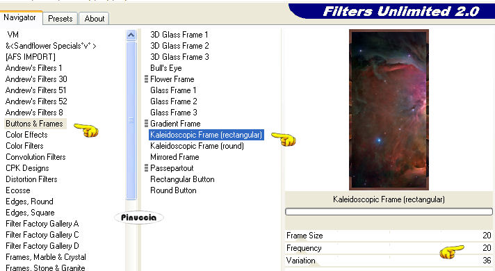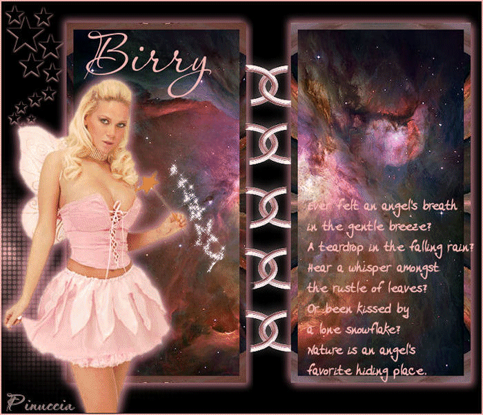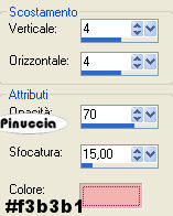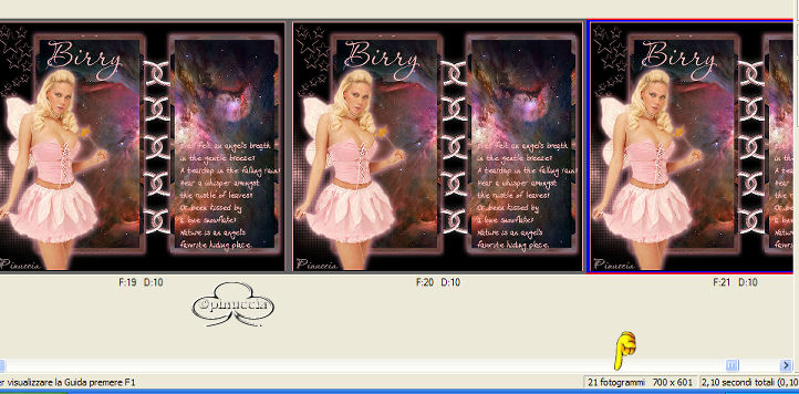 qui puoi trovare qualche risposta ai tuoi dubbi. Se l'argomento che ti interessa non è presente, ti prego di segnalarmelo. Questo tutorial è stato scritto da Snakelady per Birry. E' un omaggio alle sue belle lezioni e ai suoi tubes. Il tube che ho usato per questo tutorial è di Birry (il sito è chiuso) Occorrente: Materiale: qui Metti i pennelli nella cartella Pennelli. Apri i tubes in PSP. se hai problemi con i pennelli, vedi qui Filtro Unlimited 2 qui Apri una nuova immagine trasparente 700x600 pixels, e riempila con il nero.Apri una delle due immagini di sfondo "Nasa_Orion_Nebula" e vai a Modifica>Copia. Torna al tuo lavoro e vai a Modifica>Incolla>Incolla come nuovo livello. Spostala a destra, un po' in alto.Selezione>Seleziona tutto. Selezione>Mobile. Effetti>Plugins>Filters Unlimited - Frames & Borders - Kaleidoscopic frame (rectangular): ![]() Selezione>Nessuna selezione. Effetti>Effetti 3D>Sfalsa ombra: ![]() Ripeti l'Effetto Sfalsa ombra, ma cambiando verticale e orizzontale a -4. Apri la seconda immagine di sfondo e vai a Modifica>Copia. Torna al tuo lavoro e vai a Modifica>Incolla>Incolla come nuovo livello. Spostala a sinistra.Selezione>Seleziona tutto. Selezione>Mobile. Effetti>Plugins>Filters Unlimited - Frames & Borders - Kaleidoscopic frame (rectangular), con gli stessi settaggi usati per l'altra immagine di sfondo. Selezione>Nessuna selezione. Effetti>Effetti 3D>Sfalsa ombra, con i settaggi precedenti. Ripeti l'Effetto Sfalsa ombra, cambiando verticale e orizzontale a -4. Apri il file "SnakeSpiraal" e vai a Modifica>Copia. Torna al tuo lavoro e vai a Modifica>Incolla>Incolla come nuovo livello. Posiziona la spirale, in modo che colleghi le due immagini di sfondo.![]() Chiudi il livello nero di sfondo e posizionati su uno degli altri livelli. Livelli>Unisci>Unisci visibile. Riapri il livello di sfondo. Apri il tube di Birry (Sirensecrets2) e vai a Modifica>Copia. Torna al tuo lavoro e vai a Modifica>Incolla>Incolla come nuovo livello. Spostalo in basso a sinistra.Effetti>Effetti 3D>Sfalsa ombra, con i settaggi precedenti a 4 e -4. Attiva il livello con lo sfondo nero. Imposta il colore di primo piano con un colore preso dal tube, io ho scelto #f3b3b1. Attiva lo strumento Pennello ![]() cerca e seleziona il pennello geometric02 e applicalo nell'angolo in basso a sinistra. Cerca e seleziona il pennello hbg03-starstuck 001 e applicalo in alto a sinistra. Posizionati adesso sul livello superiore per attivarlo. Seleziona il pennello SnaketekstBirry e applicalo sul lato destro, in basso. Livelli>Unisci>Unisci tutto. Immagine>Aggiungi bordatura, 3 pixels, simmetriche, con il colore rosa. Aggiungi il tuo nome o il tuo watermark. Io ho usato il font PassionConflictRO, dimensione 72. Se non vuoi aggiungere l'animazione, la tag è finita. Livelli>Unisci>Unisci tutto e salva in formato jpg. ![]() Per aggiungere l'animazione, copia l'immagine: Modifica>Copia. Apri Animation Shop. Clicca con il tasto destro del mouse sullo spazio vuoto e Incolla come nuova animazione. ![]() Clicca sull'immagine con il tasto destro del mouse e scegli Duplica, e ripeti finchè non avrai ottenuto 21 fotogrammi. A volte le immagini grandi "invadono" l'area di lavoro. Per avere una visualizzazione migliore di queste immagini, porta avanti la rotellina del mouse per ridurne le dimensioni. ![]() Posizionati e clicca sul primo fotogramma e vai a Modifica>Seleziona tutto. Apri l'animazione (nello zip) Robertablingblingtrail7. Vedrai che l'animazione ha 22 fotogrammi e che il primo fotogramma è nero. Clicca su questo fotogramma nero con il tasto destro del mouse ed Elimina. Posizionati e clicca sul primo fotogramma e vai a Modifica>Seleziona tutto. Animazione>Rifletti. Modifica>Copia. Torna alla tua immagine e vai a Modifica>Incolla>Incolla nel fotogramma selezionato. Apparirà soltanto una parte dell'animazione, cerca la posizione corretta e, quando l'hai trovata, rilascia il tasto del mouse. Nella schermata sotto, si vede più o meno il punto dove fermarla per ottenere la stella sul lato destro, come nel mio esempio. ![]() Per controllare il risultato, clicca su Visualizza ![]() Ricorda che, se non sei soddisfatto del risultato, puoi tornare indietro con Modifica>Annulla incolla, e ripetere l'operazione. Salva in formato gif. ![]() Se hai problemi o dubbi, o trovi un link non funzionante, o anche soltanto per un saluto, scrivimi. Gennaio 2007 |