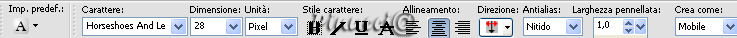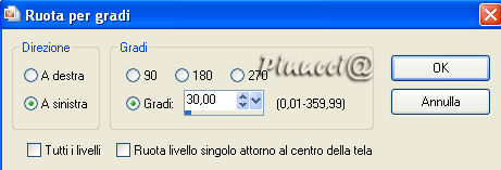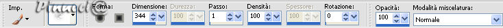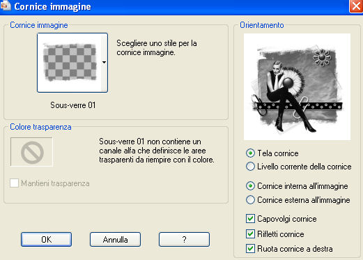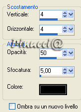qui puoi trovare qualche risposta ai tuoi dubbi. Se l'argomento che ti interessa non è presente, ti prego di segnalarmelo. Questo tutorial è stato realizzato con PSP X. Occorrente: il tube di una donna, un pennello, 2 font, una maschera, una cornice e diversi elementi scrap qui Il tube è di "Brigitte", gli elementi scrap sono di "Melissa". Filtro Eye Candy 4000 qui in caso di problemi, qui trovi alcuni appunti. Se non hai trovato la risposta che cercavi, per favore, fammelo sapere. 1. Apri i tubes, duplicali (shif+D) e chiudi gli originali. 2. Apri una nuova immagine trasparente 400 x 400 pixels. Imposta il colore di primo piano su nero (#000000) e riempi l'immagine con questo colore.3. Livelli>Carica/Salva maschera>Carica maschera da disco. Cerca e carica la maschera "edge-chalk01". ![]() Livelli>Unisci>Uinsci gruppo. 4. Nella paletta dei livelli, abbassa l'opacità di questo livello al 65%. Livelli>Unisci>Unisci tutto (appiattisci). 5. Imposta il bianco (#ffffff) come colore di primo piano. Attiva lo strumento Pennello ![]() Cerca e seleziona il pennello "a-t-crumpled11", dimensione 344, con i seguenti settaggi: ![]() applicalo diverse volte sull'immagine. Io l'ho applicato una volta per ogni angolo. ![]() 6. Immagine>Dimensione tela: ![]() Livelli>Nuovo livello raster. 7. Attiva lo strumento Selezione , rettangolo,e traccia un rettangolo come mostrato nella schermata sotto: ![]() Ripeti il passo 5, applicando il pennello diverse volte (secondo il tuo gusto) nel rettangolo. 8. Mantieni selezionato. Immagine>Ruota>ruota per gradi: ![]() 9. Effetti>Effetti 3D>Scalpello: ![]() Dovresti avere questo: ![]() 10. Mantieni selezionato. Effetti>Effetti 3D>Sfalsa ombra, con i seguenti settaggi: ![]() Selezione>Nessuna selezione. Il risultato potrebbe essere differente dal mio, tutto dipende dal numero di volte che hai applicato il pennello. Dipende da te se preferisci uno sfondo più scuro o più chiaro. Ecco il risultato con lo sfalsa ombra. ![]() 11. Attiva il tube "Mtm-Lady-Wicked-Bow-17 nov 2005" e vai a Modifica>Copia. Torna al tuo lavoro e vai a Modifica>Incolla>Incolla come nuovo livello. Posizionala in basso (vedi l'esempio della tag finale). Immagine>Ridimensiona, dell'80%, tutti i livelli non selezionato. Regola>Messa a fuoco>Metti a fuoco. 12. Attiva il file "Image14" e vai a Modifica>Copia. Torna al tuo lavoro e vai a Modifica>Incolla>Incolla come nuovo livello. Nella paletta dei livelli sposta questo livello sotto il livello "Raster2" (il tube della donna). Con lo strumento Spostamento posizionalo correttamente.(vedi tag finale). Effetti>Effetti 3D>Sfalsa ombra, con gli stessi settaggi del passo 10. 13. Attiva il tube dei fiori (Image 12). Seleziona il fiore più grande e vai a Modifica>Copia.![]() Torna al tuo lavoro e vai a Modifica>Incolla>Incolla come nuovo livello. Immagine>Ridimensiona, dell'80%, tutti i livelli non selezionato. Posizionalo correttamente (vedi tag finale).Nella paletta dei livelli, dovresti avere questo: ![]() 14. Attiva il tube delle graffette (Image 11). Seleziona la clip nera e vai a Modifica>Copia.![]() Torna al tuo lavoro e vai a Modifica>Incolla>Incolla come nuovo livello. Spostalo a sinistra (vedi tag finale).Immagine>Ruota>Ruota per gradi, come al passo 8. Con lo strumento Selezione a mano libera ![]() contorna le parti della clip, che devono rimanere dietro, come mostrato nella schermata sotto: ![]() 15. Premi sulla tastiera il tasto CANC. Selezione>Nessuna selezione. 16. Effetti>Effetti 3D>Sfalsa ombra, con i settaggi del passo 10. 17. Attiva nuovamente il tube delle clip. Avrai ancora attiva la precedente selezione, quindi prima vai a Selezione>Nessuna selezione. Seleziona la clip bianca e vai a Modifica>Copia.Torna al tuo lavoro e vai a Modifica>Incolla>Incolla come nuovo livello. Spostalo in basso verso il tube della donna.(vedi la tag finale). Immagine>Ruota>Ruota per gradi, come al passo 8. (ma a destra invece che a sinistra). Con la Selezione a mano libera contorna le parti della clipche devono trovarsi dietro: ![]() 18. Premi sulla tastiera il tasto CANC. Selezione>Nessuna selezione. 19. Effetti>Effetti 3D>Sfalsa ombra, con i settaggi del passo 10. 20. Attiva nuovamente il tube dei fiori. Avrai ancora attiva la precedente selezione, quindi prima vai a Selezione>Nessuna selezione. Seleziona un altro fiore e vai a Modifica>Copia.Torna al tuo lavoro e vai a Modifica>Incolla>Incolla come nuovo livello. Immagine>Ridimensiona, del 50%, tutti i livelli non selezionato. Spostalo in alto (vedi la tag finale).Effetti>Effetti 3D>Sfalsa ombra, con i settaggi del passo 10. Livelli>Unisci>Unisci visibile. 21. Immagine>Cornice immagine Cerca e seleziona la cornice "Sous-verre01" e clicca ok. ![]() Livelli>Nuovo livello raster. 22. Imposta il nero (#000000) come colore di sfondo e chiudi il colore di primo piano. Attiva lo strumento Testo , font "Horseshoes And Lemonade", dimensione 28,e scrivi "Black". Selezione>Nessuna selezione. Spostalo secondo il tuo gusto.![]() 23. Livelli>Nuovo livello raster. Ripeti il passo 22, ma scrivi "and". 24. Livelli>Nuovo livello raster. Imposta il bianco (#ffffff) come colore di sfondo, sempre chiuso il colore di primo piano. Ripeti il passo 22, ma scrivi "white"> Livelli>Nuovo livello raster. 25. Attiva il tube "Image17". Seleziona una targhetta e vai a Modifica>Copia.Torna al tuo lavoro e vai a Modifica>Incolla>Incolla come nuovo livello. Immagine>Ridimensiona, dell'80%, tutti i livelli non selezionato. Immagine>Ruota>ruota per gradi, come nella schermata sotto: ![]() E posizionalo (vedi la tag finale). Livelli>Nuovo livello raster. 26. Imposta il colore di sfondo con il nero e chiudi il colore di primo piano. Attiva lo strumento Testo , font "Satisfaction" dimensione 30,pennellata 1, e firma. ![]() 27. Immagine>Ruota>Ruota per gradi: ![]() 28. Effetti>effetti 3D>Sfalsa ombra: ![]() Selezione>Nessuna selezione. Livelli>Unisci>Unisci tutto (appiattisci). Salva in formato jpg. ![]() Se hai problemi o dubbi, o trovi un link