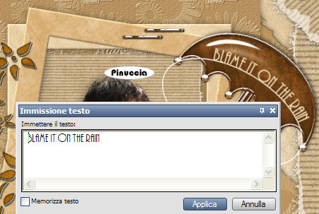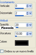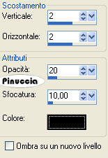 ![]() Effetti>Effetti 3D>Sfalsa ombra, con i seguenti settaggi, colore nero: ![]() 18. Attiva il livello della cornice. Effetti>Effetti 3D>Sfalsa ombra, con i seguenti settaggi, colore nero: ![]() 19. Livelli>Unisci>Unisci giù, e ripeti. Sposta la cornice a destra.![]() 20. Nel kit SE_ScrapKit_BlameItOnTheRain, clicca sul livello SE_BlameItOnTheRain_StringFlowers, e vai a Modifica>Copia. Torna al tuo lavoro e vai a Modifica>Incolla>Incolla come nuovo livello. Spostalo sopra la cornice.Effetti>Effetti 3D>Sfalsa ombra, con i seguenti settaggi, colore nero: ![]() Cambia la modalità di miscelatura di questo livello in Luminanza (Esistente). 21. Nel kit SE_ScrapKit_BlameItOnTheRain, clicca sul livello SE_BlameItOnTheRain_FlowerDoodle, e vai a Modifica>Copia. Torna al tuo lavoro e vai a Modifica>Incolla>Incolla come nuovo livello. Spostalo a sinistra in modo che la parte alta del fiore si appoggi sul nastro superiore.Con lo strumento Deformazione spingi il fiore in modo che si appoggi sul nastro inferiore.22. Nel kit SE_ScrapKit_BlameItOnTheRain, clicca sul livello SE_BlameItOnTheRain_Umbrella, e vai a Modifica>Copia. Torna al tuo lavoro e vai a Modifica>Incolla>Incolla come nuovo livello. Spostalo a destra sopra la cornice,in modo che la curva del manico si trovi nell'incrocio delle due cornici. 23. Con lo strumento Selezione a mano libera , punto a punto (abbassa eventualmente l'opacità del livello dell'ombrello per vedere meglio),e seleziona la parte del manico che dovrebbe trovarsi dietro la cornice. ![]() Premi sulla tastiera il tasto canc ![]() Selezione>Nessuna selezione. ![]() 24. Effetti>Effetti 3d>Sfalsa ombra, con i seguenti settaggi, colore nero. ![]() 25. Attiva lo strumento Forme predefinite , ellisse, crea come vettorecolore di primo piano impostato sul bianco #fffffff ![]() traccia l'ellisse intorno all'ombrello. Usando i nodi del vettore (manina gialla) adatta la forma intorno all'ombrello, quando appare l'icona delle frecce arrotondate (manina rossa) puoi ruotare la forma, quando appare l'icona dello spostamento (manina scura) puoi spostarla. ![]() 26. Quando hai finito di sistemare la forma, muovi il mouse per far apparire l'icona dello spostamento ![]() e posiziona linea nel punto in cui vuoi che appaia il testo. ![]() 27. Attiva lo strumento Testo , font Andes, dimensione 18 pixels,se stai usando PSP X, dovrai regolare la dimensione, perchè i pixels delle due versioni non corrispondono Imposta il colore di sfondo con #E6D1AE. Sposta il mouse sulla linea, finchè non vedi apparire una A sottolineata con un una linea arrotondata, quando la vedi clicca con il mouse e apparirà la finestra del testo. ![]() Scrivi il testo BLAME IT ON THE RAIN, o quello che preferisci. Usa il tasto dello spazio per controllare la posizione del testo sulla curva, e clicca Applica. nel mio caso, ho dovuto aggiungere lo spazio all'inizio del testo. ![]() 28. Vai adesso alla paletta dei livelli e clicca sul segno più del livello Vettore 1. Si aprirà il menu e appariranno i livelli del testo e dell'ellisse. Clicca sull'occhio del livello della forma per togliere la visibilità al livello. ![]() Livelli>Converti in livello raster. 29. Effetti>Effetti 3D>Sfalsa ombra, con i seguenti settaggi, colore nero. ![]() 30. Apri il tube scrap-blend11-corner-embellishment e vai a Modifica>Copia. Torna al tuo lavoro e vai a Modifica>Incolla>Incolla come nuovo livello. Spostalo nell'angolo in alto a sinistra.Livelli>Duplica. Immagine>Rifletti. Livelli>Unisci>Unisci giù. Livelli>Duplica. Immagine>Capovolgi. 31. Controlla che tutto sia al punto giusto e vai a Livelli>Unisci>Unisci tutto. 32. Immagine>Aggiungi bordatura, 2 pixels, simmetriche, con il colore #714913. 33. Ridimensiona, se vuoi, e salva in formato jpg. ![]() ![]() Se hai problemi o dubbi, o trovi un link non funzionante, o anche soltanto un saluto, scrivimi. 9 Luglio 2007 |