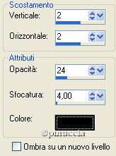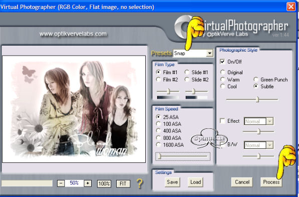 sulla sinistra (Vedi tag finale).15. Nella paletta dei livelli, cambia la modalità di miscelatura di questo livello in Luminanza (Esistente). ![]() Livelli>Unisci>Unisci tutto (appiattisci). 16. Immagine>Ridimensiona, a 500 pixels di altezza, tutti i livelli selezionato. 17. Regola>Messa a fuoco>Metti a fuoco. Livelli>Nuovo livello raster. 18. Nella paletta dei colori, imposta il colore di primo piano con #693a3a. Attiva lo strumento Pennello ![]() cerca il pennello "phoenix_psp_butterflies004", dimensione 90, e applicalo. ![]() problemi con i pennelli? Forse qui trovi un aiuto. 19. Effetti>Effetti 3D>Sfalsa ombra: ![]() 20. Nella paletta dei livelli, abbassa l'opacità di questo livello al 50%. 21. Nella paletta dei colori, imposta il colore bianco come colore di sfondo. Chiudi il colore di primo piano. Attiva lo strumento Testo , font Satisfaction, dimensione 48, e scrivi "Blend".Vedi i settaggi qui sotto. Posiziona il testo in basso a destra (vedi tag finale). ![]() Livelli>Converti in livello raster. 22. Nella paletta dei livelli, abbassa l'opacità di questo livello al 66%. 23. Nella paletta dei colori, sempre con il colore bianco come colore di sfondo, chiuso il colore di primo piano. Strumento Testo , font Applejuiced, dimensione 48, scrivi "Woman".Livelli>Converti in livello raster. 24. Nella paletta dei livelli, abbassa l'opacità di questo livello all'86%. Livelli>Nuovo livello raster. 25. Nella paletta dei colori, imposta il colore bianco come colore di primo piano. Riempi questo nuovo livello con il colore bianco.Nella paletta dei livelli, abbassa l'opacità di questo livello al 10%. Livelli>Unisci>Unisci tutto (appiattisci). 26. Effetti>Plugins>OptickVerve Labs /Virtual photographer, con i seguenti settaggi: ![]() clicca Process. Livelli>nuovo livello raster. 27. Nella paletta dei colori, imposta il colore nero come colore di sfondo Chiudi il colore di primo piano. Strumento Testo , pennellata 0, font a scelta (sottile), firma in basso a sinistra.(vedi tag finale). Effetti>Effetti 3D>Sfalsa ombra, con i settaggi usati al passo 19. Livelli>Unisci>Unisci tutto (appiattisci). ![]() Se hai problemi o dubbi, o trovi un link non funzionante, o anche soltanto per un saluto, scrivimi. Settembre 2006 |