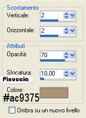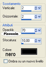 qui puoi trovare qualche risposta ai tuoi dubbi. Se l'argomento che ti interessa non è presente, ti prego di segnalarmelo. Occorrente: Il bel tube è di Marcio C . Materiale qui Apri i tubes in PSP. Apri una nuova immagine trasparente 650x450 pixels. Selezione>Seleziona tutto. Attiva il file di sfondo BG-peace e vai a Modifica>Copia. Torna alla tua immagine trasparente e vai a Modifica>Incolla>Incolla nella selezione. Attiva Overlay-peace e vai a Modifica>Copia. Torna al tuo lavoro e vai a Modifica>Incolla>Incolla nella selezione. Selezione>Nessuna selezione. Attiva il file "Slantstich" e vai a Modifica>Copia. Torna al tuo lavoro e vai a Modifica>Incolla>Incolla come nuovo livello. Spostalo in basso, vedi l'esempio.![]() Livelli>Duplica. Immagine>Ruota>Ruota per gradi, 90 gradi a destra: ![]() Spostalo sul lato sinistro.Attiva il tube di Marcio della donna MC621 e vai a Modifica>Copia. Torna al tuo lavoro e vai a Modifica>Incolla>Incolla come nuovo livello. Spostalo a destra.Attiva il tube Dragonflies6-06LM e vai a Modifica>Copia. Torna al tuo lavoro e vai a Modifica>Incolla>Incolla come nuovo livello. Spostalo in una posizione adeguata.Effetti>Effetti 3D>Sfalsa ombra, con i seguenti settaggi, colore nero. ![]() Livelli>Unisci>Unisci tutto. Attiva il tube StraightStitch e vai a Modifica>Copia. Torna al tuo lavoro e vai a Modifica>Incolla>Incolla come nuovo livello. Spostalo sul lato destro.Livelli>Unisci>Unisci tutto. Immagine>Aggiungi bordatura, 2 pixels, simmetriche, con un colore marrone chiaro. Io ho scelto #ac9375. Immagine>Aggiungi bordatura, 23 pixels, simmetriche, con un colore marrone scuro. Io ho scelto #683828. Seleziona il bordo con la bacchetta magica , sfumatura 0.Selezione>Inverti. Effetti>Effetti 3D>Sfalsa ombra, con i seguenti settaggi, e con il colore marrone chiaro. ![]() Ripeti l'Effetto Sfalsa ombra, ma cambiando verticale e orizzontale a meno -2. Selezione>Nessuna selezione. Attiva l'angolo "SnakeCornerBlessing" e vai a Modifica>copia. Torna al tuo lavoro e vai a Modifica>Incolla>Incolla come nuovo livello. Mettilo in alto a sinistra.Livelli>Unisci>Unisci tutto. Aggiungi il tuo nome (io ho scelto il font Husky Stash, dimensione 72) e/o il tuo watermark. Immagine>Aggiungi bordatura, 2 pixels, simmetriche, con il colore chiaro. Se vuoi ridimensiona l'immagine e salva in formato jpg. ![]() Se hai problemi o dubbi, o trovi un link non funzionante, o anche soltanto un saluto, scrivimi. Novembre 2006 |