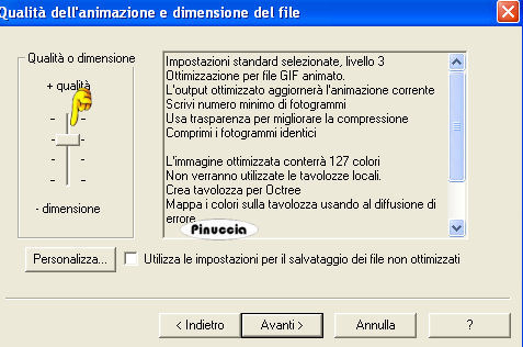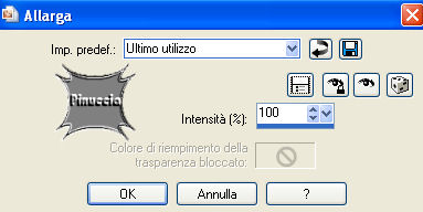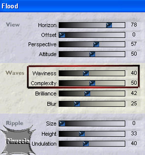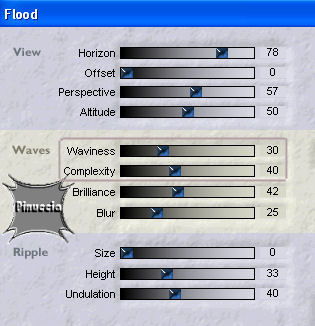 qui puoi trovare qualche risposta ai tuoi dubbi. Se l'argomento che ti interessa non è presente, ti prego di segnalarmelo. Materiale qui I bei tubes usati in questo tutorial sono di Filly e Manon. Filtro Flaming Pear - Flood qui Imposta il colore di primo piano con #01414D, e il colore di sfondo con #53D0D2. 1. Apri l'immagine Blauwe grot. Questa sarà la tua area di lavoro. 2. Apri il tube della donna. Immagine>Rifletti. 3. Modifica>Copia. Torna al tuo lavoro e vai a Modifica>Incolla>Incolla come nuovo livello. Posiziona la donna proprio sopra le pietre, come mostrato nella schermata sotto.![]() 4. Apri il tube con l'uomo e vai a Modifica>Copia. Torna al tuo lavoro e vai a Modifica>Incolla>Incolla come nuovo livello. Posizionalo in alto a destra.![]() 5. Livelli>Unisci>Unisci tutto. 6. Duplica l'immagine con Shift+D e rinomina questa copia "Immagine 2". Metti da parte la copia e vai all'immagine n. 1. 7. Effetti>Plugins>Flaming Pear - Flood, con i seguenti settaggi: ![]() 8. Vai all'immagine 2. Effetti>Plugins>Flaming Pear - Flood, con i settaggi precedenti, cambiano soltanto i valori di waviness a 30, e complexity a 40. ![]() 9. Torna nuovamente all'immagine 1. 10. Immagine>Aggiungi bordatura, 1 pixel, simmetriche, con il colore di sfondo. Immagine>Aggiungi bordatura, 2 pixels, simmetriche, con il colore di primo piano. Immagine>Aggiungi bordatura, 1 pixel, simmetriche, con il colore di sfondo. per aggiungere velocemente i bordi con i colori impostati come colore di sfondo e di primo piano, vedi qui 11. Immagine>Aggiungi bordatura, 15 pixels, simmetriche, con il colore di primo piano. Seleziona il bordo con la bacchetta magica ![]() 12. Effetti>effetti 3D>Smusso a incasso, con i seguenti settaggi. ![]() 13. Selezione>Nessuna selezione. 14. Immagine>Aggiungi bordatura, 1 pixel, simmetriche, con il colore di sfondo. Immagine>Aggiungi bordatura, 2 pixels, simmetriche, con il colore di primo piano. Immagine>Aggiungi bordatura, 1 pixel, simmetriche, con il colore di sfondo. Immagine>Aggiungi bordatura, 2 pixels, simmetriche, con il colore di primo piano. Immagine>Aggiungi bordatura, 1 pixel, simmetriche, con il colore di sfondo. 15. Selezione>Seleziona tutto. Selezione>modifica>Contrai, di 7 pixels. Selezione>Inverti. 16. Effetti>effetti 3D>Smusso a incasso, con i seguenti settaggi. ![]() Selezione>Nessuna selezione. 17. Immagine>Aggiungi bordatura, 7 pixels, simmetriche, con il colore di primo piano. Seleziona il bordo con la bacchetta magica ![]() 18. Effetti>Effetti di distorsione>Allarga, intensità 100. ![]() Selezione>nessuna selezione. 19. Immagine>Aggiungi bordatura, 1 pixel, simmetriche, con il colore di sfondo. 20. Apri il tube con l'angolo. Regola>Saturazione e tonalità>Viraggio: ![]() 21. Modifica>Copia. Torna al tuo lavoro e vai a Modifica>Incolla>Incolla come nuovo livello. Spostalo nell'angolo in alto a sinistra contro il bordo interno.22. Effetti>effetti 3D>Sfalsa ombra, con i seguenti settaggi: ![]() 23. Livelli>Duplica. Immagine>Rifletti. Livelli>Duplica. Immagine>Capovolgi. Livelli>Duplica. Immagine>Rifletti. 24. Livelli>Unisci>Unisci tutto. L'immagine è finita. 25. Duplica questa immagine con shift+D e chiamala Immagine 2. 26. Selezione>Seleziona tutto. Selezione>Modifica>Contrai, di 34 pixels, e premi sulla tastiera il tasto CANC ![]() Adesso hai soltanto la cornice. Mantieni selezionato. 27. Vai all'Immagine 2, e Modifica>Copia. Torna all'immagine con soltanto la cornice e vai a Modifica>Incolla>Incolla nella selezione. 28. Selezione>Nessuna selezione. Livelli>Unisci>Unisci tutto. 29. Copia questo immagine: Modifica>Copia. Riprendi l'Immagine 1 e vai a Modifica>Incolla>Incolla come nuovo livello. (adesso hai due livelli entrambi completi). ![]() 30. Immagine>Ridimensiona, a 650 pixels di larghezza, mantieni proporzioni e tutti i livelli selezionato. ![]() 31. Salva in formato PSP per Animation Shop. ![]() 32. Apri Animation Shop e apri l'immagine che hai appena salvato. 33. Modifica>Seleziona tutto. Animazione>Proprietà fotogramma e imposta la velocità a 25. ![]() 34. Salva in formato gif con la seguente impostazione: ![]() L'immagine è finita. Se vuoi realizzare lo script, ti occorrono anche due immagini di sfondo. indicazioni per creare le due immagini di sfondo (naturalmente, puoi variare come preferisci). Per lo sfondo: Apri una nuova immagine 400x50 pixels e riempila con il gradiente,creato con i colori del tutorial, angolo 90, ripetizioni 1. Effetti>Plugins>Filters Unlimited - Paper Texture - Canvas fine, 87,87. Salva in formato jpg e nomina il file sfondo1. Sfondo per i bordi: Apri una nuova immagine 50x400 pixel e riempila con il gradiente angolo 0, ripetizioni 1.Effetti>Plugins>Filters Unlimited - Paper Texture - Canvas fine, con i settaggi precedenti. Abbassa l'opacità al 50%. Livelli>Unisci>Unisci tutto. salva in formato jpg e nomina il file sfondo2. Per eseguire lo script Apri lo script di Jeannette che trovi qui, e segui i preliminari descritti alla fine di questo tutorial, fino all'inserimento dello sfondo-suono. Dopo aver inserito lo sfondo-suono, dovrai indicare allo script dove trovare le immagini. Clicca su Origine e identifica i punti di inserimento dei vari elementi dello script. Se hai messo tutti i file in una cartella, il percorso del suono ti servirà da guida per l'inserimento degli altri files: ti basterà cambiare l'ultima parte: il nome e l'estensione. Nella schermata sotto sono indicati i punti in cui dovrai inserire, tra le virgolette, il percorso delle due immagini di sfondo. 1. Qui inserisci l'immagine di sfondo, che hai salvato come sfondo1. 2. Qui inserisci l'immagine per i bordi e per la striscia del testo, che hai salvato come sfondo2. ![]() Nella schermata sotto è indicato il punto in cui dovrai inserire, tra le virgolette, il percorso dell'immagine principale. ![]() Ricorda che, contemporaneamente, puoi controllare il risultato andando su Anteprima. fai molta attenzione alle estensioni dei files e alle maiuscole-minuscole, 