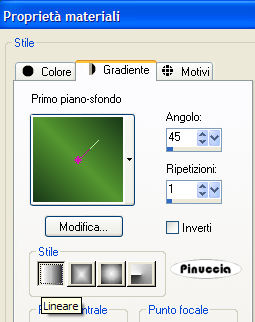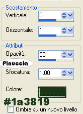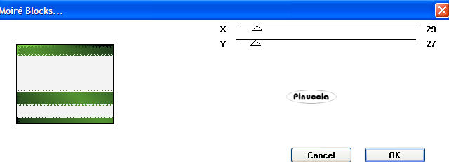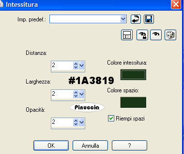 qui puoi trovare qualche risposta ai tuoi dubbi. Se l'argomento che ti interessa non è presente, ti prego di segnalarmelo. Questo tutorial è stato scritto con PSP 9, ma può essere eseguito anche con le altre versioni di PSP. Materiale qui Filtro: Filter Factory Gallery F qui I filtri Factory Gallery, prima di essere usati, devono essere convertiti. Come fare vedi qui 1. Apri una nuova immagine trasparente 550 x 450 pixels. Imposta il colore di primo piano con il colore scuro #1a3819 e il colore di sfondo con il colore chiaro #559830. Passa il colore di primo piano a Gradiente di primo piano/sfondo, lineare, con i seguenti settaggi: ![]() Riempi l'immagine con il gradiente.Imposta il colore di primo piano con il bianco. (se usi un altro tube, scegli da questo un colore chiaro). Rimani su questo livello. Selezione>Carica/Salva selezione>Carica selezione da disco: cerca e carica la selezione GerdaS43: ![]() Riempi la selezione con il bianco.Selezione>Nessuna selezione. Effetti>Plugins>FM Tile Tools - Blend Emboss, con i settaggi standard: ![]() Effetti>Plugins>Filter Factory F - Moire Blocks: ![]() 2. Sempre su questo livello: Selezione>Carica/Salva selezione>Carica selezione da disco: cerca e carica la selezione GerdaS46. ![]() Effetti>Effetti di trama>Intessitura, con i seguenti settaggi, e con il colore scuro. ![]() Selezione>Nessuna selezione. Livelli>Nuovo livello raster. Selezione>Carica/Salva selezione>Carica selezione da disco: cerca e carica la selezione GerdaS44: ![]() Riempi la selezione con il colore verde scuro (#1a3819).Selezione>Modifica>Contrai, di 1 pixel. Riempi la selezione con il bianco.Selezione>Nessuna selezione. 3. Attiva il livello inferiore. Apri il tube bennafleck001-sdh. Immagine>Ridimensiona, a 450 pixels di altezza, ricampionamento bicubica. ![]() Modifica>Copia. Torna al tuo lavoro e vai a Modifica>Incolla>Incolla come nuovo livello. Spostalo a destra.Attiva nuovamente il livello inferiore. Livelli>Nuovo livello raster. Selezione>Carica/Salva selezione>Carica selezione da disco: cerca e carica la selezione GerdaS47. ![]() Riempi la selezione con il colore verde scuro (#1a3819).Chiudi eventualmente il livello del tube, per vedere meglio i quadretti. Selezione>Nessuna selezione. Riapri il livello del tube. 4. Metti da parte per il momento il tuo lavoro. Apri una nuova immagine trasparente 200 x 200 pixels. Riempi l'immagine con il bianco.Attiva nuovamente il tube e vai a Modifica>Copia (se tutto è andato bene dovresti averlo ancora in memoria, nel dubbio, copialo nuovamente). Torna alla nuova immagine 200x200 e vai a Modifica>Incolla>Incolla come nuovo livello. Sposta il tube in modo che rimanga soltanto la testa:![]() Livelli>Unisci>Unisci tutto. Immagine>Aggiungi bordatura, simmetriche non selezionato: ![]() Immagine>Ridimensiona, al 90%, bicubica. Ripeti Immagine>Ridimensiona, al 90%. Livelli>Nuovo livello raster. Imposta il colore di primo piano con il colore scuro (#1a3819). Attiva lo strumento Pennello ![]() cerca e seleziona il pennello gerdatekst191, dimensione 85. Applica il pennello sulla parte bianca. Livelli>Unisci>Unisci tutto. 5. Copia questa piccola immagine: Modifica>Copia. Attiva il lavoro che hai messo da parte prima e posizionati sul livello del tube. Modifica>Incolla>Incolla come nuovo livello e sposta la piccola immagine a sinistra.![]() Effetti>Effetti 3D>Sfalsa ombra, con i seguenti settaggi, colore nero: ![]() Livelli>Duplica. Livelli>Disponi>Sposta giù. Immagine>Ruota>Ruota per gradi, 10 gradi a sinistra. ![]() Livelli>Unisci>Unisci tutto. Imposta il colore di sfondo con il bianco. Attiva lo strumento Testo ,seleziona un font - io ho scelto Qwigley, crea come vettore - e scrivi il tuo nome. Livelli>Converti in livello raster. Effetti>Effetti 3D>Sfalsa ombra, con i seguenti settaggi, e con il colore verde scuro (#1a3819). ![]() Livelli>Unisci>Unisci tutto, e salva in formato jpg. ![]() ![]() Se hai problemi o dubbi, o trovi un link non funzionante, o anche soltanto per un saluto, scrivimi 24 Febbraio 2007 |