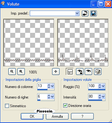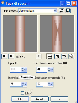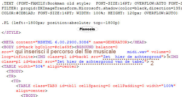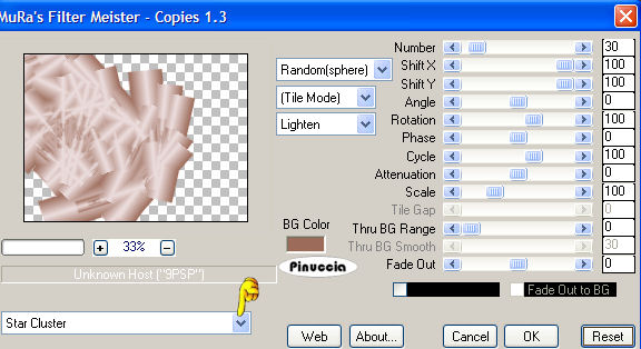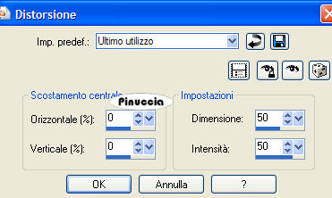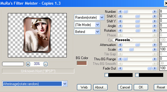 qui puoi trovare qualche risposta ai tuoi dubbi. Se l'argomento che ti interessa non è presente, ti prego di segnalarmelo. Occorrente: Materiale qui Il tube usato per questo tutorial è di Suzi Sgai. Filtri: Greg's Factory Output II qui Mura's Meister qui Texture qui Imposta il colore di primo piano con #EDDFDF, e il colore di sfondo con #9C6B5A. Passa il colore di primo piano a Gradiente di primo piano/sfondo, con i seguenti settaggi: ![]() 1. Apri il tube della donna e cancella il livello del watermark. 2. Livelli>Nuovo livello raster. Riempi il nuovo livello con il gradiente.Nella paletta dei livelli porta in alto il livello del tube. 3. Livelli>Unisci>Unisci visibile. 4. Selezione>Seleziona tutto. Selezione>Modifica>Contrai, di 15 pixels. 5. Selezione>Inverti. Premi sulla tastiera il tasto canc ![]() 6. Livelli>Nuovo livello raster. Riempi con il colore di sfondo.Per riempire con il colore di sfondo, devi cliccare con il tasto destro del mouse. 7. Effetti>Plugins>Greg's Factory Output - Poolshadow, con i settaggi standard. ![]() 8. Selezione>Nessuna selezione. Livelli>Unisci>Unisci tutto. 9. Immagine>Ridimensiona a 350 pixels di altezza, tutti i livelli selezionato. Regola>Messa a fuoco>Metti a fuoco. Metti da parte l'immagine per il momento. 10. Imposta il gradiente con i seguenti settaggi ![]() 11. Apri una nuova immagine trasparente 600 x 450 pixels, e riempila con il gradiente.12. Effetti>Effetti di distorsione>Distorsione: ![]() 13. Effetti>Effetti di bordo>Aumenta di più, 2 volte. 14. Imposta il gradiente con i settaggi usati all'inizio del tutorial: ![]() 15. Attiva lo strumento Selezione , rettangolo,e traccia un rettangolo, come mostrato nell'esempio: ![]() 16. Livelli>Nuovo livello raster. Riempi con il gradiente.17. Effetti>Effetti di riflesso>Fuga di specchi: il tutorial originale non indica i settaggi, io ho scelto questi: ![]() Selezione>Nessuna selezione: 18. Livelli>Duplica e togli la visibilità a questo livello. 19. Attiva, nella paletta dei livelli, il livello centrale. 20. Effetti>Plugins>Mura's Meister - Copies, con i seguenti settaggi: ![]() 21. Riporta la visibilità al livello superiore e sposta il rettangolo a destra.![]() 22. Nella paletta dei livelli abbassa l'opacità dei due livelli superiori al 50%. 23. Livelli>Unisci>Unisci visibile. 24. Effetti>Plugins>Texture - Texturizer- Sandstone: ![]() 25. Apri il tube con i fiori. Immagine>Rifletti. 26. Modifica>Copia. Torna al tuo lavoro e vai a Modifica>Incolla>Incolla come nuovo livello. Sposta il tube a sinistra.Abbassa l'opacità di questo livello al 35%. 29. Attiva l'immagine che hai minimizzato al passo 9 e vai a Modifica>Copia. Torna all'immagine più grande e vai a Modifica>Incolla>Incolla come nuovo livello. 30. Effetti>Effetti 3D>Sfalsa ombra: ![]() 31. Effetti>Plugins>Mura's Meister - Copies: ![]() Rotate random, significa rotazione casuale, pertanto il tuo risultato potrebbe apparire diverso dal mio esempio. Se il risultato non ti soddisfa, puoi sempre andare a Modifica>Annulla azione Copies, e ripetere il passaggio. 32. Apri il tube nls_chique_elemento7. Regola>Saturazione e tonalità>Viraggio: ![]() 33. Modifica>Copia. Torna al tuo lavoro e vai a Modifica>Incolla>Incolla come nuovo livello. Sposta il tube a destra.34. Effetti>Effetti 3D>Sfalsa ombra: ![]() 35. Apri il tube strikje e vai a Modifica>Copia. Torna al tuo lavoro e vai a Modifica>Incolla>Incolla come nuovo livello. Effetti>effetti 3D>Sfalsa ombra, con i settaggi precedenti. 36. Apri il tube di testo e vai a Modifica>Copia. Torna al tuo lavoro e vai a Modifica>Incolla>Incolla come nuovo livello. Sposta il testo a sinistra.37. Effetti>Effetti 3D>Sfalsa ombra: ![]() 38. Se necessario, puoi ancora spostare i tubes per sistemarli meglio. Livelli>Unisci>Unisci visibile. 39. Attiva lo strumento Penna , stile linea punto, dimensione 3 pixels.![]() 40. Traccia una linea da sinistra a destra a circa mezzo centimetro dal bordo inferiore. 41. Effetti>Effetti 3D>Sfalsa ombra, con i seguenti settaggi, due volte: ![]() 42. Effetti>Effetti di distorsione>Volute: ![]() 43. Regola>Messa a fuoco>Metti a fuoco, 2 volte. 43. Verscherpen 2x, afbeelding omdraaien, en schuif naar beneden. 44. Livelli>Unisci>Unisci tutto. 45. Immagine>Aggiungi bordatura, 1 pixel, simmetriche, con il colore di primo piano. Immagine>Aggiungi bordatura, 8 pixels, simmetriche, con il colore di sfondo. Immagine>Aggiungi bordatura, 1 pixel, simmetriche, con il colore di primo piano. 46. Seleziona il bordo da 8 pixels con la bacchetta magica ![]() 47. Effetti>Plugins>Greg's Factory - Poolshadow, con i settaggi standard. Selezione>Nessuna selezione. L'immagine è finita. Se vuoi realizzare lo script di Jeannette, ti servono anche 2 immagini di sfondo. Indicazioni per gli sfondi: Questo è quello che ho fatto io. Naturalmente, puoi scegliere di creare altri sfondi, o cambiare le impostazioni come preferisci. Per il primo sfondo apri un'immagine 150x150 e riempila con il colore di primo piano e applica un effetto trama a scelta. Per il secondo sfondo apri una immagine 50x150 pixels e riempila con il secondo gradiente usato nel tutorial (angolo 0, ripetizioni 1). Applica un effetto trama. Io ho applicato: Effetti>Plugins>Filters Unlimited - paper textures - Canvas fine 87, 87. Salva in formato jpg come sfondo 2. Per eseguire lo script Apri lo script di Jeannette che trovi qui, e segui i preliminari descritti alla fine di questo tutorial, fino all'inserimento dello sfondo-suono. Dopo aver inserito lo sfondo-suono, dovrai indicare allo script dove trovare le immagini. Clicca su Origine e identifica i punti di inserimento dei vari elementi dello script. Se hai messo tutti i file in una cartella, il percorso del suono ti servirà da guida per l'inserimento degli altri files: ti basterà cambiare l'ultima parte: il nome e l'estensione. Nella schermata sotto sono indicati i punti in cui dovrai inserire, tra le virgolette, il percorso delle due immagini di sfondo, e dell'immagine che hai duplic