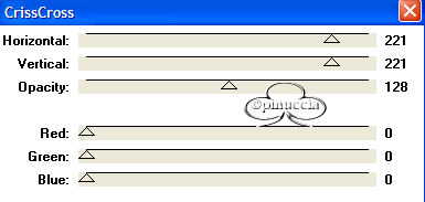 qui puoi trovare qualche risposta ai tuoi dubbi. Se l'argomento che ti interessa non č presente, ti prego di segnalarmelo. Occorrente: Materiale qui Filtro Tormentia qui Apri i tubes in PSP. Apri una nuova immagine trasparente 700x 500 pixels e riempila con il nero (#000000).Attiva il tube SnowingOnTheCity e vai a Modifica>Copia. Torna al tuo lavoro e vai a Modifica>Incolla>Incolla come nuovo livello. Spostalo un po' in su e a destra.Attiva il tube SnakeBand e vai a Modifica>copia. Torna al tuo lavoro e vai a Modifica>Incolla>Incolla come nuovo livello. Spostalo in basso vicino al bordo.Attiva Decos337 e posizionati sul livello "cream". Modifica>Copia. Ritorna al tuo lavoro e vai a Modifica>Incolla>Incolla come nuovo livello. Spostalo nell'angolo in alto a sinistra.Attiva il file di testo Merry Christmas e vai a Modifica>Copia. Torna al tuo lavoro e vai a Modifica>Incolla>Incolla come nuovo livello. Spostalo a sinistra, sopra la striscia.Controlla se tutto č a posto. Se necessario, puoi ancora spostare un po' gli elementi della tua tag, per sistemarli meglio. Livelli>Unisci>Unisci tutto. Immagine>Aggiungi bordatura, 3 pixels, simmetriche, con il colore della striscia (#d29f55). Immagine>Aggiungi bordatura, 15 pixels, simmetriche, con il colore bianco. Seleziona il bordo bianco con la bacchetta magica ![]() Attiva nuovamente il tube SnowingOnTheCity. Con lo strumento Selezione , rettangolo, seleziona una porzione del tube, come mostrato nell'esempio.![]() Modifica>Copia. Torna al tuo lavoro e vai a Modifica>Incolla>Incolla nella selezione. Effetti>Plugins>Tormentia - CrissCross, con i settagi standard: ![]() Selezione>Inverti. Effetti>Effetti 3D>Sfalsa ombra, con i seguenti settaggi, colore nero: ![]() Ripeti l'Effetto Sfalsa ombra, ma cambiando verticale e orizzontale a -2. Selezione>Nessuna selezione. Immagine>Aggiungi bordatura, 3 pixels, simmetriche, con il colore #d29f55. Aggiungi il tuo nome o il tuo watermark e, se vuoi, ridimensiona la tag. Io ho usato il font SnapITC, dimensione 48. ![]() Copia l'immagine: Modifica>Copia. Apri Animation Shop e vai a Modifica>Incolla>Incolla come nuova animazione. (puoi anche cliccare con il tasto destro del mouse su un punto vuoto di As e ti apparirā la scritta da cliccare: Incolla come nuova animazione). ![]() Modifica>Duplica, e ripeti finchč non avrai un'animazione composta da 4 fotogrammi. Clicca sul primo fotogramma per selezionarlo. Modifica>Seleziona tutto. 12. Apri la gif fornita con il materiale del tutorial: "Silver". Clicca sul primo fotogramma per selezionarlo. Modifica>Seleziona tutto. Modifica>Copia. Ritorna al tuo lavoro e vai a Modifica>Incolla>Incolla nel fotogramma selezionato. Posiziona l'animazione e, quando hai trovato la posizione corretta, rilascia il tasto del mouse. Se non sei soddisfatto, puoi sempre tornare indietro con Modifica>Annulla incolla, e ripetere l'operazione. Per controllare il risultato clicca su Visualizza ![]() 13. Riduci l'animazione (Animazione>Ridimensiona animazione, a 600 pixels di larghezza) e salva in formato gif. ![]() Se hai problemi o dubbi, o trovi un link non funzionante, o anche soltanto per un saluto, scrivimi. Novembre 2006 |