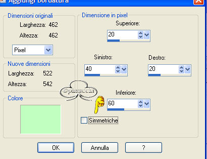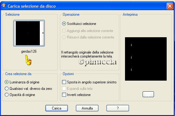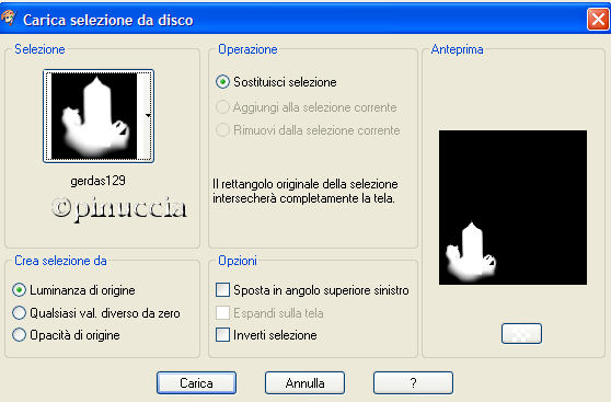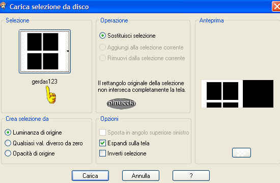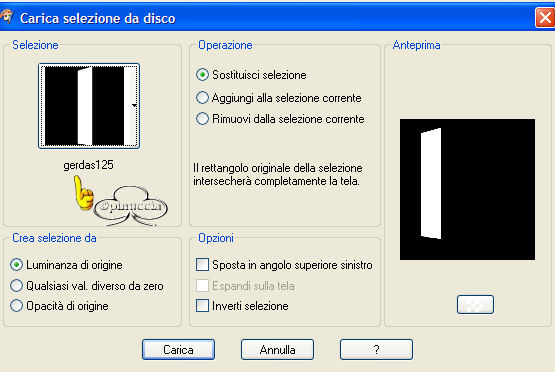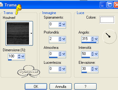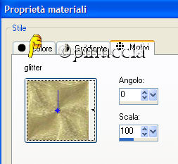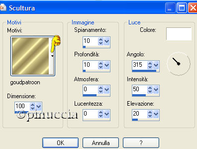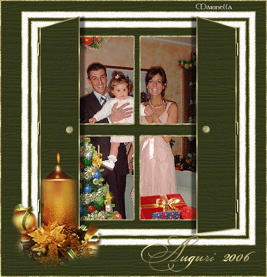 qui puoi trovare qualche risposta ai tuoi dubbi. Se l'argomento che ti interessa non è presente, ti prego di segnalarmelo. Questo tutorial è stato creato in PSP 9, ma può essere eseguito anche con le altre versioni di PSP. Occorrente: Materiale qui Filtro Eye Candy 4000 qui Metti le selezioni nella cartella Selezioni di PSP. 1. Apri una nuova immagine trasparente 400 x 400 pixels e riempila con il colore bianco (#ffffff).Livelli>Nuovo livello raster. Imposta il colore di primo piano su Motivi. Apri il menu cliccando sulla freccia indicata dalla manina e seleziona il motivo oro Glitter. ![]() Selezione>Carica/Salva selezione>Carica selezione da disco. Cerca e carica la selezione gerdas123. ![]() Riempi la selezione con il motivo glitter oro.Selezione>Modifica>Contrai, di 2 pixels e riempi con il colore #353a1c.Effetti>Effetti di Trama>Trama Cerca e seleziona il Motivo "Houtnerf", con i seguenti settaggi: ![]() Selezione>Nessuna selezione. 2. Attiva lo strumento Bacchetta magica , modalità Aggiungi, tolleranza 0,e seleziona i quattro spazi delle finestre. Selezione>Modifica>Espandi, di 1 pixel. Livelli>Nuovo livello raster. Mantieni selezionato. Riempi la selezione con il Motivo glitter oro.Selezione>Modifica>Contrai di 1 pixel. Premi sulla tastiera il tasto CANC. Apri l'immagine afb56 (naturalmente puoi usare anche tua immagine o una tua fotografia) e vai a Modifica>Copia. Torna al tuo lavoro e vai a Modifica>Incolla>Incolla come nuovo livello. Adesso l'immagine è incollata sopra la selezione. Con lo strumento Spostamento sposta l'immagine,per adattarla alle finestre, facendo in modo che i visi rimangano ben visibili. ![]() Selezione>Inverti. Premi sulla tastiera il tasto CANC. Livelli>Unisci>Unisci tutto. 3. Immagine>Aggiungi bordatura, 10 pixels, simmetriche, con un colore qualsiasi, purchè non sia presente nell'immagine. Seleziona il bordo con la bacchetta magica ![]() e riempilo con il colore bianco.Regola>Aggiungi/rimuovi disturbo>Aggiungi disturbo: ![]() Selezione>Nessuna selezione. Immagine>Aggiungi bordatura, 2 pixels, simmetriche, con un colore qualsiasi. Seleziona il bordo con la bacchetta magica ![]() e riempilo con il Motivo glitter oro.Selezione>Nessuna selezione. Immagine>Aggiungi bordatura, 5 pixels, simmetriche, con il colore verde (#353a1c). Immagine>Aggiungi bordatura, 2 pixels, simmetriche, con un colore qualsiasi. Seleziona il bordo con la bacchetta magica ![]() e riempilo con il Motivo glitter oro.Selezione>Nessuna selezione. Immagine>Aggiungi bordatura, 10 pixels, simmetriche, con un colore qualsiasi, purchè non sia presente nell'immagine. Seleziona il bordo con la bacchetta magica ![]() e riempilo con il colore bianco.Regola>Aggiungi/rimuovi disturbo>Aggiungi disturbo, con i settaggi precedenti. Selezione>Nessuna selezione. Immagine>Aggiungi bordatura, 2 pixels, simmetriche, con un colore qualsiasi. Seleziona il bordo con la bacchetta magica ![]() e riempilo con il Motivo glitter oro.Selezione>Nessuna selezione. Immagine>Aggiungi bordatura, con un colore qualsiasi, simmetriche non selezionato: ![]() Seleziona il bordo con la bacchetta magica ![]() e riempilo con il colore verde #353a1c. Effetti>Effetti di Trama>Trama, con la stessa trama (houtnerf) e i settaggi del passo 1. Immagine>Aggiungi bordatura, 2 pixels, simmetriche, con un colore qualsiasi. Seleziona il bordo con la bacchetta magica ![]() e riempilo con il Motivo glitter oro.Selezione>Nessuna selezione. 4. Livelli>Nuovo livello raster. Il colore di primo piano sempre impostato sul Motivo glitter oro. Selezione>Carica/Salva selezione>Carica selezione da disco: cerca e carica la selezione gerdas125. ![]() Riempi la selezione con il Motivo glitter oro.Selezione>Modifica>Contrai, di 2 pixels. Riempi con il colore verde (#353a1c).Effetti>Effetti di Trama>Trama, con la stessa trama e i settaggi precedenti. Selezione>Nessuna selezione. Effetti>Effetti 3D>Sfalsa ombra, con i seguenti settaggi, colore nero: ![]() Livelli>Nuovo livello raster. Selezione>Carica/Salva selezione>Carica selezione da disco: Cerca e carica la selezione gerdas126. ![]() Riempi la selezione con il bianco.Effetti>effetti di trama>Scultura, con i seguenti settaggi: apri il menu cliccando sulla freccetta indicata dalla manina gialla, e cerca il Motivo "Goudpatroon": ![]() Selezione>Nessuna selezione. 5. Apri il tube Gerda126 e vai a Modifica>Copia. Torna al tuo lavoro e vai a Modifica>Incolla>Incolla come nuovo livello e posizionalo sulla finestra,vedi l'esempio della tag finale. Chiudi il livello inferiore e posizionati su uno degli altri livelli. ![]() Livelli>Unisci>Unisci visibile. Attiva il livello inferiore e posizionati sul livello superiore. Livelli>Duplica. Immagine>Rifletti. Sposta la finestra in modo che le cerniere siano correttamente posizionate:![]() Aggiungi il tuo nome all'immagine. Io ho scelto il font BichkamScriptFancy2, impostando il colore di sfondo con il Motivo oro. Effetti>Effetti 3D>Sfalsa ombra, con i seguenti settaggi, colore nero. ![]() Livelli>Unisci>Unisci tutto. 6. Livelli>Nuovo livello raster. Selezione>Carica/salva selezione>Carica selezione da disco: Cerca e carica la selezione gerdas129: ![]() Apri il tube Marja080 e vai a Modifica>Copia. Torna al tuo lavoro e vai a Modifica>Incolla>Incolla nella selezione. Selezione>Nessuna selezione. Sullo stesso livello: Selezione>Carica/Salva selezione>Carica selezione da disco: cerca e carica la selezione gerdas130 ![]() Effetti>Plugins>Eye Candy 4000 / Fire, con i seguenti settaggi: ![]() Selezione>Nessuna selezione. Modifica>Copia Unione. Apri Animation Shop e vai a Modifica>Incolla>Incolla come nuova animazione. Torna in PSP. Modifica>Annulla Nessuna selezione Modifica>Annulla Fire. Effetti>Plugins>Eye Candy - Fire, con gli stessi settaggi, ma cambiando il valore di Random Seed con 327. Selezione>Nessuna Selezione. Modifica>Copia unione. Ritorna in Animation Shop e vai a Modifica>Incolla>Incolla dopo il fotogramma selezionato. Ancora in PSP. Modifica>Annulla Nes