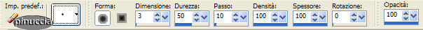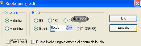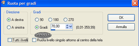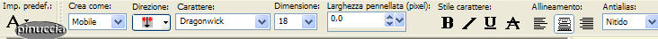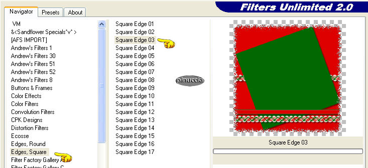 qui puoi trovare qualche risposta ai tuoi dubbi. Se l'argomento che ti interessa non è presente, ti prego di segnalarmelo. Materiale qui 1. Apri tutti i tubes. Duplicali (shift+D) e chiudi gli originali. 2. Attiva lo sfondo rosso "back_rouge". Sarà la tua area di lavoro. Attiva lo sfondo verde "back_vert" e vai a Modifica>Copia. Torna al tuo lavoro e vai a Modifica>Incolla come nuovo livello. 3. Immagine>Ruota per gradi: ![]() 4. Effetti>Effetti 3D>Sfalsa ombra: ![]() 5. Attiva il tube "JF_RB_01". Immagine>Ridimensiona, al 15%, tutti i livelli non selezionato. Non preoccuparti se il risultato ti sembrerà troppo piccolo. Vai avanti. Modifica>Copia. Torna al tuo lavoro e vai a Modifica>Incolla come nuovo livello. Effetti>Effetti 3D>Sfalsa ombra, con i settaggi del passo 4. 6. Livell>Disponi>Sposta giù. 7. Livelli>Duplica. Livelli>Disponi>Porta in alto. Con lo strumento Spostamento spostalo in basso.Dovresti avere questo: ![]() 8. Attiva il tube "JF_RB_04". Immagine>Ridimensiona, al 15% (tutti i livelli non selezionato). Modifica>Copia. Torna al tuo lavoro e vai a Modifica>Incolla come nuovo livello. Effetti>Effetti 3D>Sfalsa ombra, con i settaggi del passo 4. Spostalo verso il basso.Dovresti avere questo: ![]() Livelli>Unisci>Unisci visibile. 9. Effetti>Plugins>Filters Unlimited 2 / Edges,Squares / Square Edge 03. ![]() Livelli>Unisci>Unisci tutto (Appiattisci). 10. Attiva il tube "klskissanta" e vai a Modifica>Copia. Torna al tuo lavoro e vai a Modifica>Incolla come nuovo livello. Effetti>Effetti 3D>Sfalsa ombra, con i settaggi del passo 4. Posizionalo correttamente (vedi l'esempio finale).11. Attiva il tube " JF_Els_01". Immagine>Ridimensiona, al 20% (tutti i livelli non selezionato). Modifica>Copia. Torna al tuo lavoro e vai a Modifica>Incolla come nuovo livello. Effetti>Effetti 3D>Sfalsa ombra, con i settaggi del passo 4. Spostalo a sinistra dello scrap.(vedi l'esempio finale). 12. Chiudi il colore di primo piano, imposta il colore bianco - #ffffff - come colore di sfondo. Attiva lo strumento Testo , seleziona il font "DragonWick",dimensione 18, pennellata 0 e scrivi il tuo nome: ![]() 13. Mantieni la selezione attiva. Immagine>Ruota per gradi: ![]() 14. Sposta il testo dentro la targhetta.Selezione>Nessuna selezione. 15. Attiva il tube "JF_EIS_02". Attiva lo strumento Selezione , rettangolo,e contorna l'elemento bianco. Modifica>Copia. Torna al tuo lavoro e vai a Modifica>Incolla come nuovo livello. Immagine>Ridimensiona, al 15%, tutti i livelli non selezionato. 16. Effetti>Effetti 3D>Sfalsa ombra, con i settaggi del passo 4. Livelli>Duplica. Posizionati sul livello originale. Immagine>Ruota per gradi: ![]() Spostalo in alto a sinistra dello scrap.Vedi l'esempio finale. 17. Posizionati sul livello superiore (la copia dell'elemento). Immagine>Ruota per gradi: ![]() Spostalo in alto a destra dello scrap.Vedi l'esempio finale. 18. Attiva il tube "JF_EI_01" e vai a Modifica>Copia. Torna al tuo lavoro e vai a Modifica>Incolla come nuovo livello. Immagine>Ridimensiona, al 20%, tutti i livelli non selezionato. Effetti>Effetti 3D>Sfalsa ombra, con i settaggi del passo 4. Spostalo in basso a sinistra dello scrap.vedi l'esempio finale. 19. Attiva il tube "JF_EI_02" e vai a Modifica>Copia. Torna al tuo lavoro e vai a Modifica>Incolla come nuovo livello. Immagine>Ridimensiona, al 15%, tutti i livelli non selezionato. Effetti>Effetti 3D>sfalsa ombra, con i settaggi del passo 4. Spostalo in basso a destra dello scrap.Vedi l'esempio finale. 20. Attiva il tube "JF_EI_04" e vai a Modifica>Copia. Torna al tuo lavoro e vai a Modifica>Incolla come nuovo livello. Immagine>Ridimensiona, al 20%, tutti i livelli non selezionato. Spostalo in alto a sinistra.Vedi l'esempio finale. Attiva lo strumento Puntatore ![]() (se stai usando PSP 9 è lo strumento Deformazione )e applica una leggera rotazione a sinistra. 21. Attiva lo strumento Gomma con i seguenti settaggi:![]() 22. Cancella la parte che deve trovarsi dietro, vedi la schermata sotto: ![]() 23. Livelli>Nuovo livello raster. 24. Nella paletta dei colori, il colore di primo piano è chiuso e il colore di sfondo è sempre bianco. Attiva lo strumento Testo , font Horsesshoes and Limonade,dimensione 30, pennellata 0, scrivi "Buon" ![]() Selezione>Nessuna selezione. 25. Nella paletta dei livelli abbassa l'opacità di questo livello al 77%. 26. Livelli>Nuovo livello raster. 27. Scrivi "Natale". Selezione>Nessuna selezione. Abbassa l'opacità del livello al 77%. 29. Posiziona il testo a tuo piacimento. Livelli>Unisci>Unisci tutto (appiattisci). 30. Regola>Messa a fuoco>Metti a fuoco. ![]() Se hai problemi o dubbi, o trovi un link non funzionante, o anche soltanto per un saluto, scrivimi. Dicembre 2006 |