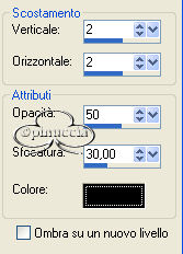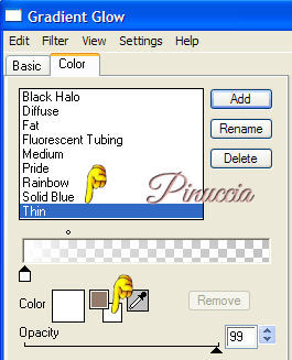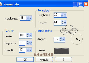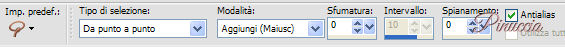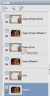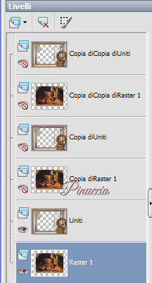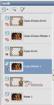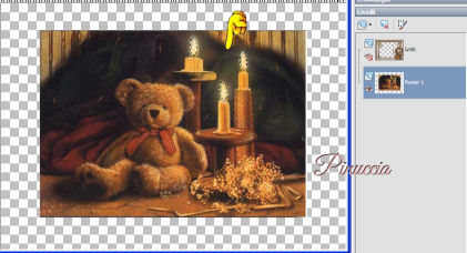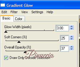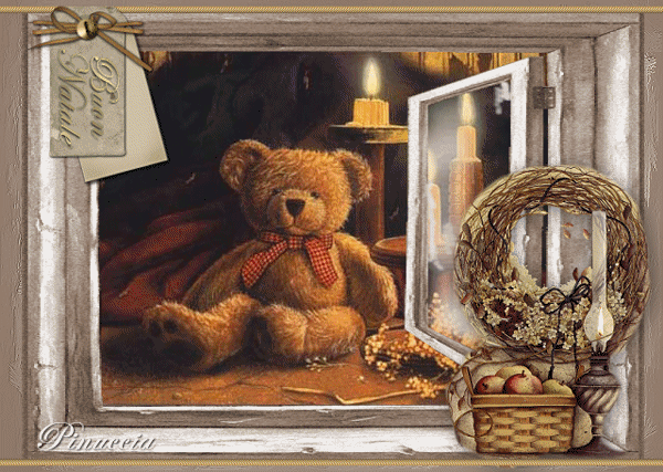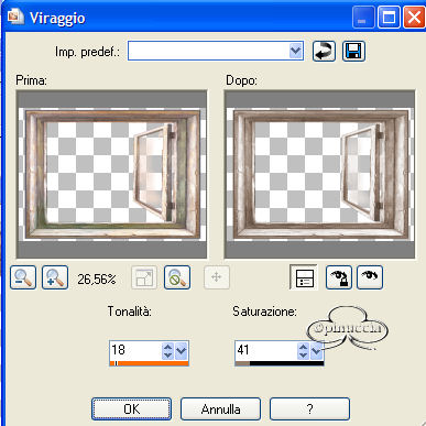 1. Apri il tube "Fenster". Immagine>Ridimensiona, a 640x445 pixels. ![]() Questa sarà l'immagine sulla quale lavorerai. Regola>Saturazione e Tonalità>Viraggio: ![]() 2. Seleziona il bordo trasparente superiore con la bacchetta magica ![]() e riempilo con il colore #927b6b.Mantieni selezionato. 3. Effetti>Effetti tecniche di disegno>Pennellate: ![]() Selezione>Nessuna selezione. 4. Apri il tube "jcw_the_oil_lamp". Immagine>Ridimensiona del 70%. Modifica>Copia. Ritorna al tuo lavoro e vai a Modifica>Incolla>Incolla come nuovo livello. Spostalo a destra sul davanzale:Effetti>Effetti 3D>Sfalsa ombra, con i seguenti settaggi: ![]() 5. Apri il tube "Scraptube_01" e vai a Modifica>Copia. Torna al tuo lavoro e vai a Modifica>Incolla>Incolla come nuovo livello. Spostalo sopra la finestra.Livelli>Duplica. Immagine>Capovolgi. 6. Apri il tube "Scraptube_02" e vai a Modifica>Copia. Torna al tuo lavoro e vai a Modifica>Incolla>Incolla come nuovo livello. Spostalo in alto a sinistra.Immagine>Ruota>ruota per gradi, 15 gradi a sinistra. Regola>Messa a fuoco>Maschera di contrasto: ![]() Effetti>Effetti 3D>Sfalsa ombra, con i seguenti settaggi: ![]() 7. Apri il tube "scraptube_03" e vai a Modifica>Copia. Torna al tuo lavoro e vai a Modifica>Incolla>Incolla come nuovo livello. Spostalo sopra lo scraptube02.Effetti>Effetti 3D>Sfalsa ombra, con i settaggi usati al punto 6: ![]() 8. Apri il tube "scraptube_04" e vai a Modifica>Copia. Torna al tuo lavoro e vai a Modifica>Incolla>Incolla come nuovo livello. Spostalo in alto a sinistra.Effetti>Effetti 3D>Sfalsa ombra, con i settaggi usati al punto 6: ![]() 9. Apri il tube "scraptube_05", e vai a Modifica>Copia. Torna al tuo lavoro e vai a Modifica>Incolla>Incolla come nuovo livello. Immagine>Ruota>Ruota per gradi, 15 gradi a sinistra. Posizionalo sopra il nastrino.Effetti>effetti 3D>Sfalsa ombra, con i settaggi usati al punto 6: ![]() . 10. Aggiungi un testo sulla targhetta. 11. Livelli>Unisci>Unisci visibile. (Se vuoi usare questa immagine come template per lavori futuri, salvala in formato .psp). Minimizza l'immagine, per il momento. 12. Apri "tenderMoment" e vai a Modifica>Copia. Aggiungi il tuo nome o il tuo watermark. Livelli>Unisci>Unisci visibile. Modifica>Copia. Ritorna al tuo lavoro e vai a Modifica>Incolla>Incolla come nuovo livello. Livelli>Disponi>Sposta giù. Sistema l'immagine all'interno della finestra,in modo che non si veda lo sfondo trasparente: ![]() Con lo strumento Selezione a mano libera :![]() seleziona il contorno delle tre fiammelle (eventualmente, per una migliore visibilità, nascondi il livello uniti). ![]() Livelli>Duplica, 2 volte. Nascondi i due livelli superiori e posizionati sul primo. Imposta il bianco come colore di sfondo. Effetti>Plugins>Eye Candy 4 - Gradient Glow: Clicca sulla linguetta color e seleziona Thin. Clicca sul quadratino indicato dalla manina rossa per impostare il colore di sfondo. ![]() Clicca sulla linguetta Basic e imposta i seguenti settaggi: ![]() Nascondi il livello e attiva la prima copia. Ripeti l'Effetto Gradient Glow, cambiando il valore "width" a 4. Nascondi questo livello e attiva la seconda copia. Ripeti l'Effetto Gradient Glow, cambiando il valore "width" a 6. Selezione>Nessuna selezione. Attiva il livello della finestra (livello Uniti). Livelli>Duplica, 2 volte. Trascina i tre livelli "Uniti" sopra i tre livelli "TenderMoment". ![]() Nascondi tutti i livelli tranne i livelli Raster 1 e Uniti. ![]() Modifica>Copia Unione. Apri Animation Shop e vai a Modifica>Incolla>Incolla come nuova animazione. Ritorna in PSP. Nascondi tutti i livelli tranne i livelli Copia di Raster 1 e Copia di Uniti. ![]() Modifica>Copia Unione. In AS: Modifica>Incolla>Incolla dopo il fotogramma corrente. In PSP. Nascondi tutti i livelli tranne i livelli della seconda copia di Raster 1 e Uniti. ![]() Modifica>Copia Unione. In AS: Modifica>Incolla>Incolla dopo il fotogramma corrente. Adesso in As hai una animazione composta da tre fotogrammi. Posizionati sul primo fotogramma per selezionarlo. Modifica>Seleziona tutto. Apri la gif fornita con il materiale per il tutorial: "Kandle klein". Posizionati sul primo fotogramma per selezionarlo. Modifica>Seleziona tutto. Modifica>Copia. Ritorna al tuo lavoro e vai a Modifica>Incolla>Incolla nel fotogramma selezionato. Posiziona la gif sullo stoppino della lampada ad olio e, quando sei sicuro di aver trovato la posizione corretta, rilascia il tasto del mouse. ![]() Se non sei soddisfatto, puoi sempre annullare l'operazione andando a Modifica>Annulla Incolla, e ripetere. Per controllare il risultato, clicca su Visualizza ![]() Se vuoi, riduci l'animazione (Immagine>Ridimensiona) e salva in formato gif. ![]() Se hai problemi o dubbi, o trovi un link non funzionante, o anche soltanto per un saluto, scrivimi. Novembre 2006 |