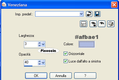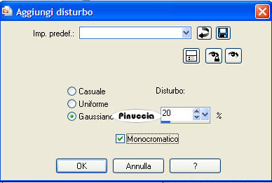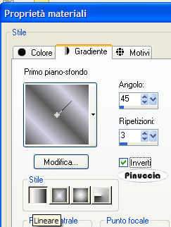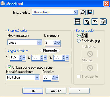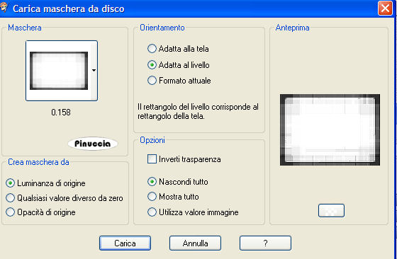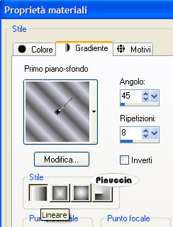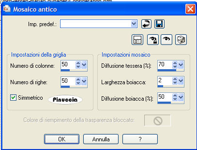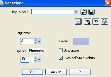 qui puoi trovare qualche risposta ai tuoi dubbi. Se l'argomento che ti interessa non è presente, ti prego di segnalarmelo. Questo tutorial è stato scritto con PSP 9, ma può essere eseguito anche con le altre versioni di PSP. Occorrente: Materiale qui I tubes che ho usato sono di Kaedee e Marcio C. Per favore, rispetta il lavoro degli autori e mantieni i tubes al loro stato originale. Filtri: Funhouse qui Xero qui 1. Apri una nuova immagine trasparente 640 x 460 pixels. Imposta il colore di primo piano con #d2d2e4, e il colore di sfondo con #5a5a5a. Passa il colore di primo piano a Gradiente di primo piano/sfondo: ![]() Riempi l'immagine trasparente con questo gradiente.Regola>Aggiungi/rimuovi disturbo>Aggiungi disturbo: ![]() Regola>Sfocatura>Sfocatura gaussiana, raggio 30. ![]() 2. Livelli>Nuovo livello raster. Selezione>Seleziona tutto. 3. Apri il tube "Kadee-pd-Scenery", e vai a Modifica>Copia. Torna al tuo lavoro e vai a Modifica>Incolla>Incolla nella selezione. Selezione>Nessuna selezione. Abbassa l'opacità di questo livello al 46%. 4. Livelli>Nuovo livello raster. Riempi il livello con il colore scuro di sfondo.per riempire con il colore di sfondo, devi cliccare con il tasto destro del mouse. Livelli>Carica/Salva maschera>Carica maschera da disco. Cerca e carica la maschera "0.158.jpg": ![]() 5. Livelli>Unisci>Unisci gruppo. Nella paletta dei livelli, sposta questo livello sotto il livello del paesaggio.![]() 6. Attiva il livello superiore. Apri il tube "mc2803", e vai a Modifica>Copia. Torna al tuo lavoro e vai a Modifica>Incolla>Incolla come nuovo livello. Immagine>Ridimensiona, al 92%, bicubica, tutti i livelli non selezionato. ![]() Sposta il tube in basso a destra.7. Attiva il livello raster 2 (il paesaggio), attiva lo strumento Gomma ,e "pulisci" il viso della donna dai segni dello sfondo. ![]() 8. Attiva nuovamente il livello superiore. Effetti>Plugins>FM Tile Tools - Blend Emboss, con i settaggi standard, 2 volte. ![]() Effetto>Plugins>Xero - Porcelain, con i settaggi standard: ![]() Effetti>Plugins>Xero - Porcelain, con i seguenti settaggi: ![]() 9. Livelli>Unisci>Unisci tutto. Immagine>Aggiungi brodatura, 1 pixel, simmetriche, con il colore #5a5a5a. Immagine>Aggiungi bordatura, 5 pixels, simmetriche, con il colore bianco. Seleziona il bordo bianco con la bacchetta magica ![]() (sfumatura e tolleranza 0, antialias e interno selezionati) Cambia i settaggi del gradiente: ![]() Riempi il bordo selezionato con il gradiente.Effetti>Effetti artistici>Mezzitoni: ![]() Selezione>Nessuna selezione. 10. Immagine>Aggiungi bordatura, 1 pixel, simmetriche, con il colore #5a5a5a. Immagine>Aggiungi bordatura, 30 pixels, simmetriche, con il colore nero. Seleziona il bordo con la bacchetta magica ![]() (sfumatura e tolleranza 0, antialias e interno selezionati). Effetti>Plugins>Funhouse - Polar Convergance: ![]() Regola>Sfocatura>Sfocatura gaussiana, raggio 30. ![]() 11. Effetti>Plugins>Xero - Fritillary: ![]() Effetti>Effetti 3D>Smusso a incasso: ![]() Selezione>Nessuna selezione. 12. Immagine>Aggiungi bordatura, 30 pixels, simmetriche, con il colore bianco. Seleziona il bordo con la bacchetta magica, con gli stessi settaggi, e riempilo con il colore scuro di sfondo.13. Effetti>Effetti di trama>Veneziana: ![]() Ripeti l'Effetto Veneziana, ma togliendo la spunta a Orizzontale. ![]() 14. Selezione>Seleziona tutto. Selezione>Modifica>Contrai, di 10 pixels. Selezione>Inverti. 15. Effetti>Effetti di trama>Mosaico antico: ![]() Effetti>Effetti 3D>Smusso a incasso, con i settaggi precedenti. 15. Regola>Luminosità e contrasto>Luminosità e contrasto: ![]() Selezione>Nessuna selezione. 17. Imposta il colore di sfondo con #d2d2e4. Attiva lo strumento Testo ![]() Io ho scelto il font "Fleurish SCript", con i seguenti settaggi. ![]() se stai usando PSP 9, dovrai regolare il settaggio della dimensione, perchè i pixels della versione 9 non corrispondono con PSP X. Su queste differenze, vedi alcuni appunti in fondo a questa pagina 18. Scrivi il tuo nome e posizionalo sulla tag. Livelli>Converti in livello raster. Effetti>Effetti 3D>Sfalsa ombra: ![]() Puoi cambiare la modalità di miscelatura di questo livello in Sovrapponi o Luminanza (esistente), vedi cosa ti sembra meglio. Non dimenticare il tuo nome e/o il tuo watermark. Salva il blend in formato jpg. ![]() ![]() Se hai problemi o dubbi, o trovi un link non funzionante, o anche soltanto per un saluto, scrivimi. 12 Giugno 2007 |