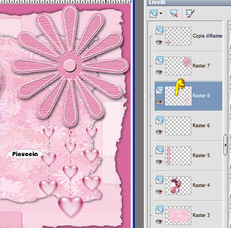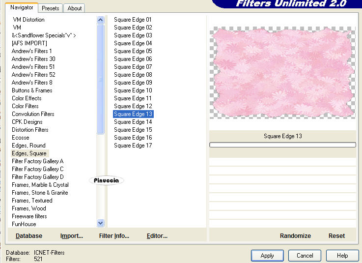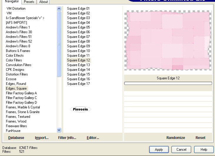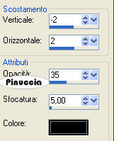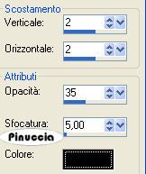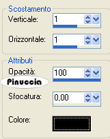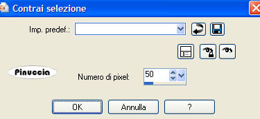 qui puoi trovare qualche risposta ai tuoi dubbi. Se l'argomento che ti interessa non è presente, ti prego di segnalarmelo. Occorrente: Materiale qui. Il bel tube è di Suzi Sgai Filtro: Filters Unlimited 2.0 qui Apri i tube in PSP e metti il pennello nella cartella dei pennelli. Apri una nuova immagine trasparemte 650 x 450 pixel. Riempi l'immagine con un colore preso dallo sfondo del tube.Io ho scelto #d8689d. Livelli>Nuovo livello raster. Selezione>Seleziona tutto. Apri il file di sfondo "PBlckBG_Holli_Greee" e vai a Modifica>Copia. (fai attenzione: sono due files con nomi simili, questo è lo sfondo a quadretti). Torna al tuo lavoro e vai a Modifica>Incolla>Incolla nella selezione. Selezione>Nessuna selezione. Effetti>Plugins>Filters Unlimited - Edges Square - Square edge 12: ![]() Effetti>Effetti 3D>Sfalsa ombra, con i seguenti settaggi, colore nero: ![]() Ripeti l'Effetto Sfalsa ombra, ma cambiando verticale e orizzontale a -2. Livelli>Nuovo livello raster. Selezione>Seleziona tutto. Selezione>Modifica>Contrai di 50 pixels. ![]() Apri il file di sfondo "LtPDDaisyBG_Holli-greer" (è lo sfondo a fiori) e vai a Modifica>Copia. Torna al tuo lavoro e vai a Modifica>Incolla>Incolla nella selezione. Mantieni selezionato. Effetti>Plugins>Filters Unlimited - Edges Square - Square edge 13: ![]() Selezione>Nessuna selezione. Effetti>Effetti 3D>Sfalsa ombra, con i seguenti settaggi, colore nero: Ripeti l'Effetto Sfalsa ombra, ma cambiando verticale e orizzontale a -2. ![]() Apri il tube SS_1604 e vai a Modifica>Copia. Torna al tuo lavoro e vai a Modifica>Incolla>Incolla come nuovo livello. Spostalo a sinistra.Apri il tube "Stchbrdr_Holli_Greer" (il nastro) e vai a Modifica>Copia. Torna al tuo lavoro e vai a Modifica>Incolla>Incolla come nuovo livello. Spostalo a sinistra.Effetti>effetti 3D>Sfalsa ombra, con i settaggi precedenti, e ripeti con verticale e orizzontale a -2. Apri il tube dell'anello "Grommet_Holli_Greer" e vai a Modifica>Copia. Torna al tuo lavoro e vai a Modifica>Incolla>Incolla come nuovo livello. Spostalo sul nastro in alto:![]() Apri il tube della margherita "StchDaisy_Holli_Greer" e vai a Modifica>Copia. Torna al tuo lavoro e vai a Modifica>Incolla>Incolla come nuovo livello. Spostalo in alto a destra.Livelli>Duplica. Immagine>Ridimensiona, all'85%, bicubica, tutti i livelli non selezionato. ![]() Ripeti, a tuo piacimento, finchè la margherita non sarà del formato che vorrai. Io ho ridimensionato, con la stessa percentuale, altre tre volte. Sposta la piccola margherita nell'angolo in basso a sinistra.Apri il tube dei cuori pendenti "Hanging%20Heart" e vai a Modifica>Copia. Torna al tuo lavoro e vai a Modifica>Incolla>Incolla come nuovo livello. Spostalo a destra.Livelli>Disponi>Sposta giù e ripeti. Il livello dei cuori adesso si trova sotto il livello della margherita più grande. ![]() Effetti>Effetti 3D>sfalsa ombra, con i seguenti settaggi, colore nero. ![]() Attiva lo strumento Pennello ![]() cerca e seleziona il pennello "lilbrokenangel_09", e applicalo con il colore scuro. qualche appunto sui pennelli lo trovi in questa pagina Livelli>Unisci>Unisci tutto. Immagine>Ruota>Ruota 90 gradi in senso orario. Se stai usando PSP X: Immagine>Ruota a destra. Attiva lo strumento Testo e scrivi il tuo nome.Io ho usato il font AmbianceBT, dimensione 72. sul settaggio delle dimensioni del testo vedi alcuni appunti in fondo a questa pagina Effetti>Effetti 3D>Sfalsa ombra, con i seguenti settaggi, colore nero. ![]() Immagine>Ruota>Ruota 90 gradi in senso antiorario. Se stai usando PsP X: Immagine>ruota a sinistra. Aggiungi il tuo watermark, eventualmente ridimensiona la tag, e salva in formato jpg. ![]() Se hai problemi o dubbi, o trovi un link non funzionante, o anche soltanto per un saluto, scrivimi. 18 Febbraio 2007 |