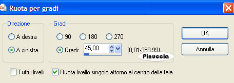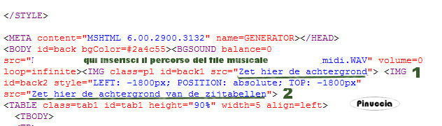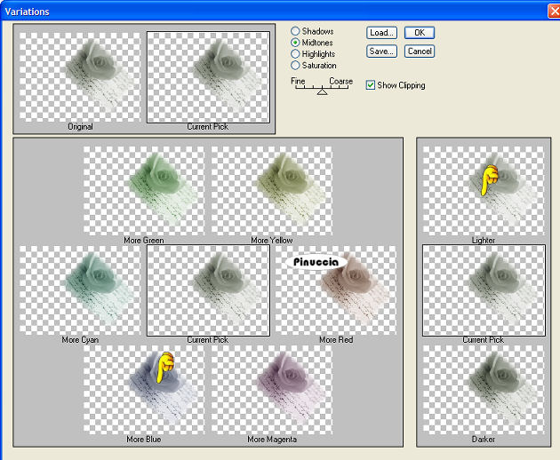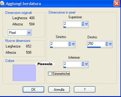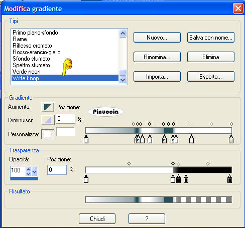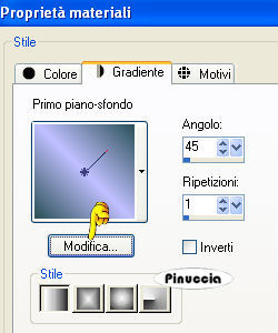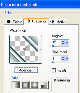 qui puoi trovare qualche risposta ai tuoi dubbi. Se l'argomento che ti interessa non è presente, ti prego di segnalarmelo. Occorrente: Materiale qui I bei tubes usati per questo tutorial sono di Suzi Sgai e Marif. Filtro Adjust Variations qui Imposta il colore di primo piano con #2A5057, e il colore di sfondo con #C0C0FF. 1. Apri il tube della donna. Duplicalo due volte con shift+D. Chiudi l'originale e metti da parte una copia. Continua sull'altra copia. Elimina il livello del watermark. 2. Livelli>Nuovo livello raster. Riempi il nuovo livello con il colore di primo piano.3. Passa il colore di primo piano a Gradiente: clicca su Modifica: ![]() E seleziona Witte knop. ![]() ![]() se non hai questo gradiente, clicca qui 4. Riempi con il gradiente (sul livello verde).5. Effetti>Effetti di bordo>Aumenta di più. 6. Nella paletta dei livelli sposta il livello della donna in alto. 7. Livelli>Unisci>Unisci tutto. 8. Immagine>Ridimensiona, a 500 pixels di altezza. 9. Immagine>Aggiungi bordatura, 2 pixels, simmetriche, con il colore di primo piano. 10. Immagine>Aggiungi bordatura, simmetriche non selezionato con il colore di sfondo. ![]() 11. Seleziona il bordo con la bacchetta magica ![]() 12. Livelli>Nuovo livello raster. Riempi con il colore di primo piano.13. Riempi con il gradiente.14. Effetti>Effetti di bordo>Aumenta di più. 16. Immagine>Inverti. 17. Selezione>Innalza selezione a livello. 18. Selezione>Nessuna selezione. 19. Livelli>Disponi>Sposta giù. 20. Attiva il livello superiore. Seleziona con la bacchetta magica la parte verde.![]() Premi sulla tastiera il tasto canc .Selezione>Nessuna selezione. 21. Attiva la seconda copia del tube della donna. Elimina il livello del watermark. Immagine>Ridimensiona, a 200 pixels di altezza. Immagine>Rifletti. Modifica>Copia. Torna al tuo lavoro e vai a Modifica>Incolla>Incolla come nuovo livello. Sposta il tube a destra.![]() con lo strumento Gomma , se vuoi, cancella con attenzione la parte indicata dalla manina21. Apri il tube con la rosa e il testo (SS1883). Cancella il livello del watermark. 22. Regola>Saturazione e tonalità>Viraggio: ![]() 23. Immagine>Ruota per gradi>90 gradi in senso orario. se stai usando PSP X: Immagine>Ruota a destra. 24. Modifica>Copia. Torna al tuo lavoro e vai a Modifica>Incolla>Incolla come nuovo livello. 25. Immagine>Ruota>Ruota per gradi, 45 gradi a sinistra: ![]() 26. Effetti>Plugins>Adjust - More Blue e Lighter: ![]() 27. Abbassa l'opacità di questo livello intorno all'80%, e spostalo nell'angolo in alto a destra. 28. Attiva lo strumento Gomma , e cancella la parte del testo che è rimasta sulla parte sinistra:![]() 29. Apri il tube delle rose SS_1744. Elimina il livello del watermark. Immagine>Rifletti. 30. Regola>Saturazione e tonalità>Viraggio: ![]() 31. Immagine>Ridimensiona, a 200 pixels di larghezza. 32. Effetti>Plugins>Adjust - Variation, con i settaggi precedenti. 33. Modifica>Copia. Torna al tuo lavoro e vai a Modifica>Incolla>Incolla come nuovo livello. Sposta la rosa in basso a sinistra.34. Abbassa l'opacità di questo livello al 78%. 35. Livelli>Unisci>Unisci tutto. 36. Immagine>Aggiungi bordatura, 2 pixels, simmetriche, con il colore di primo piano. per aggiungere velocemente bordi con i colori impostati nella paletta dei materiali, vedi qui Immagine>Aggiungi bordatura, 2 pixels, simmetriche, con il colore di sfondo. Immagine>Aggiungi bordatura, 2 pixels, simmetriche, con il colore di primo piano. L'immagine è finita. Se vuoi realizzare lo script di Jeannette, ti servono anche 2 immagini di sfondo. Indicazioni per gli sfondi: Questo è quello che ho fatto io. Naturalmente, puoi scegliere di creare altri sfondi, o cambiare le impostazioni come preferisci. Per il primo sfondo, apri il tube delle rose SS_1744, e applica il viraggio con i settaggi usati nel tutorial. Livelli>Nuovo livello raster, e riempi con il colore di sfondo. Abbassa l'opacità di questo livello all'80%. Livelli>Unisci>Unisci tutto. Effetti>Effetti di immagine>Motivo unico, con i settaggi standard. Effetti>Plugins>FM Tile Tools - Blend emboss, con i settaggi standard, 2 o 3 volte. Salva in formato jpg come sfondo1. Per il secondo sfondo, che servirà per le tabelle laterali, apri un'immagine trasparente 150x150. Riempila con il colore di primo piano e applica un effetto trama a tua scelta. Per eseguire lo script Apri lo script di Jeannette che trovi qui, e segui i preliminari descritti alla fine di questo tutorial, fino all'inserimento dello sfondo-suono. Dopo aver inserito lo sfondo-suono, dovrai indicare allo script dove trovare le immagini. Clicca su Origine e identifica i punti di inserimento dei vari elementi dello script. Se hai messo tutti i file in una cartella, il percorso del suono ti servirà da guida per l'inserimento degli altri files: ti basterà cambiare l'ultima parte: il nome e l'estensione. Nella schermata sotto sono indicati i punti in cui dovrai inserire, tra le virgolette, il percorso delle due immagini di sfondo, e dell'immagine che hai duplicato al punto 21 e ridotto a 300x300 pixels. 1. Qui inserisci il primo sfondo. 2. Qui inserisci il secondo sfondo che servirà per le tabelle. ![]() Nella schermata sotto è indicato il punto in cui dovrai inserire il percorso dell'immagine principale. ![]() Ricorda che, contemporaneamente, puoi controllare il risultato andando su Anteprima. fai molta attenzione alle estensioni dei files e alle maiuscole-minuscole, che devono essere corrette, altrimenti lo script non troverà le immagini da inserire Clicca adesso sulla linguetta Modifica, per aggiungere il testo. clicca due volte all'interno del riquadro. Apparirà la cornice che ti dà il via libera per sostituire il testo esistente e aggiungere il tuo. Quando hai finito, clicca all'esterno e la cornice sparirà. Il tuo messaggio con lo script è pronto per il tasto Invia. Se non vuoi spedirlo e vuoi soltanto tenerlo per te, vai a File>Salva con nome e mettilo in una cartella a tua scelta. Ricordati, però, che quando