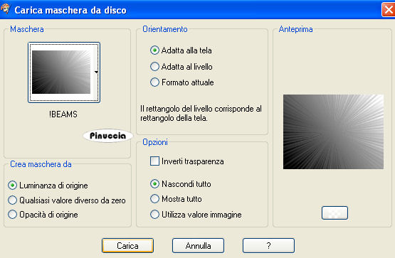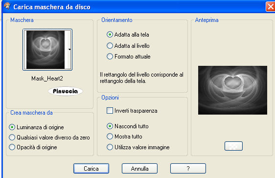 qui puoi trovare qualche risposta ai tuoi dubbi. Se l'argomento che ti interessa non è presente, ti prego di segnalarmelo. Occorrente: Materiale qui Il bel tube usato è di Mallu Brasil Metti le maschere nella cartella Maschere di PSP. Apri una nuova immagine trasparente 700 x 500 pixels. Imposta il colore di primo piano con il nero o con un colore scuro scelto dal tube. Imposta il colore di sfondo con un bel colore chiaro preso dal tube. Io ho scelto #8c9cb5. Riempi l'immagine trasparente con il colore di primo piano (nero).Livelli>Nuovo livello raster. Riempi questo livello con il colore di sfondo.per riempire con il colore di sfondo, devi cliccare con il tasto destro del mouse. Livelli>Carica/Salva maschera>Carica maschera da disco. Cerca e carica la maschera mask-heart2: ![]() Livelli>Unisci>Unisci gruppo. Apri il tube e vai a Modifica>Copia. Torna al tuo lavoro e vai a Modifica>Incolla>Incolla come nuovo livello. Sposta il tube a sinistra.Effetti>Effetti 3D>Sfalsa ombra, con i seguenti settaggi, colore nero: ![]() Apri il tube dare-leaves, e vai a Modifica>Copia. Torna al tuo lavoro e vai a Modifica>Incolla>Incolla come nuovo livello. Sposta questo tube a destra.Livelli>Unisci>Unisci tutto. Immagine>Aggiungi bordatura, 2 pixels, simmetriche, con il colore di sfondo. Immagine>Aggiungi bordatura, 50 pixels, simmetriche, con il colore di primo piano (nero). Seleziona questo bordo con la bacchetta magica ![]() ![]() Livelli>Nuovo livello raster. Riempi con il colore di sfondo.Mantieni selezionato. Livelli>Carica/Salva maschera>Carica maschera da disco. Cerca e carica la maschera !beams. ![]() Livelli>Unisci>Unisci gruppo. Selezione>Nessuna selezione. Apri il tube CJB Mix Accent. Posizionati sul livello dell'ornamento che preferisci (io ho scelto "zilveren schakel") e vai a Modifica>Copia. Torna al tuo lavoro e vai a Modifica>Incolla>Incolla come nuovo livello. Posizionalo a destra o a sinistra della tag.Livelli>Duplica. Immagine>Rifletti. Livelli>Unisci>Unisci tutto. Aggiungi il tuo nome e/o il tuo watermark. Naturalmente puoi anche aggiungere il testo che preferisci. Salva in formato jpg. Il tube dell'esempio sotto è di Patry. ![]() ![]() Se hai problemi o dubbi, o trovi un link non funzionante, o anche soltanto per un saluto, scrivimi. 17 Agosto 2007 |