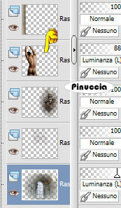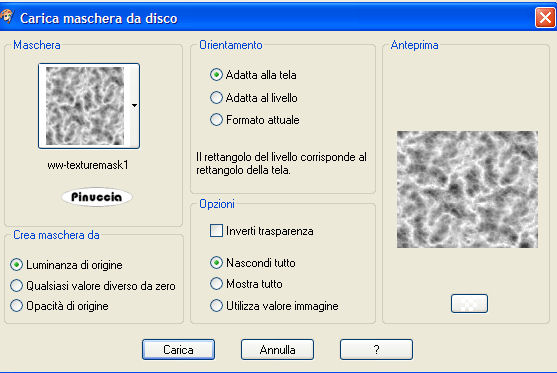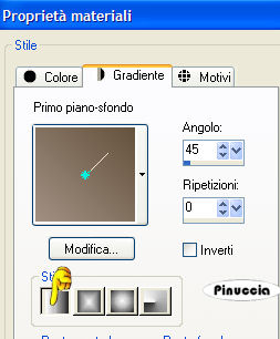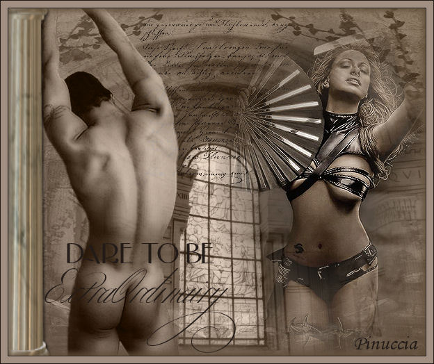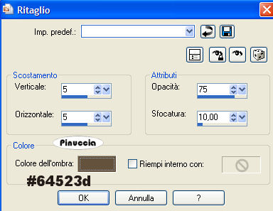 qui puoi trovare qualche risposta ai tuoi dubbi. Se l'argomento che ti interessa non è presente, ti prego di segnalarmelo. Materiale qui Metti la maschera nella cartella Maschere di PSP. Metti i pennelli nella cartella Pennelli di PSP. 1. Apri una nuova immagine trasparente 600 x 500 pixels. 2. Imposta il colore di primo piano con #a19082 e il colore di sfondo con #64523d. 3. Passa il colore di primo piano a Gradiente di primo piano/sfondo, con i seguenti settaggi: ![]() Riempi la tua immagine con il gradiente.4. Livelli>nuovo livello raster. Riempi il nuovo livello con il colore di sfondo.per riempire con il colore di sfondo, devi cliccare con il tasto destro del mouse. Liveli>Carica/salva maschera>Carica maschera da disco. Cerca e carica la maschera ww-texturemask1: ![]() Livelli>Elimina, e rispondi sì alla domanda Unire la maschera nel livello corrente? ![]() Livelli>Unisci>Unisci gruppo. 5. Selezione>Seleziona tutto. 6. Apri Angelbackground e vai a Modifica>Copia. Torna al tuo lavoro e vai a Modifica>Incolla>Incolla nella selezione. Abbassa l'opacità di questo livello al 50% e cambia la modalità di miscelatura in Luminanza (Esistente). 7. Selezione>Nessuna selezione. 8. Apri il tube Joland Misted Vieuw 029 e vai a Modifica>Copia. Torna al tuo lavoro e vai a Modifica>Incolla>Incolla come nuovo livello. Sposta il tube un po', in modo che la finestra si trovi al centro e in basso.![]() Cambia la modalità di miscelatura di questo livello in Luminanza (esistente) e abbassa l'opacità al 72%. 9. Apri il tube "Dare to be Woman" e vai a Modifica>Copia. Torna al tuo lavoro e vai a Modifica>Incolla>Incolla come nuovo livello. Spostalo a destra.Regola>Messa a fuoco>Metti a fuoco. 10. Apri il tube "Column 4" e vai a Modifica>Copia. Torna al tuo lavoro e vai a Modifica>Incolla>Incolla come nuovo livello. Con lo strumento Deformazione spostalo a sinistra,allungalo in altezza e a sinistra, in modo che sia visibile il pilastro. ![]() Effetti>Effetti 3D>Sfalsa ombra: ![]() 11. Apri il tube dell'uomo "Monique42_1074". Posizionati sul livello del tube e vai a Modifica>Copia. Torna al tuo lavoro e vai a Modifica>Incolla>Incolla come nuovo livello. Spostalo a sinistra, contro la colonna.Cambia la modalità di miscelatura di questo livello in Luminanza (esistente) e abbassa l'opacità all'88%. 12. Nella paletta dei livelli sposta il livello dell'uomo sotto il livello della colonna. ![]() Attiva il livello superiore (il tube della colonna). 13. Livelli>Nuovo livello raster. Imposta il colore di sfondo con #231b18. Attiva lo strumento Pennello ![]() cerca e seleziona il pennello Dozi's-oldtext-06-brush, e applicalo tra l'uomo e la donna cliccando con il tasto destro del mouse, per usare il colore di sfondo. Nella paletta dei livelli sposta questo livello sotto il livello del tube della donna. (il livello del testo adesso si trovare sotto i due tube). ![]() 14. Livelli>Unisci>Unisci tutto. 15. Cerca e seleziona adesso il pennello Dare to be e applicalo sull'immagine, sempre con il tasto destro del mouse per usare il colore di sfondo, (vedi il mio esempio). 16. Aggiungi il tuo nome o il tuo watermark. 17. Selezione>Seleziona tutto. Effetti>Effetti 3D>Ritaglio: ![]() Ripeti l'Effetto Ritaglio, ma cambiando verticale e orizzontale a -5. 18. Selezione>Nessuna selezione. 19. Immagine>Aggiungi bordatura, 1 pixel, simmetriche, con il colore #231b18. Immagine>Aggiungi bordatura, 10 pixels, simmetriche, con il colore #a19082. Immagine>Aggiungi bordatura, 1 pixel, simmetriche, con il colore #231b18. ![]() Se hai problemi o dubbi, o trovi un link non funzionante, o anche soltanto per un saluto, scrivimi 5 Maggio 2007 |