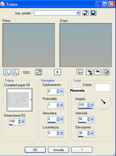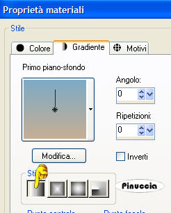 qui puoi trovare qualche risposta ai tuoi dubbi. Se l'argomento che ti interessa non è presente, ti prego di segnalarmelo. Materiale qui Metti la trama nella cartella Trame. Metti il pennello nella cartella Pennelli. Apri i tubes in PSP. Apri una nuova immagine trasparente 700 x 450 pixels. Imposta il colore di primo piano con #c5ae94, e il colore di sfondo con #7daac4. Passa il colore di primo piano a Gradiente di primo piano/sfondo, con i seguenti settaggi. (il colore blu deve trovarsi sopra). ![]() Riempi l'immagine con questo gradiente.Effetti>Effetti di trama>Trama. Apri il menu cliccando sulla freccia a fianco del box e seleziona la trama crumpled paper 04. ![]() Attiva il tube delle gambe (1191dwtubes) e vai a Modifica>Copia. Torna al tuo lavoro e vai a Modifica>Incolla>Incolla come nuovo livello. Spostalo in alto a destra.Lascia in basso lo spazio sufficiente per il pennello e il nome (vedi l'esempio finale). Attiva il tube della finestra (GTB window scene KMG) e vai a Modifica>Copia. Torna al tuo lavoro e vai a Modifica>Incolla>Incolla come nuovo livello. Sposta la finestra a sinistra,la parte più bassa della finestra deve trovarsi alla stessa altezza dell'ultimo gradino della scala. Attiva il tube del gabbiano (1150dwtubes) e vai a Modifica>Copia. Torna al tuo lavoro e vai a Modifica>Incolla>Incolla come nuovo livello. Spostalo al centro dei due tubes.Allinea anche qui la parte inferiore agli altri tubes. Effetti>Effetti 3D>Sfalsa ombra, con i seguenti settaggi, colore nero: ![]() Attiva il tube delle conchiglie (GTB Shells on a Line KMG) e vai a Modifica>Copia. Torna al tuo lavoro e vai a Modifica>Incolla>Incolla come nuovo livello. Spostalo a sinistra, vedi l'esempio finale.Effetti>Effetti 3D>Sfalsa ombra, con i settaggi precedenti. Attiva lo strumento Pennello .Cerca e seleziona il pennello agibrush91 footprints, dimensione 150, e applicalo con il colore nero in basso a destra. Aggiungi il tuo nome, usando le lettere dell'alfabeto che hai trovato nello zip. Livelli>Unisci>Unisci tutto. Aggiungi il tuo watermark e salva in formato jpg. ![]() Se hai problemi o dubbi, o trovi un link non funzionante, o anche soltanto per un saluto, scrivimi. 7 Aprile 2007 |