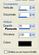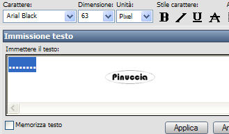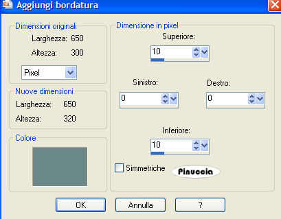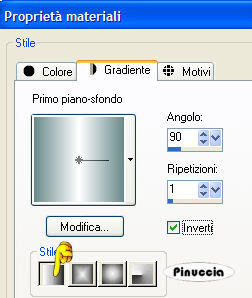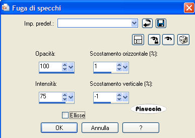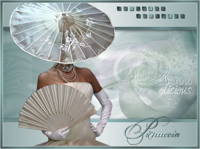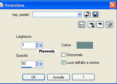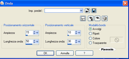qui puoi trovare qualche risposta ai tuoi dubbi. Se l'argomento che ti interessa non è presente, ti prego di segnalarmelo. Materiale qui I bei tubes usati per questo tutorial sono di Marif, MarieL e Yoka. Non aprire l'animazione waaier-animatie in PSP, perchè questa ti servirà per lo script, se vorrai realizzarlo. Greg's Factory Output II qui Imposta il colore di primo piano con #FFFFFF, e il colore di sfondo con #6A8A89. Passa il colore di primo piano a Gradiente di primo piano/sfondo, con i seguenti settaggi: ![]() 1, Apri una nuova immagine trasparente 650 x 300 pixels, e riempila con il gradiente.2. Livelli>Duplica. 3. Effetti>effetti di riflesso>Fuga di specchi, con i seguenti settaggi: ![]() 4. Livelli>Duplica. 5. Effetti>Effetti di deformazione>Onda, con i seguenti settaggi. ![]() 6. Ripeti l'Effetto Onda. ![]() 7. Nella paletta dei livelli abbassa l'opacità dei due livelli superiori al 30%. ![]() Livelli>Unisci>Unisci visibile. 8. Immagine>Aggiungi bordatura, simmetriche non selezionato, con il colore di sfondo. ![]() 9. Seleziona il bordo con la bacchetta magica , tenendo premuto il tasto shift.impostando la bacchetta in modalità aggiungi, non è necessario tenere premuto il tasto shift. 10. Livelli>Nuovo livello raster. Riempi entrambi i bordi con il colore di sfondo.per riempire con il colore di sfondo, clicca con il tasto destro del mouse. per riempire più selezioni con un solo clic, imposta lo strumento riempimento in modalità di corrispondenza "Nessuno". 11. Effetti>Plugins>Greg's Factory - Poolshadow, con i seguenti settaggi: ![]() 12. Effetti>Effetti 3D>Sfalsa ombra, con i seguenti settaggi: ![]() 13. Immagine>Aggiungi bordatura, simmetriche non selezionato, con il colore bianco. ![]() 14. Seleziona entrambi i bordi con la bacchetta magica , tenendo premuto il tasto shift.15. Livelli>nuovo livello raster. Riempi entrambi i bordi con il gradiente.16. Effetti>Effetti di trama>Veneziana, con i seguenti settaggi, con il colore di sfondo. ![]() 17. Nella paletta dei livelli abbassa l'opacità di questo livello al 72%. Livelli>Unisci>Unisci visibile. 18. Apri il file "Voorbeeld-tekening" e vai a Modifica>Copia. Torna al tuo lavoro e vai a Modifica>Incolla>Incolla come nuovo livello. ti sembrerà strano vedere questo disegno sullo sfondo bianco. Non preoccuparti. Ti servirà soltanto da guida, poi potrai cancellarlo. 19. Apri il tube della donna e vai a Modifica>Copia. Torna al tuo lavoro e vai a Modifica>Incolla>Incolla come nuovo livello. Abbassa l'opacità del livello al 35%. Posiziona esattamente il tube facendolo combaciare con la sagoma del disegno,adattando l'immagine al bordo nero. ![]() 20. Quando il tube è correttamente posizionato, riporta l'opacità del livello al 100%, quindi elimina il livello "Voorbeeld-tekening". Avrai questo: ![]() 21. Apri il tube del fiore ed elimina il livello del watermark. 22. Immagine>Ridimensiona, a 310 pixels di altezza. Immagine>Rifletti. 23. Modifica>Copia. Ritorna al tuo lavoro e vai a Modifica>Incolla>Incolla come nuovo livello. Posiziona completamente a destra, contro il bordo.24. Nella paletta dei livelli sposta questo livello al centro e abbassa l'opacità al 32%. ![]() Livelli>Unisci>Unisci visibile. 25. Apri il tube di testo "delicious-tekst" e vai a Modifica>Copia. Torna al tuo lavoro e vai a Modifica>Incolla>Incolla come nuovo livello. Sposta il testo a destra.26. Livelli>Unisci>Unisci visibile. 27. Attiva lo strumento Testo , font Arial Black, crea come mobile, dimensione 48 (settaggio per PSP 9),e digita 8 volte un punto. i settaggi della dimensione cambiano dalla versione PSP 9 alla versione PSP X. Su questo argomento vedi alla fine di questa pagina qui Se stai usando PSP X, più o meno il settaggio corrisponde a 63 pixels. ![]() 28. Livelli>Innalza selezione a livello. 29. Effetti>Plugins>Greg's Factory - Poolshadow, con i settaggi standard. ![]() 30. Effetti>effetti 3D>Sfalsa ombra, con i seguenti settaggi: ![]() 31. Livelli>Duplica. 32. Sposta i blocchi sul bordo superiore, come nel mio esempio.33. Selezione>Nessuna selezione. Livelli>Unisci>Unisci visibile. 34. Attiva nuovamente lo strumento Testo , seleziona il font BickhamScriptFancy2, dimensione 48,e scrivi il tuo nome. 35. Ripeti i punti 29 e 30. 36. Immagine>Aggiungi bordatura, 1 pixel, simmetriche, con il colore bianco. Immagine>Aggiungi bordatura, 8 pixels, simmetriche, con il colore di sfondo. Immagine>Aggiungi bordatura, 1 pixel, simmetriche, con il colore bianco. 37. Seleziona il bordo verde da 8 pixels con la bacchetta magica .Effetti>Plugins>Greg's Factory output 2 - Poolshadow, con i seguenti settaggi: ![]() Selezione>Nessuna selezione. L'immagine è finita. Se vuoi realizzare lo script, ti occorrono, oltre all'immagine principale, tre immagini di sfondo (se vuoi usare le mie clicca qui) e l'animazione del ventaglio (waaier) fornita con il materiale. Per eseguire lo script Apri lo script di Jeannette che trovi qui, e segui i preliminari descritti alla fine di questo tutorial, fino all'inserimento dello sfondo-suono. Dopo aver inserito lo sfondo-suono, dovrai indicare allo script dove trovare le immagini. Clicca su Origine e identifica i punti di inserimento dei vari elementi dello script. Se hai messo tutti i file in una cartella, il percorso del suono ti servirà da guida per l'inserimento degli altri files: ti basterà cambiare l'ultima parte: il nome e l'estensione. Nella schermata sotto sono indicati i punti in cui dovrai inserire il percorso dei tuoi files. 1. qui inserisci, tra le virgolette il percorso dello sfondo a tinta unita. 2. qui inserisci il percorso dello sfondo a gradiente. 3. qui inserisci il percorso dello sfondo argento. ![]() Nella schermata sotto sono indicati i punti in cui dovrai inserire l'immagine principale e l'animazione del ventaglio. 1. Qui inserisci il percorso dell'immagine principale. 2. Qui inserisci il percorso dell'animazione. ![]() Ricorda che, contemporaneamente, puoi controllare il risultato andando su Anteprim