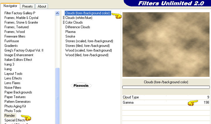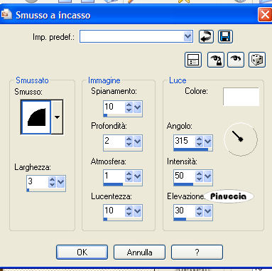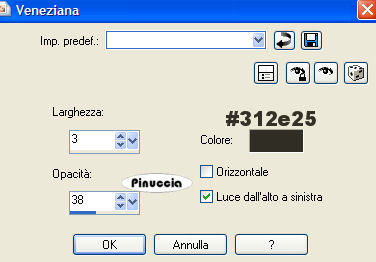 qui puoi trovare qualche risposta ai tuoi dubbi. Se l'argomento che ti interessa non è presente, ti prego di segnalarmelo. Questo tutorial è stato scritto con PSP 9, ma può essere eseguito anche con le altre versioni di PSP. Per tradurlo, l'ho eseguito con PSP X. Occorrente: Materiale qui I tubes che ho usato sono di JBL e di Suzi Sgai. Per favore, rispettate il loro lavoro e manteneteli al loro stato originale. Filtri: Filters Unlimited 2 qui FM Tile Tools qui Simple qui Xero qui Graphics Plus qui 1. Apri una nuova immagine trasparente 640 x 480 pixels. Imposta il colore di primo piano con #dfba86 e il colore di sfondo con #343025. Riempi l'immagine trasparente con il colore di primo piano.Effetti>Plugins>Filters Unlimted 2 - Render, con i seguenti settaggi: ![]() 2. Apri il tube "JBL_121906_Pier" e vai a Modifica>Copia. Torna al tuo lavoro e vai a Modifica>Incolla>Incolla come nuovo livello. Spostalo in basso.![]() 3. Livelli>Nuovo livello raster. Selezione>Seleziona tutto. 4. Apri il tube "JBL_122006_MoonOverlake" e vai a Modifica>Copia. Torna al tuo lavoro e vai a Modifica>Incolla>Incolla nella selezione. Sposta il tube un po' più in alto.![]() Cambia la modalità di miscelatura di questo livello in Luminanza (esistente) e abbassa l'opacità al 34%. Effetti>Plugins>FM Tile Tools - Blend Emboss, con i settaggi standard. ![]() Selezione>Nessuna selezione. 5. Apri il tube "SS_1557_Misted" e vai a Modifica>Copia. Torna al tuo lavoro e vai a Modifica>Incolla>Incolla come nuovo livello. Immagine>Ridimensiona, all'80%, tutti i livelli non selezionato. Sposta questo tube a sinistra, sopra il pontile.![]() 6. Livelli>Unisci>Unisci tutto. Effetti>Plugins>Xero - Porcelain: ![]() 7. Livelli>Nuovo livello raster. Selezione>Seleziona tutto. 8. Effetti>Effetti 3D>Ritaglio, con i seguenti settaggi, colore #3e2c1e ![]() Ripeti l'Effetto Ritaglio, ma cambiando verticale e orizzontale a -3, Livelli>Unisci>Unisci tutto. Copia l'immagine con Shift+D e mettila da parte. 9. Immagine>Aggiungi bordatura, 1 pixel, simmetriche, con il colore 343025. Immagine>Aggiungi bordatura, 7 pixels, simmetriche, con il colore bianco. Seleziona il bordo con a bacchetta magica ,sfumatura e tolleranza 0, antialias e interno selezionati. Passa il colore di primo piano a Gradiente di primo piano/sfondo, con i seguenti settaggi: ![]() Riempi la selezione con il gradiente.Effetti>Plugins>Graphics Plus - Cross Shadow, con i settaggi standard. ![]() Selezione>Nessuna selezione. Immagine>Aggiungi bordatura, 1 pixel, simmetriche, con il colore #343025. 10. Immagine>Aggiungi bordatura, 37 pixels, simmetriche, con il colore bianco. Seleziona il bordo con la bacchetta magica .sfumatura e tolleranza 0, antialias e interno selezionati. Attiva il duplicato dell'immagine che hai messo da parte e vai a Modifica>Copia. Torna al tuo lavoro e vai a Modifica>Incolla>Incolla nella selezione. Regola>Sfocatura>Sfocatura gaussiana, raggio 30. ![]() 11. Effetti>Effetti di trama>Veneziana: ![]() Ripeti l'Effetto Veneziana, ma togliendo la spunta a Orizzontale: ![]() 12. Effetti>Effetti 3D>Smusso a incasso: ![]() 13. Selezione>Seleziona tutto. Livelli>Nuovo livello raster. Selezione>Modifica>Contrai, di 15 pixels. Riempi la selezione con il gradiente.Selezione>Modifica>Contrai, di 7 pixels. Premi sulla tastiera il tasto CANC. ![]() Selezione>Nessuna selezione. 14. Effetti>Plugins>Graphics Plus - Cross Shadow, con i settaggi standard. Effetti>Effetti 3D>Smusso a incasso: ![]() 15. Apri il tube "D-Corner" e vai a Modifica>Copia. Torna al tuo lavoro e vai a Modifica>Incolla>Incolla come nuovo livello. Spostalo in alto a sinistra, vedi il mio esempio.Effetti>Effetti 3D>Sfalsa ombra: ![]() Effetti>Plugins>Simple - Top Left Mirror. 16. Imposta il colore di sfondo con #e9d3a5 e chiudi il colore di primo piano. Attiva lo strumento Testo ![]() Io ho usato il font "GE Amazonia Script" con questi settaggi: ![]() La dimensione del font dipenderà dalla versione di PSP che stai usando. I settaggi di PSP 9 non corrispondono a quelli di PSP X. Alcuni appunti sulla differenza tra le due versioni in fondo a questa pagina Scrivi il testo. Livelli>Converti in livello raster. Effetti>Effetti 3D>Sfalsa ombra: ![]() Cambia la modalità di miscelatura di questo livello in Luminanza (esistente). Aggiungi il tuo nome o il tuo watermark. 18. Livelli>Unisci>Unisci tutto e salva in formato jpg. ![]() ![]() Se hai problemi o dubbi, o trovi un link non funzionante, o anche soltanto per un saluto, scrivimi. 1 Aprile 2007 |