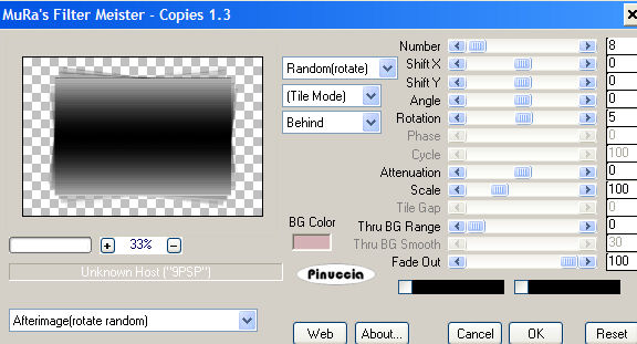 qui puoi trovare qualche risposta ai tuoi dubbi. Se l'argomento che ti interessa non è presente, ti prego di segnalarmelo. Occorrente: Un'immagine o una foto non più grande di 430 x 320 pixels. Materiale: qui Filtri: Filters Unlimited qui Mura's Meister qui Apri i tubes in PSP. Apri una nuova immagine trasparente 650 x 430 pixels. Selezione>Seleziona tutto. Attiva il file Achtergrond1 e vai a Modifica>Copia. Torna al tuo lavoro e vai a Modifica>Incolla>Incolla nella selezione. Selezione>Nessuna selezione. Effetti>Plugins>Filters Unlimited 2.0 - Edges,Square - Square edge 07. Attiva il file Achtergrond2 e vai a Modifica>Copia. Torna al tuo lavoro e vai a Modifica>Incolla>Incolla come nuovo livello. Effetti>Plugins>Mura's Meister - Copies: ![]() "Rotate Random" è una rotazione casuale, pertanto il tuo risultato potrebbe essere diverso dal mio esempio Attiva il file Achtergrond3 e vai a Modifica>Copia. Modifica>Incolla>Incolla come nuova IMMAGINE (attenzione!). Effetti>Plugins>Filters Unlimited2 - Edges,square - Square edge 07. Modifica>Copia. Torna al tuo lavoro e vai a Modifica>Incolla>Incolla come nuovo livello. ![]() Apri il file Gwynkit-03-zigzagband e vai a Modifica>Copia. Torna al tuo lavoro e vai a Modifica>Incolla>Incolla come nuovo livello. Spostalo a sinistra.Livelli>Disponi>Sposta giù, e ripeti. Attiva lo strumento Gomma ![]() e cancella in alto e in basso l'ultimo pezzetto della striscia. Livelli>Duplica. Immagine>Rifletti. Io ho dato un bel colore a questa seconda striscia, ma questa è una tua scelta. ![]() Attiva il livello superiore. Copia una immagine o una foto e incollala come nuovo livello. Attiva ora il kit di Danetta "Dogslife" e scegli i vari elementi per comporre il tuo scrap. Quando hai finito, non dimenticare di aggiungere la tua firma. Livelli>Unisci>Unisci tutto. Salva in formato jpg. ![]() Se hai problemi o dubbi, o trovi un link non funzionante, o anche soltanto per un saluto, scrivimi. Gennaio 2007 |