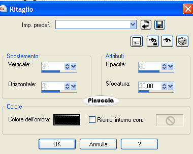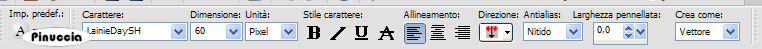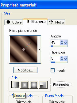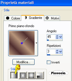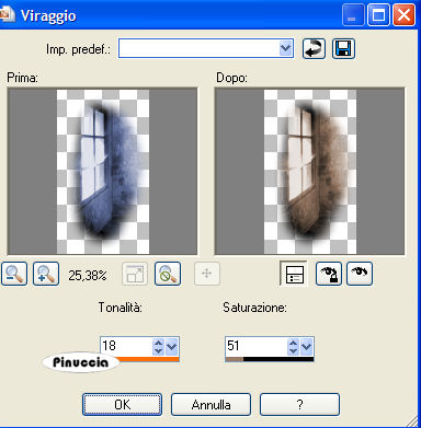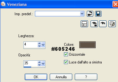 qui puoi trovare qualche risposta ai tuoi dubbi. Se l'argomento che ti interessa non è presente, ti prego di segnalarmelo. Questo tutorial è stato scritto in PSP 9, ma può essere eseguiti anche con le altre versioni del programma. Occorrente: Materiale qui I tubes che ho usato sono di Ametista, Isharimal e RozenMaiden. Per favore, rispetta il lavoro degli autori e mantieni i tubes al loro stato originale. Filtri: FM Tile Tools qui Xero - Porcelain qui Graphics Plus qui Attenzione: prima di copiare i tubes, ricordati di posizionarti sul livello del tube. 1. Apri una nuova immagine trasparente 640 x 480 pixels. Imposta il colore di primo piano con #b7947a, e il colore di sfondo con #4f2f30. Passa il colore di primo piano a Gradiente di primo piano/sfondo, con i seguenti settaggi: ![]() Regola>Sfocatura>Sfocatura gaussiana, raggio 30. ![]() 2. Livelli>Nuovo livello raster. Selezione>Seleziona tutto. Apri il file di sfondo e vai a Modifica>Copia. Torna al tuo lavoro vai a Modifica>Incolla>Incolla nella selezione. Abbassa l'opacità di questo livello al 24%. 3. Apri il tube "isharimal_window". Regola>Saturazione e Tonalità>Viraggio: ![]() Modifica>Copia. Torna al tuo lavoro e vai a Modifica>Incolla>Incolla come nuovo livello. Spostalo contro il lato sinistro.Abbassa l'opacità di questo livello al 68%. 4. Livelli>Nuovo livello raster. Passa il colore scuro a colore di primo piano. Per farlo, è sufficiente cliccare sulla doppia freccia tra le palette dei materiali: ![]() Attiva lo strumento Pennello ,cerca e seleziona il pennello "Universal Paths". Applicalo a destra. Regola>Messa a fuoco>Metti a fuoco. Cambia la modalità di miscelatura di questo livello in Luminanza (Esistente) e abbassa l'opacità al 20%. 5. Apri il tube "ametista_poetic_05.06" e vai a Modifica>Copia. Torna al tuo lavoro e vai a Modifica>Incolla>Incolla come nuovo livello. Spostalo a sinistra, accanto alla finestra.Effetti>Plugins>FM Tile Tools - Blend Emboss, con i settaggi standard: ![]() 6. Apri il tube "RozenMaiden_Model12_misted". Immagine>Ridimensiona, all'88%, bicubica. ![]() Modifica>Copia. Torna al tuo lavoro e vai a Modifica>Incolla>Incolla come nuovo livello. Spostalo a destra.Effetti>Effetti 3D>Sfalsa ombra: ![]() Effetti>Plugins>FM Tile Tools - Blend emboss. ![]() Regola>Correzione fotografica>Rimozione disturbo fotocamera digitale. Livelli>Duplica. 7. Livelli>Unisci>Unisci tutto. Effetti>Plugins>Xero - Porcelain: ![]() 8. Livelli>Nuovo livello raster. Selezione>Seleziona tutto. Effetti>Effetti 3D>Ritaglio: ![]() Ripeti l'Effetto Ritaglio, ma cambiando verticale e orizzontale a -3. Selezione>Nessuna selezione. 9. Immagine>Aggiungi bordatura, 1 pixel, simmetriche, con il colore #120000 Immagine>Aggiungi bordatura, 2 pixels, simmetriche, con il colore #4f2f30. Immagine>Aggiungi bordatura, 1 pixel, simmetriche, con il colore #120000. 10. Immagine>Aggiungi bordatura, 50 pixels, simmetriche, con il colore #b7947a. Seleziona il bordo con la bacchetta magica ![]() Effetti>Effetti di trama>Veneziana: ![]() Ripeti l'Effetto Veneziana, ma togliendo la selezione a orizzontale. 11. Selezione>Seleziona tutto. Selezione>Modifica>Contrai, di 18 pixels. Livelli>Nuovo livello raster. Imposta il colore di primo piano con #b7947a, e il colore di sfondo con #120000. Passa il colore di primo piano a Gradiente di primo piano/sfondo, con i seguenti settaggi: ![]() Riempi la selezione con questo gradiente.Selezione>Modifica>Contrai, di 8 pixels. Premi sulla tastiera il tasto canc. 12. Selezione>Nessuna selezione. Effetti>Plugins>Graphics Plus - Cross Shadow, con i settaggi standard. ![]() Effetti>Effetti 3D>Sfalsa ombra: ![]() Ripeti l'Effetto Sfalsa ombra, ma cambiando verticale e orizzontale a -1. Immagine>Aggiungi bordatura, 1 pixel, simmetriche, con il colore #120000. 13. Imposta il colore di sfondo con #52352a. Attiva lo strumento Testo ![]() seleziona il font LainieDaySH, con i seguenti settaggi: ![]() Scrivi il tuo testo e posizionalo. Il settaggio della dimensione dipende dal testo e dalla versione di PSP che stai usando. Sulle differenze dei settaggi vedi in fondo a questa pagina Aggiungi il tuo nome o il tuo watermark. Ridimensiona l'immagine, se lo desideri, e salva in formato jpg. ![]() Se hai problemi o dubbi, o trovi un link non funzionante, o anche soltanto per dirmi che ti è piaciuto, scrivimi ![]() 18 Febbraio 2007 |