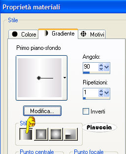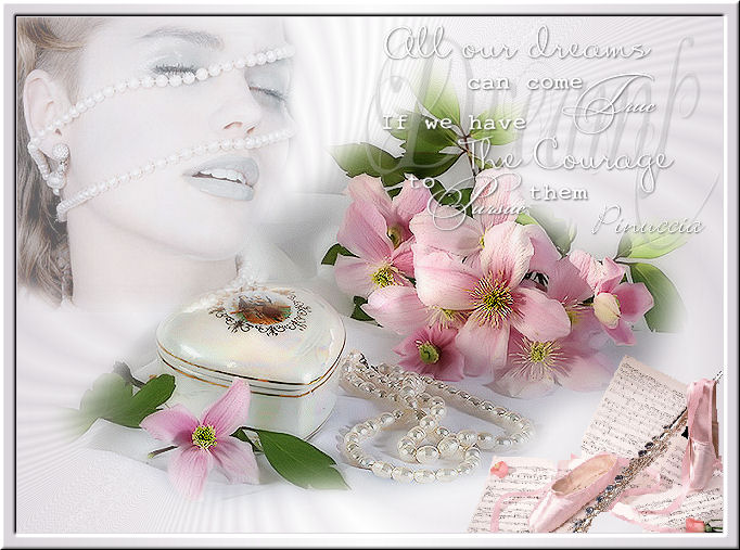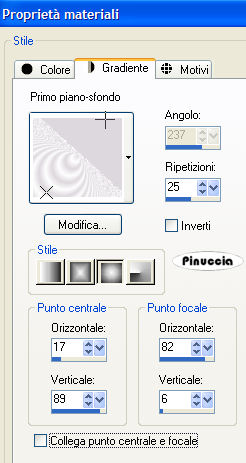 qui puoi trovare qualche risposta ai tuoi dubbi. Se l'argomento che ti interessa non è presente, ti prego di segnalarmelo. Materiale qui I tubes usati per questo tutorial sono di Suzi Sgai e Crystal. Imposta il colore di primo piano con #DDD8DD, e il colore di sfondo con #FFFFFF. Passa il colore di primo piano a Gradiente di primo piano/sfondo, con i seguenti settaggi: ![]() 1. Apri una nuova immagine trasparente 650 x 475 pixels, e riempila con il gradiente.2. Clicca con la bacchetta magica sulla parte grigia.![]() Premi sulla tastiera il tasto CANC ![]() 3. Selezione>Nessuna selezione. Regola>Messa a fuoco>Metti a fuoco. 4. Livelli>Duplica. 5. Immagine>Capovolgi. Immagine>Rifletti. 6. Sposta il livello superiore,in modo che le due parti si trovino una di fronte all'altra, come mostrato nella schermata sotto. ![]() 7. Livelli>Unisci>Unisci visibile. 8. Immagine>Rifletti. 9. Imposta il colore di sfondo su Gradiente, con i seguenti settaggi: ![]() 10. Livelli>Nuovo livello raster. Riempi il nuovo livello con il gradiente.per riempire con il gradiente impostato come colore di sfondo devi cliccare con il tasto destro del mouse. 11. Livelli>Disponi>Sposta giù. 12. Abbassa l'opacità del livello superiore al 34%. ![]() Livelli>Unisci>Unisci visibile. 13. Apri il tube con il fiore "SS1834" e vai a Modifica>Copia. Torna al tuo lavoro e vai a Modifica>Incolla>Incolla come nuovo livello. Non occorre spostarlo. Il tube è giù correttamente posizionato. Regola>Messa a fuoco>Metti a fuoco. 14. Apri il tube con le scarpette da ballo "Afbeelding13" e vai a Modifica>Copia. Torna al tuo lavoro e vai a Modifica>Incolla>Incolla come nuovo livello. Sposta il tube nell'angolo in basso a destra,facendolo uscire un po' dall'immagine. ![]() 15. Apri il tube della donna "Crystaltubed1227" e vai a Modifica>Copia. Torna al tuo lavoro e vai a Modifica>Incolla>Incolla come nuovo livello. Spostalo nell'angolo in alto a sinistra.Regola>Messa a fuoco>Metti a fuoco, 2 volte. Abbassa l'opacità di questo livello al 58%. 16. Apri il pennello Dreams. File>Esporta>Come pennello personalizzato, ![]() assegna al pennello un nome, per esempio Dreams, e clicca ok. ![]() Puoi chiudere l'immagine. 17. Imposta il colore di sfondo sul colore iniziale (bianco). Livelli>nuovo livello raster. Attiva lo strumento Pennello