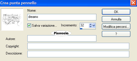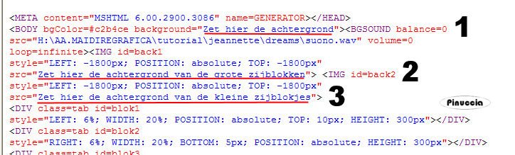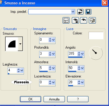 cerca e seleziona il pennello che hai appena esportatoe clicca una volta con il tasto destro del mouse, per usare il colore di sfondo, nell'angolo in alto a destra. Ti sembrerà di non vederlo bene, ma va bene così. 18. Effetti>Effetti 3D>Sfalsa ombra, con i seguenti settaggi: ![]() 19. Regola>Messa a fuoco>Metti a fuoco. 20. Controlla che tutto sia al posto giusto e vai a Livelli>Unisci>Unisci visibile. 21. Duplica l'immagine con shift+D. Immagine>Ridimensiona, a 300 pixels di altezza. Regola>Messa a fuoco>Metti a fuoco. Questa immagine ti servirà per lo script. 22. Ritorna all'immagine più grande. Immagine>Aggiungi bordatura, 1 pixel, simmetriche, con il colore di primo piano. per aggiungere i bordi con i colori impostati nella paletta dei materiali, vedi qui 23. Immagine>Aggiungi bordatura, 15 pixels, simmetriche, con il colore di sfondo. Seleziona il bordo con la bacchetta magica ![]() e riempilo con il gradiente usato al punto 9.24. Effetti>Effetti 3D>Smusso a incasso: ![]() 25. Selezione>Nessuna selezione. L'immagine è finita. Se vuoi realizzare lo script, ti occorrono anche due immagini di sfondo. Indicazioni per gli sfondi: Questo è quello che ho fatto io. Naturalmente, puoi scegliere di creare altri sfondi, o cambiare le impostazioni come preferisci. primo sfondo: apri un'immagine 150x150 e riempila con un colore rosa preso dall'immagine. Effetti>Plugins>Texture>Texturizer: ![]() Se non hai il filtro clicca qui Effetti>Effetti di bordo>Aumenta. Salva in formato jpg come sfondo1. secondo sfondo. Apri il tube dei fiori e seleziona la parte centrale dei fiori. Modifica>Copia e Modifica>Incolla>Incolla come nuova immagine. Effetti>Effetti di immagine>Motivo unico, con i settaggi standard. Salva in formato jpg con il nome sfondo2. Per eseguire lo script Apri lo script di Jeannette che trovi qui, e segui i preliminari descritti alla fine di questo tutorial, fino all'inserimento dello sfondo-suono. Dopo aver inserito lo sfondo-suono, dovrai indicare allo script dove trovare le immagini. Clicca su Origine e identifica i punti di inserimento dei vari elementi dello script. Se hai messo tutti i file in una cartella, il percorso del suono ti servirà da guida per l'inserimento degli altri files: ti basterà cambiare l'ultima parte: il nome e l'estensione. Nella schermata sotto sono indicati i punti in cui dovrai inserire, tra le virgolette, il percorso delle due immagini di sfondo, e dell'immagine che hai duplicato al punto 21 e ridotto a 300x300 pixels. 1. Qui inserisci lo sfondo1 (l'immagine a tinta unita). 2. Qui inserisci l'immagine 300x300, che servirà per i blocchi più grandi. 3. Qui inserisci lo sfondo2, l'immagine con i fiori che servirà per i blocchi più piccoli. ![]() Nella schermata sotto è indicato il punto in cui dovrai inserire il percorso dell'immagine principale. ![]() Ricorda che, contemporaneamente, puoi controllare il risultato andando su Anteprima. fai molta attenzione alle estensioni dei files e alle maiuscole-minuscole, che devono essere corrette, altrimenti lo script non troverà le immagini da inserire Clicca adesso sulla linguetta Modifica, per aggiungere il testo. clicca due volte all'interno del riquadro. Apparirà la cornice che ti dà il via libera per sostituire il testo esistente e aggiungere il tuo. ![]() Quando hai finito, clicca all'esterno e la cornice sparirà. Il tuo messaggio con lo script è pronto per il tasto Invia. Se non vuoi spedirlo e vuoi soltanto tenerlo per te, vai a File>Salva con nome e mettilo in una cartella a tua scelta. Ricordati, però, che quando vorrai rivedere lo script, i files devono trovarsi nello stesso posto. Se nel frattempo li avrai spostati, vedrai soltanto delle crocette rosse. Avvertimento: non devi preoccuparti se in Modifica non vedrai il messaggio come dovrebbe essere (per fare questo devi andare in Anteprima). Ricorda ancora che per inviare il messaggio ti devi posizionare su Modifica. ![]() Se hai problemi o dubbi, o trovi un link non funzionante, o anche soltanto per un saluto, scrivimi. 10 Maggio 2007 |