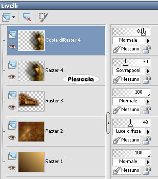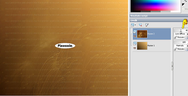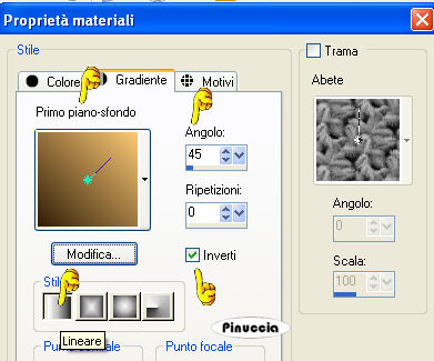 qui puoi trovare qualche risposta ai tuoi dubbi. Se l'argomento che ti interessa non è presente, ti prego di segnalarmelo. Questo tutorial è stato creato con PSP X. Materiale qui I tubes che ho usato sono di Marif e Kat. Rispetta il lavoro degli autori e lascia intatto il livello dei copyright. Filtri: Xero - Porcelain qui FM Tile Tools qui Metti il pennello nella cartella dei pennelli di PSP. 1. Apri i tubes e minimizzali nella tua area di lavoro. Ricordati di salvare spesso. Apri una nuova immagine trasparente 640 x 480 pixels. 2. Imposta il colore di primo piano con #fcc974 e il colore di sfondo con #321d08 Passa il colore di primo piano a Gradiente di primo piano/sfondo, stile lineare, con i seguenti settaggi: ![]() Riempi la tua immagine trasparente con questo gradiente.3. Selezione>Seleziona tutto. Livelli>Nuovo livello raster. Apri abstract.jpg e vai a Modifica>Copia. Torna al tuo lavoro e vai a Modifica>Incolla nella selezione. Selezione>Deseleziona. Effetti>Plugins>FM Tile Tools - Blend Emboss, con i settaggi standard: ![]() Cambia la modalità di miscelatura di questo livello in Luce diffusa, e abbassa l'opacità al 48%. ![]() 4. Apri il tube di Marif "2006_decembra_misted_paysage054". Posizionati sul livello del tube e vai a Modifica>Copia. Torna al tuo lavoro e vai a Modifica>Incolla come nuovo livello. Sposta il tube in alto a sinistra.5. Apri il tube della donna "Kat0463" e vai a Modifica>Copia. Torna al tuo lavoro e vai a Modifica>Incolla come nuovo livello. Spostalo a destra un po' più in basso.Livelli>Duplica. Attiva il livello inferiore. Attiva lo strumento Puntatore ![]() se stai usando PSP 9, è lo strumento Deformazione ![]() "tira" il tube per l'intero livello. ![]() Cambia la modalità di miscelatura di questo livello in Sovrapponi e abbassa l'opacità al 34%. 6. Attiva il livello superiore. Abbassa l'opacità di questo livello all'81%. ![]() 7. Attiva il tube del fiore "Kat_0670" e vai a Modifica>Copia. Torna al tuo lavoro e vai a Modifica>Incolla come nuovo livello. Sposta il tube in basso a sinistra.Cambia la modalità di miscelatura di questo livello in Luminanza (esistente) e abbassa l'opacità al 75%. 8. Attiva lo strumento Selezione , rettangolo, sfumatura 30.Traccia una selezione sopra il fiore, come nell'esempio sotto: ![]() Quando avrai rilasciato il tasto del mouse, la selezione si allargherà! Premi sulla tastiera il tasto CANC due volte: ![]() Selezione>Deseleziona. 9. Livelli>Unisci>Unisci visibile. Effetti>Plugins>Xero - Porcelain, con i settaggi standard. ![]() Duplica l'immagine, shift+D, e minimizza la copia per il momento. Continua sull'originale. Immagine>Ridimensiona, al 90%, tutti i livelli selezionato. Regola>Metti a fuoco>Maschera di contrasto: ![]() 10. Immagine>Aggiungi bordatura, 3 pixels, simmetriche, con il colore #ebd8c9. Seleziona il bordo con la bacchetta magica