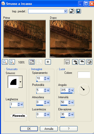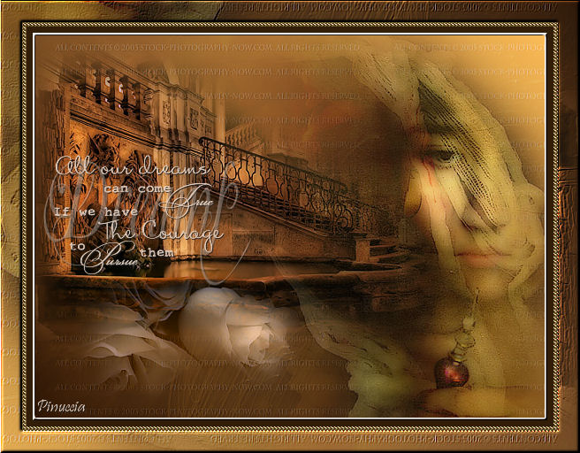 (ricordati di portare la sfumatura a 0).Effetti>Effetti 3D>Smusso a incasso: ![]() Selezione>Deseleziona. 11. Immagine>Aggiungi bordatura, 7 pixels, simmetriche, con il colore #321d08. Immagine>Aggiungi bordatura, 5 pixels, simmetriche, con un colore qualsiasi, purchè non presente nell'immagine. Seleziona il bordo con la bacchetta magica ![]() Apri il Motivo oro che hai trovato nello zip e minimizzalo. Passa il colore di primo piano a Motivi. Apri il menu cliccando sulla freccia a fianco del box e troverai il Motivo nella lista di quelli disponibili. Impostalo con i seguenti settaggi: ![]() Riempi la selezione con questo Motivo.Selezione>Deseleziona. 12. Apri la copia dell'immagine che hai messo da parte prima e vai a Modifica>Copia. Ritorna al tuo lavoro. Immagine>Aggiungi bordatura, 25 pixels, simmetriche, con un colore qualsiasi, purchè non presente nella tua immagine. Seleziona il bordo con la bacchetta magica ![]() Modifica>Incolla nella selezione. Immagine>Rifletti. Immagine>Capovolgi. 13. Effetti>Plugins>FM Tile Tools - Blend Emboss, con i settaggi standard. Ripeti l'Effetto Blend Emboss. Effetti>Effetti 3D>Smusso a incasso: ![]() Selezione>Deseleziona. 14. Attiva lo strumento pennello ![]() cerca e seleziona il pennello LG-brush-dreams, dimensione 250 pixels. Livelli>Nuovo livello raster. Imposta il colore di primo piano con il colore #ebd8c9 (o con un colore che ti piace). Applica il pennello sull'immagine. Effetti>Effetti 3D>Sfalsa ombra, con i seguenti settaggi, colore nero. ![]() 15. Livelli>Nuovo livello raster. Aggiungi il tuo watermark. 16. File>Esporta - jpeg ottimizzato, compressione 20. ![]() Se hai problemi o dubbi, o trovi un link non funzionante, o anche soltanto per un saluto, scrivimi. 11 Febbraio 2007 |