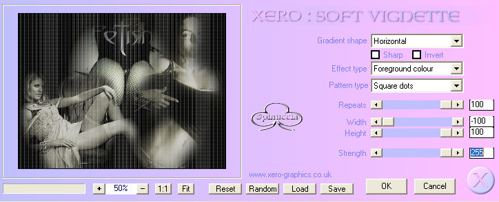 qui puoi trovare qualche risposta ai tuoi dubbi. Se l'argomento che ti interessa non è presente, ti prego di segnalarmelo. Occorrente: Materiale: qui Filtri: Xero qui FM Tile Tools qui ColorRave qui Bordermania qui Apri i tubes in PSP. 1. Apri una nuova immagine trasparente 600 x 450 pixels. Riempi l'immagine con il colore nero.2. Apri il tube Fetish e vai a Modifica>Copia. Torna al tuo lavoro e vai a Modifica>Incolla>Incolla come nuovo livello. Sposta il tube al centro dell'immagine e un po' più in alto.![]() 3. Apri il tube PAtryMists_saddeyezz_a_Woman02 e vai a Modifica>Copia. Torna al tuo lavoro e vai a Modifica>Incolla>Incolla come nuovo livello. Immagine>Rifletti. Spostalo a sinistra in basso:![]() 4. Apri il tube PatryMist_saddeyezz_woman e vai a Modifica>Copia. Torna al tuo lavoro e vai a Modifica>Incolla>Incolla come nuovo livello. Spostalo a destra.![]() 5. Livelli>Unisci>Unisci visibile. 6. Effetti>Plugins>FM Tile Tools / Blend emboss, con i settaggi standard: ![]() 7. Livelli>Duplica. Chiudi il livello superiore, e posizionati sul livello inferiore. 8. Imposta il colore di primo piano con #c5c4bf. Effetti>Plugins>Xero - Soft Vignette, con i seguenti settaggi: ![]() 9. Riapri il livello superiore e abbassa l'opacità pressappoco al 50% (o come ti sembra meglio). 10. Effetti>Plugins>ColorRave - Atmospherizer, con i settaggi che preferisci. nota del traduttore: io ho usato questi settaggi: ![]() 11. Livelli>Unisci>Unisci tutto (appiattisci). 12. Effetti>Plugins>Bordermania / Frame #2, con i seguenti settaggi: ![]() 13. Apri il tube di testo e vai a Modifica>Copia. Torna al tuo lavoro e vai a Modifica>Incolla>Incolla come nuovo livello. Posizionalo in basso al centro.Aggiungi il tuo watermark. 14. Livelli>Unisci>Unisci tutto. Immagine>Ridimensiona dell'80%, tutti i livelli selezionato. ![]()