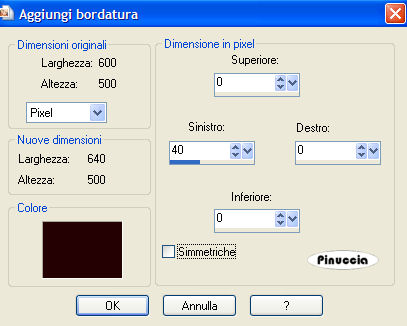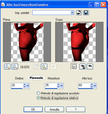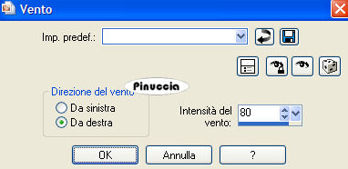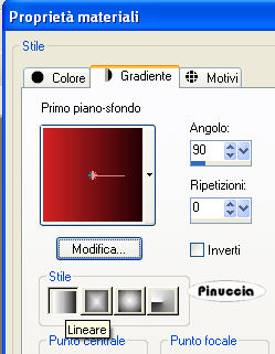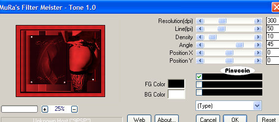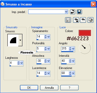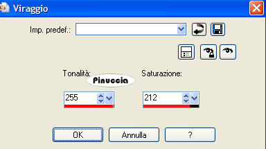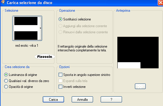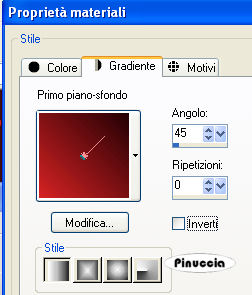 qui puoi trovare qualche risposta ai tuoi dubbi. Se l'argomento che ti interessa non è presente, ti prego di segnalarmelo. Occorrente: Materiale qui Metti i pennelli nella cartella Pennelli di PSP. Metti le selezioni nella cartella Selezioni di PSP. Filtri: FM Tile Tools - Blend Emboss qui Mura's Meister - Tone qui Imposta il colore di primo piano con #d62223, e il colore di sfondo con #240206. 1. Apri una nuova immagine trasparente 650 x 500 pixels. 2. Imposta il colore di primo piano su Gradiente di primo piano/sfondo: ![]() Riempi l'immagine trasparente con il gradiente.3. Livelli>Nuovo livello raster. Selezione>Carica/Salva selezione>Carica selezione da disco. Cerca e carica la selezione red erotic-vika1: ![]() Riempi la selezione con il colore di primo piano.D'ora in poi ci sarà un'alternanza di riempimento tra il colore di primo piano e il gradiente. Prima di riempire, ricordati di controllare le impostazioni. Selezione>Modifica>Contrai, di 1 pixel, riempi con il gradiente.Selezione>Nessuna selezione. Effetti>Plugins>FM Tile Tools - Blend Emboss: ![]() 4. Livelli>Nuovo livello raster. Selezione>Carica/Salva selezione>Carica selezione da disco. Cerca e carica la selezione red erotic2. ![]() Riempi la selezione con il colore di primo piano.Selezione>Modifica>Contrai, di 1 pixel. Riempi con il gradiente, ma prima cambia l'angolo a 45.![]() Selezione>Nessuna selezione. Effetti>Plugins>FM Tile Tools - Blend Emboss, con i settaggi precedenti. Livelli>Unisci>Unisci tutto. Metti da parte questa immagine per il momento. Ti servirà più tardi e la indicherò come immagine 1. 5. Apri una nuova immagine trasparente 300 x 400 pixels. Riempila con il colore di sfondo.per riempire con il colore di sfondo, devi cliccare con il tasto destro del mouse 6. Attiva lo strumento Pennello ![]() cerca e seleziona il pennello Kitty 387, e applicalo sull'immagine con il colore di primo piano. Immagine>Aggiungi bordatura, 2 pixels, simmetriche, con il colore di primo piano. Seleziona il bordo con la bacchetta magica ![]() Effetti>Effetti 3D>Smusso a incasso: ![]() Selezione>Nessuna selezione. Metti da parte anche questa immagine. Più tardi la indicherò come immagine 2. 8. Apri una nuova immagine trasparente 300 x 400 pixels, e riempila con il colore di sfondo.Immagine>Aggiungi bordatura, 2 pixels, simmetriche, con il colore di primo piano. Seleziona il bordo con la bacchetta magica ![]() Effetti>Effetti 3D>smusso a incasso, con i settaggi precedenti. Selezione>Nessuna selezione. Metti da parte anche questa immagine. La indicherò come immagine 3. 9. Apri l'immagine con il pennello (Immagine 2). Modifica>Copia. 10. Apri l'immagine di sfondo (Immagine 1) e vai a Modifica>Incolla>Incolla come nuovo livello. Posiziona l'immagine 2, come mostrato nella schermata sotto:![]() Livelli>Duplica (stai duplicando il livello dell'immagine con il pennello). Effetti>Effetti di distorsione>Vento: ![]() Livelli>Disponi>Sposta giù. Chiudi il livello di sfondo. Livelli>Unisci>Unisci visibile. Riapri il livello di sfondo e rimani posizionato su questo livello. 11. Apri l'immagine 3 e vai a Modifica>Copia. Torna al tuo lavoro e vai a Modifica>Incolla>Incolla come nuovo livello. Sposta l'immagine 3, come mostrato nella schermata.![]() Livelli>Duplica. Effetti>Effetti di distorsione>Vento: ![]() Livelli>Disponi>Sposta giù. Livelli>Unisci>Unisci tutto. 12. Apri il tube Erotic-Red. Regola>Luminosità e contrasto>Alteluci/mezzitoni/ombre: ![]() Immagine>Ridimensiona, al 90%. Modifica>Copia. Torna al tuo lavoro e vai a Modifica>Incolla>Incolla come nuovo livello. Sposta il tube a destra, vedi il mio esempio.Regola>Messa a fuoco>Metti a fuoco. 13. Apri il tube mr25 pearl. Regola>Saturazione e tonalità>Viraggio: ![]() Modifica>Copia. Torna al tuo lavoro e vai a Modifica>Incolla>Incolla come nuovo livello. Posiziona il tube nell'angolo in alto a sinistra dell'immagine con il pennello.Regola>Messa a fuoco>Metti a fuoco. Livelli>Duplica, 3 volte, e posiziona le perle negli altri angoli, come nel mio esempio. 14. Livelli>Unisci>Unisci tutto. 15. Immagine>Aggiungi bordatura, simmetriche non selezionato, con il colore di sfondo: ![]() come aggiungere i bordi velocemente, con i colori impostati nella paletta dei materiali senza scrivere i relativi valori, vedi qui Seleziona il bordo con la bacchetta magica ![]() e riempilo con il gradiente così impostato:![]() Selezione>nessuna selezione. 16. Attiva lo strumento Penna ![]() ![]() riporta il colore di primo piano e traccia una linea lungo la linea destra del bordo: ![]() 17. Attiva lo strumento Pennello ![]() cerca e seleziona il pennello Erotic-Red Vika, e applicalo sull'immagine con il colore di primo piano. Livelli>Unisci>Unisci tutto. 18. Immagine>Aggiungi bordatura, 1 pixel, simmetriche, con il colore di primo piano. Immagine>Aggiungi bordatura, 10 pixels, simmetriche, con il colore di sfondo. Immagine>Aggiungi bordatura, 30 pixels, simmetriche, con il colore di primo piano. Seleziona l'ultimo bordo con la bacchetta magica ![]() Effetti>Plugins>Mura's Meister - Tone: ![]() Selezione>Nessuna selezione. Immagine>Aggiungi bordatura, 2 pixels, simmetriche, con il colore di sfondo. ![]() Se hai problemi o dubbi, o trovi un link non funzionante, o anche soltanto per un saluto, scrivimi 5 Maggio 2007 |