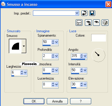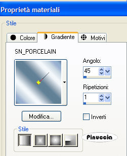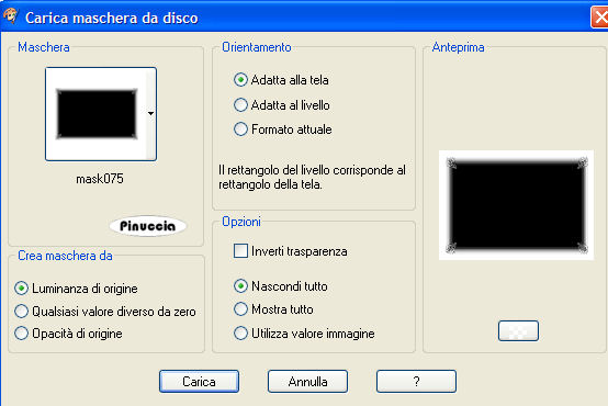 qui puoi trovare qualche risposta ai tuoi dubbi. Se l'argomento che ti interessa non è presente, ti prego di segnalarmelo. Occorrente: Materiale: qui Filtri: FM Tile Tools qui Penta.com qui Apri i tubes in PSP, metti la maschera nella cartella Maschere e il gradiente nella cartella Gradienti. Imposta il colore di primo piano con un colore preso dal tube. Imposta il colore di sfondo con il gradiente Sn_porcelain, con i seguenti settaggi: ![]() Apri una nuova immagine trasparente 700 x 500 pixels. Riempi l'immagine trasparente con il colore di primo piano.Livelli>Nuovo livello raster. Riempi il nuovo livello con il gradiente.ricorda che il gradiente è impostato come colore di sfondo, quindi per riempire devi cliccare con il tasto destro del mouse. Livelli>Carica/Salva maschera>Carica maschera da disco. Cerca e carica la maschera mask075: ![]() Livelli>Unisci>Unisci gruppo. Effetti>Effetti 3D>Sfalsa ombra, con i seguenti settaggi, colore nero. ![]() Effetti>Plugins>FM Tile Tools - Blend Emboss, con i settaggi standard. ![]() Effetti>Effetti 3D>Smusso a incasso: ![]() Attiva il livello inferiore (Raster 1). Attiva il file di sfondo BGMoonTFa e vai a Modifica>Copia. Torna al tuo lavoro e vai a Modifica>Incolla come nuovo livello. Spostalo nell'angolo in alto a sinistra.Cambia la modalità di miscelatura di questo livello in Luminanza (esistente) e abbassa l'opacità al 60%. Attiva il tube dell'uccello SS222 e vai a Modifica>Copia. Torna al tuo lavoro e vai a Modifica>Incolla come nuovo livello. Spostalo in basso a sinistra.Cambia la modalità di miscelatura di questo livello in Luminanza (esistente) e abbassa l'opacità al 50%. Attiva il tube della donna Flavinha_Mmebuterfly_Misted e vai a Modifica>Copia. Torna al tuo lavoro e vai a Modifica>Incolla come nuovo livello. Sposta il tube a destra.Cambia la modalità di miscelatura di questo livello in Luminanza (esistente). Attiva lo scraptube94 e vai a Modifica>Copia. Torna al tuo lavoro e vai a Modifica>incolla come nuovo livello. Spostalo sul lato sinistro, vedi il mio esempio.Attiva lo strumento Gomma e cancella le cordicelle.![]() Cambia la modalità di miscelatura di questo livello in Luminanza (esistente). Effetti>Effetti 3D>Sfalsa ombra, con i seguenti settaggi, colore nero: ![]() Effetti>Effetti 3D>Smusso a incasso, con i settaggi precedenti. Attiva lo scraptube90 e vai a Modifica>Copia. Torna al tuo lavoro e vai a Modifica>Incolla come nuovo livello. Sposta nell'angolo a destra.Effetti>Effetti 3D>Sfalsa ombra, con i settaggi precedenti. Effetti>Effetti 3D>Smusso a incasso, con i settaggi precedenti. Imposta il colore di primo piano con il bianco. Apri il file con il testo (Tekst Eternal). File>Esporta>Come pennello personalizzato, dai un nome al pennello e clicca ok. ![]() Attiva lo strumento Pennello ![]() cerca e seleziona il pennello che hai appena esportato, e applicalo sull'immagine con il colore di primo piano. Livelli>Unisci>Unisci tutto. Aggiungi il tuo watermark e, se vuoi, il tuo nome. Io ho usato il font Antiqua in Gridballoons L'immagine è finita, ma si può migliorare aggiungendo un bel bordo: Immagine>Aggiungi bordatura, 50 pixels, simmetriche, con un colore qualsiasi, ma contrastante con quelli usati per la tag. Seleziona il bordo con la bacchetta magica ,e riempilo con il gradiente.Effetti>Plugins>Penta.com - Dot and Cross, con i settaggi standard. ![]() Selezione>Inverti. Effetti>Effetti 3D>Sfalsa ombra, con i seguenti settaggi, colore nero: ![]() Selezione>Deseleziona. Ecco un altro esempio senza bordo e con altri tubes. ![]() ![]() Se hai problemi o dubbi, o trovi un link non funzionante, o anche soltanto per un saluto, scrivimi. 29 Maggio 2007 |