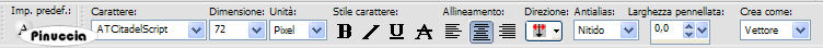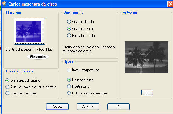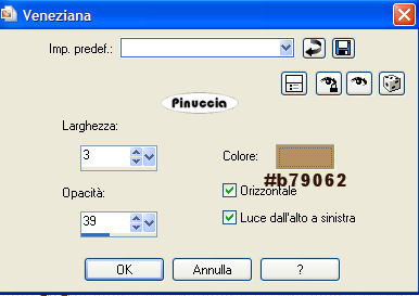 qui puoi trovare qualche risposta ai tuoi dubbi. Se l'argomento che ti interessa non è presente, ti prego di segnalarmelo. Questo tutorial è stato scritto con PSP 9, ma può essere eseguito anche con le altre versioni di PSP. Occorrente: Materiale qui I tubes che ho usato sono di Misteries, DeniseWorisch e Marif. Per favore, rispetta il lavoro degli autori e mantieni i tubes al loro stato originale. Filtri: Filters Unlimited 2.0 qui Xero qui Penta.com qui Adjust Variations qui FM Tile Tools qui 1. Apri una nuova immagine trasparente 640 x 470 pixels. Imposta il colore di primo piano con #deb27b, e il colore di sfondo con #301408. Passa il colore di primo piano a Gradiente lineare, con i seguenti settaggi: ![]() Riempi l'immagine trasparente con questo gradiente.Regola>Sfocatura>Sfocatura gaussiana, raggio 30. ![]() 2. Livelli>Nuovo livello raster. Riempi con il colore di sfondo.per riempire con il colore di sfondo, devi cliccare con il tasto destro del mouse. 3. Livelli>Carica/Salva maschera>Carica maschera da disco. Cerca e carica la maschera "Saphiere_GraphicDream_Tubes_Maske_73". ![]() Livelli>Unisci>Unisci gruppo. Regola>Messa a fuoco>Metti a fuoco. Attiva lo strumento Deformazione ,e tira l'immagine in alto: ![]() 4. Rimani sullo stesso livello. Selezione>Seleziona tutto. 5. Apri il tube "01-00_sanctuary pond1-misteries", e vai a Modifica>Copia. Torna al tuo lavoro e vai a Modifica>Incolla>Incolla nella selezione. Abbassa l'opacità di questo livello al 56%. Selezione>Nessuna selezione. 6. Apri il tube "1584dwtubes", e vai a Modifica>Copia. Torna al tuo lavoro e vai a Modifica>Incolla>Incolla come nuovo livello. Spostalo in basso, vedi il mio esempio.Effetti>Plugins>FM Tile Tools - Blend Emboss, con i settaggi standard. ![]() Regola>Correzione fotografica>Rimozione disturbo fotocamera digitale. 7. Apri il tube "Marif_2006_octobre_misted_fleurs088", e vai a Modifica>Copia. Torna al tuo lavoro e vai a Modifica>Incolla>Incolla come nuovo livello. Spostalo in basso a destra, sotto il mento della donna.![]() 8. Livelli>Unisci>Unisci tutto. 9. Effetti>Plugins>Xero - Porcelain, con i settaggi standard. ![]() Ripeti Effetti>Plugins>Xero - Porcelain, con i seguenti settaggi: ![]() 10. Imposta il colore di primo piano con #301407 e il colore di sfondo con il gradiente. Sarà sufficiente cliccare sulle frecce tra le due palette dei materiali per invertire i colori selezionati. ![]() Immagine>Aggiungi bordatura, 1 pixel, simmetriche, con il colore di primo piano. Immagine>Aggiungi bordatura, 4 pixels, simmetriche, con il colore bianco. Seleziona il bordo con la bacchetta magica ,sfumatura e tolleranza 0, antialias e interno selezionati. Riempi la selezione con il gradiente.Effetti>Plugins>Graphics Plus - Cross Shadow, con i settaggi standard. ![]() 11. Effetti>Plugins>Penta.com - Jeans, con i settaggi standard. ![]() 12. Regola>Messa a fuoco>Metti a fuoco. Selezione>Nessuna selezione. 13. Immagine>Aggiungi bordatura, 40 pixels, simmetriche, con il colore di primo piano. Seleziona il bordo con la bacchetta magica ,sfumatura e tolleranza 0, antialias e interno selezionati. Effetti>Effetti di distorsione>Allarga, standard. 14. Selezione>Seleziona tutto. Selezione>Modifica>Contrai, di 30 pixels. Selezione>Inverti. Effetti>Effetti di trama>Veneziana: ![]() Ripeti l'Effetto Veneziana, ma con Orizzontale non selezionato. 15. Effetti>Plugins>Adjust - Variation: clicca una volta su Darker. Selezione>Nessuna selezione. 16. Apri nuovamente il tube "Marif_2006_octobre_misted_fleurs088", e vai a Modifica>Copia. Torna al tuo lavoro e vai a Modifica>Incolla>Incolla come nuovo livello. Spostalo esattamente sopra il precedente,in modo che si trovi sopra il bordo. Effetti>Plugins>FM Tile Tools - Blend Emboss, con i settaggi standard. Livelli>Duplica. 17. Livelli>Unisci>Unisci tutto. Selezione>Seleziona tutto. Selezione>Modifica>Contrai, di 10 pixels. Selezione>Inverti. Effetti>Plugins>Filters Unlimited 2 - Distortion filters - Radial Waves, con i settaggi standard. ![]() 18. Effetti>Effetti 3D>Smusso a incasso: ![]() Selezione>Nessuna selezione. 19. Imposta il colore di sfondo con #deb994. Attiva lo strumento Testo ![]() Seleziona il font "AT Citadelscript" con i seguenti settaggi: ![]() Scrivi il tuo testo e posizionalo. Livelli>Converti in livello raster. 20. Effetti>Plugins>Graphics Plus - Cross Shadow, con i settaggi standard. Abbassa l'opacità di questo livello all'80%. Effetti>Effetti 3D>Sfalsa ombra: ![]() Aggiungi il tuo nome o il tuo watermark. Livelli>Unisci>Unisci tutto e salva in formato jpg. ![]() Se hai problemi o dubbi, o trovi un link non funzionante, o anche soltanto per un saluto, scrivimi. 29 Aprile 2007 |