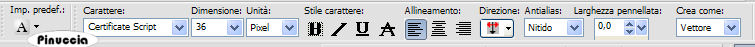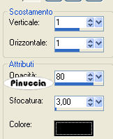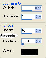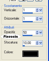 ![]() Effetti>Effetti 3D>Sfalsa ombra, con i seguenti settaggi: ![]() 16. Nella paletta dei livelli seleziona e attiva il livello superiore. Apri il tube "Rope" e vai a Modifica>Copia. Torna al tuo lavoro e vai a Modifica>Incolla>Incolla come nuovo livello. Spostalo a destra, nella striscia beige.Effetti>Effetti 3D>Sfalsa ombra, con i seguenti settaggi: ![]() 17. Apri il tube "Ring" e vai a Modifica>Copia. Torna al tuo lavoro e vai a Modifica>Incolla>Incolla come nuovo livello. Spostalo sopra la corda.Effetti>Effetti 3D>Sfalsa ombra, con i settaggi precedenti. ![]() Nella paletta dei livelli sposta questo livello sotto il livello del corda. Livelli>Duplica, e sposta la copiaall'altra estremità della corda. (vedi l'esempio del lavoro finale. 18. Nella paletta dei livelli posizionati sul livello superiore. Apri il tube "Ribbon_2", e vai a Modifica>Copia. Torna al tuo lavoro e vai a Modifica>Incolla>Incolla come nuovo livello. Spostalo in alto sulla destra della fatina.Effetti>Effetti 3D>Sfalsa ombra, con i settaggi precedenti. 19. Apri il "Nail" e vai a Modifica>copia. Torna al tuo lavoro e vai a Modifica>Incolla>Incolla come nuovo livello. Spostalo sopra il nastro.Effetti>Effetti 3D>Sfalsa ombra, con i settaggi precedenti. 20. Apri il tube "Border_1" e vai a Modifica>copia. Torna al tuo lavoro e vai a Modifica>Incolla>Incolla come nuovo livello. Spostalo a sinistra.A questo tube non va applicato l'Effetto Sfalsa ombra. 21. Apri il tube "Haakje" e vai a Modifica>Copia. Torna al tuo lavoro e vai a Modifica>Incolla>Incolla come nuovo livello. Spostalo sopra il tube precedente.Effetti>Effetti 3D>Sfalsa ombra, con i precedenti settaggi. 22. Apri il tube "NameTag" e vai a Modifica>Copia. Torna al tuo lavoro e vai a Modifica>Incolla>Incolla come nuovo livello. Spostalo in basso a sinistra.Effetti>effetti 3D>Sfalsa ombra, con i settaggi precedenti. 23. Apri il tube "Screw" e vai a Modifica>Copia. Torna al tuo lavoro e vai a Modifica>Incolla>Incolla come nuovo livello. Spostalo sopra il tube precedente.Effetti>Effetti 3D>Sfalsa ombra, con i settaggi precedenti. Livelli>Duplica, e sposta la copia sull'altro lato.24. Per finire, apri il tube "WordArt" e vai a Modifica>Copia. Torna al tuo lavoro e vai a Modifica>Incolla>Incolla come nuovo livello. Spostalo sulla targhetta.Naturalmente, se vuoi, puoi anche mettere un altro testo a tua scelta. Effetti>Effetti 3D>sfalsa ombra, con i settaggi precedenti. 25. Attiva lo strumento Testo ![]() Imposta come colore di sfondo #30321b. Seleziona il font Certificate Script, con i seguenti settaggi: ![]() (la dimensione del testo può variare a seconda della versione di PSP). Scrivi il testo e posizionalo. Livelli>Converti in livello raster. Non aggiungere alcun Effetto Sfalsa ombra. 26. Controlla che tutti i tubes siano al loro posto. Se necessario, puoi ancora spostarli un po' per sistemarli meglio. Quando sei soddisfatto: Livelli>Unisci>Unisci tutto. Immagine>Aggiungi bordatura, 15 pixels, simmetriche, con il colore bianco. Seleziona il bordo con la bacchetta magica , sfumatura 0.Se lo hai chiuso apri nuovamente "Patroon 1". Imposta il colore di primo piano a Motivi e seleziona il Motivo Patroon 1: ![]() Riempi la selezione con il Motivo.27. Effetti>Effetti 3D>Smusso a incasso, con i seguenti settaggi: ![]() 28. Aggiungi il tuo nome o il tuo watermark. Se vuoi, ridimensiona, e salva in formato jpg. ![]() Un esempio della mia amica Elisa. Grazie, Elisa, per aver testato la mia traduzione. ![]() ![]() Se hai problemi o dubbi, o trovi un link non funzionante, o anche soltanto per un saluto, scrivimi. Gennaio 2007 |