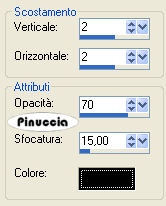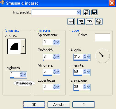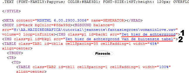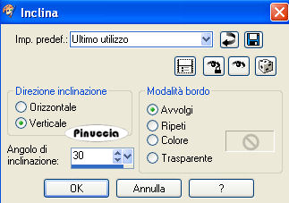 qui puoi trovare qualche risposta ai tuoi dubbi. Se l'argomento che ti interessa non è presente, ti prego di segnalarmelo. Materiale qui I tubes usati per questo tutorial sono di Marif. Filtro Greg's Factory Output II qui Imposta il colore di primo piano con #557e6c, e il colore di sfondo con #91b0a3. 1. Apri una nuova immagine trasparente 550 x 300 pixels, e riempila con il colore di primo piano.2. Effetti>Plugins>Greg's Factory - Poolshadow, con i seguenti settaggi: ![]() 3. Apri il tube Octobre_Misted_Fleurs097 e vai a Modifica>Copia. Torna al tuo lavoro e vai a Modifica>Incolla>Incolla come nuovo livello. Spostalo al centro.4. Livelli>Duplica. 5. Livelli>Unisci>Unisci tutto. 6. Immagine>Aggiungi bordatura, 1 pixel, simmetriche, con il colore di primo piano. 7. Immagine>Aggiungi bordatura, 75 pixels, simmetriche, con il colore di sfondo. 8. Seleziona il bordo con la bacchetta magica ![]() 9. Livelli>Nuovo livello raster. Riempi con il colore di sfondo,per riempire con il colore di sfondo, devi cliccare con il tasto destro del mouse. Selezione>Inverti. 10. Effetti>effetti 3D>Sfalsa ombra: ![]() Ripeti l'Effetto Sfalsa ombra, ma cambiando verticale e orizzontale a -2. 11. Selezione>inverti. 12. Ripeti l'Effetto Pool Shadow, come al punto 2. 13. Selezione>Nessuna selezione. 14. Effetti>Effetti geometrici>Inclina, con i seguenti settaggi: ![]() 15. Livelli>Unisci>Unisci visibile. 16. Passa il colore di sfondo a colore di primo piano, cliccando sulla freccia tra le due palette. ![]() 17. Attiva lo strumento Penna , con i seguenti settaggi:![]() 18. Traccia le linee, come mostrato nella schermata sotto: ![]() Livelli>Converti in livello raster. Effetti>Effetti 3D>sfalsa ombra, con i seguenti settaggi: ![]() Regola>Messa a fuoco>Metti a fuoco, 2 volte. 19. Non è ancora il momento di tracciare le linee sui bordi. 20. Livelli>Unisci>Unisci visibile. 21. Apri il tube con i fiori "Marif_2006_octobre_misted decor083" e vai a Modifica>Copia. Torna al tuo lavoro e vai a Modifica>Incolla>Incolla come nuovo livello. Sposta il tube a sinistra.22. Regola>Saturazione e tonalità>Viraggio: ![]() 23. Livelli>Unisci>Unisci tutto. 25. Immagine>Aggiungi bordatura, 5 pixels, simmetriche, con il colore verde scuro. 26. Attiva nuovamente lo strumento Penna , e traccia una linea sul bordo.Livelli>Converti in livello raster. Effetti>Effetti 3D>Sfalsa ombra: ![]() Regola>Messa a fuoco>Metti a fuoco, 2 volte. 27. Livelli>Duplica. 28. Sposta la linea sul bordo inferiore.29. Livelli>Duplica. 30. Immagine>Ruota>Ruota per gradi, 90 gradi a sinistra, ![]() 31. Sposta la linea sul lato sinistro.32. Livelli>Duplica, e sposta la linea a destra.33. Livelli>Unisci>Unisci tutto. 34. Immagine>Aggiungi bordatura, 5 pixels, simmetriche, con il colore chiaro. 35. Seleziona il bordo con la bacchetta magica ![]() 36. Effetti>Effetti 3D>Smusso a incasso, con i seguenti settaggi: ![]() 37. Selezione>Nessuna selezione. L'immagine è finita. Se vuoi realizzare lo script di Jeannette, ti servono anche 2 immagini di sfondo. L'immagine principale dovrà essere inserita nello script 2 volte. Indicazioni per gli sfondi: Questo è quello che ho fatto io. Naturalmente, puoi scegliere di creare altri sfondi, o cambiare le impostazioni come preferisci. per il primo sfondo, apri un'immagine 150x150 e riempila con il colore chiaro. Applica un effetto trama a scelta. Salva in formato jpg come sfondo1. Per il secondo sfondo, seleziona la parte centrale del tube fantasia. Modifica>Copia e Modifica>Incolla>Incolla come nuova immagine. Livelli>Nuovo livello raster. Livelli>Disponi>Sposta giù, e riempi con il colore chiaro. Livelli>Unisci>Unisci tutto. Effetti>Effetti di immagine>Motivo unico, con i settaggi standard. Livelli>Innalza livello di sfondo. Abbassa l'opacità a 80. Livelli>Unisci>Unisci tutto. Effetti>Plugins>FM Tile Tools, Blend Emboss, 2 volte. Salva in formato jpg come sfondo2. Per eseguire lo script Apri lo script di Jeannette che trovi qui, e segui i preliminari descritti alla fine di questo tutorial, fino all'inserimento dello sfondo-suono. Dopo aver inserito lo sfondo-suono, dovrai indicare allo script dove trovare le immagini. Clicca su Origine e identifica i punti di inserimento dei vari elementi dello script. Se hai messo tutti i file in una cartella, il percorso del suono ti servirà da guida per l'inserimento degli altri files: ti basterà cambiare l'ultima parte: il nome e l'estensione. Nella schermata sotto sono indicati i punti in cui dovrai inserire, tra le virgolette, il percorso delle due immagini di sfondo, e dell'immagine che hai duplicato al punto 21 e ridotto a 300x300 pixels. 1. Qui inserisci lo sfondo1 (l'immagine a tinta unica). 2. Qui inserisci lo sfondo 2, che servirà per le tabelle esterne. ![]() Nella schermata sotto sono indicati i due punti in cui dovrai inserire il percorso dell'immagine principale. ![]() Ricorda che, contemporaneamente, puoi controllare il risultato andando su Anteprima. fai molta attenzione alle estensioni dei files e alle maiuscole-minuscole, che devono essere corrette, altrimenti lo script non troverà le immagini da inserire Clicca adesso sulla linguetta Modifica, per aggiungere il testo. clicca due volte all'interno del riquadro. Apparirà la cornice che ti dà il via libera per sostituire il testo esistente e aggiungere il tuo. ![]() Quando hai finito, clicca all'esterno e la cornice sparirà. Il tuo messaggio con lo script è pronto per il tasto Invia. Se non vuoi spedirlo e vuoi soltanto tenerlo per te, vai a File>Salva con nome e mettilo in una cartella a tua scelta. Ricordati, però, che quando vorrai rivedere lo script, i files devono trovarsi nello stesso posto. Se nel frattempo li avrai spostati, vedrai soltanto delle crocette rosse. Avvertimento: non devi preoccuparti se in Modifica non vedrai il messaggio come dovrebbe essere (per fare questo devi andare in Anteprima). Ricorda ancora che per inviare il messaggio ti devi posizionare su Modifica. ![]() Se hai problemi o dubb