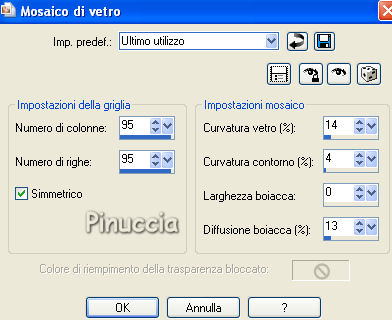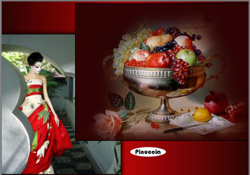 qui puoi trovare qualche risposta ai tuoi dubbi. Se l'argomento che ti interessa non è presente, ti prego di segnalarmelo. Materiale qui I bei tubes usati sono di Marif. Filtro Greg's Factory Output II qui Imposta il colore di primo piano con #B60707, e il colore di sfondo con #2F0506 Passa il colore di primo piano a Gradiente di primo piano/sfondo, con i seguenti settaggi: ![]() 1. Apri il tube con il vaso di frutta Marif_2007_03Mars_mistedfleurs. Cancella il livello del watermark. 2. Livelli>Nuovo livello raster. Riempi il nuovo livello con il colore di sfondo.3. Livelli>Disponi>Porta sotto. 4. Livelli>Unisci>Unisci tutto. 5. Selezione>Seleziona tutto. Selezione>Modifica>Contrai, di 25 pixels. ![]() 6. Modifica>Copia. Modifica>Incolla>Incolla come nuova IMMAGINE. 7. Immagine>Aggiungi bordatura, 2 pixels, simmetriche, con il colore nero. Metti da parte l'immagine, per il momento. 8. Apri l'immagine China-tuin. 9. Apri il tube della donna. Duplicalo con shift+D e metti da parte l'originale. Continua a lavorare sulla copia. 10. Cancella il livello del watermark. Immagine>Ridimensiona, a 500 pixels di altezza. Immagine>Rifletti. 11. Modifica>Copia. Attiva l'immagine China-tuin e vai a Modifica>Incolla>Incolla come nuovo livello. Posiziona la donna come mostrato nella schermata. ![]() 12. Nella paletta dei livelli abbassa l'opacità del tube a circa il 50%. 13. Attiva lo strumento Gomma e cancella la parte della donna che copre il muro:![]() 14. Quando hai finito, riporta l'opacità del livello al 100%. E questo è quello che dovresti avere: ![]() 15. Liveli>Unisci>Unisci visibile. 16. Immagine>Aggiungi bordatura, 2 pixels, simmetriche, con il colore nero. 17. Immagine>Ridimensiona, a 400x400 pixels. Metti da parte anche questa immagine. 18. Apri una nuova immagine trasparente 700x500 pixels, e riempila con il gradiente.19. Effetti>Effetti di trama>Mosaico di vetro: ![]() 20. Attiva l'immagine che hai messo da parte al punto 17 (l'immagine della donna 400x400) e vai a Modifica>Copia. Torna al tuo sfondo e vai a Modifica>Incolla>Incolla come nuovo livello. Sposta l'immagine completamente a sinistra, in basso,come mostrato nella schermata sotto: ![]() 21. Effetti>Effetti 3d>Sfalsa ombra, con i seguenti settaggi, colore nero. ![]() Ripeti l'Effetto Sfalsa ombra, ma cambiando verticale e orizzontale a -2. 22. Attiva l'immagine della frutta che hai messo da parte al punto 7 e vai a Modifica>Copia. Torna al tuo lavoro e vai a Modifica>Incolla>Incolla come nuovo livello. Spostala nell'angolo in alto a destra.![]() 23. Effetti>Effetti 3D>Sfalsa ombra, con i settaggi precedenti. Ripeti cambiando verticale e orizzontale a -2. 24. Nella paletta dei livelli abbassa l'opacità di questo livello al 55%. 25. Livelli>Disponi>Sposta giù. 26. Attiva il livello superiore (il livello con l'immagine della donna). Attiva lo strumento Gomma e cancella la parte che copre l'uva. ![]() Quando hai finito dovresti avere questo: ![]() 27. Livelli>Unisci>Unisci visibile. 28. Immagine>Aggiungi bordatura, 2 pixels, simmetriche, con il colore nero. 29. Immagine>Aggiungi bordatura, 20 pixels, simmetriche, con il colore di primo piano (#B60707). 30. Effetti>Plugins>Greg's Factory - Pool Shadow, con i settaggi standard. ![]() 31. Selezione>Nessuna selezione. Immagine>Aggiungi bordatura, 2 pixels, simmetriche, con il colore nero. 32. Apri il tube del testo e vai a Modifica>Copia. Torna al tuo lavoro e vai a Modifica>Incolla>Incolla come nuovo livello. Spostalo in alto a sinistra.io ho usato un altro testo, creato dalla mia amica Marinella, se vuoi usarlo anche tu clicca qui 33. Apri il tube originale della donna. Immagine>Ridimensiona, a 500 pixels di altezza. 34. Modifica>Copia. Torna al tuo lavoro e vai a Modifica>Incolla>Incolla come nuovo livello. Spostalo a destra.35. Effetti>Effetti 3D>Sfalsa ombra: ![]() 36. Livelli>Unisci>Unisci tutto. L'immagine è finita. Se vuoi eseguire lo script di Jeannette, hai bisogno anche di un'immagine di sfondo, e dell'immagine principale, che dovrà essere inserita due volte nello script. Per eseguire lo script Apri lo script di Jeannette che trovi qui (ho tolto il link, perchè il sito è chiuso, ma mantengo le istruzioni che possono servire per casi simili) e segui i preliminari descritti alla fine di questo tutorial, fino all'inserimento dello sfondo-suono. Dopo aver inserito lo sfondo-suono, dovrai indicare allo script dove trovare le immagini. Clicca su Origine e identifica i punti di inserimento dei vari elementi dello script. Se hai messo tutti i file in una cartella, il percorso del suono ti servirà da guida per l'inserimento degli altri files: ti basterà cambiare l'ultima parte: il nome e l'estensione. Nella schermata sotto è indicato il punto in cui dovrai inserire l'immagine di sfondo (se vuoi usare la mia clicca qui. ![]() Nella schermata sotto sono indicati i due punti di inserimento dell'immagine principale. ![]() Ricorda che, contemporaneamente, puoi controllare il risultato andando su Anteprima. fai molta attenzione alle estensioni dei files e alle maiuscole-minuscole, che devono essere corrette, altrimenti lo script non troverà le immagini da inserire Clicca adesso sulla linguetta Modifica, per aggiungere il testo. clicca due volte all'interno del riquadro. Apparirà la cornice che ti dà il via libera per sostituire il testo esistente e aggiungere il tuo. ![]() Quando hai finito, clicca all'esterno e la cornice sparirà. Il tuo messaggio con lo script è pronto per il tasto Invia. Se non vuoi spedirlo e vuoi soltanto tenerlo per te, vai a File>Salva con nome e mettilo in una cartella a tua scelta. Ricordati, però, che quando vorrai rivedere lo script, i files devono trovarsi nello stesso posto. Se nel frattempo li avrai spostati, vedrai soltanto delle crocette rosse. Avvertimento: non devi preoccuparti se in Modifica non vedrai il messaggio come dovrebbe essere (per fare questo devi andare in Anteprima). Ricorda ancora che per inviare il messaggio ti devi posiziona