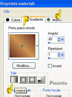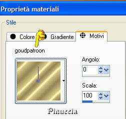 qui puoi trovare qualche risposta ai tuoi dubbi. Se l'argomento che ti interessa non è presente, ti prego di segnalarmelo. Questo tutorial è stato fatto in PSP 9, ma può essere eseguito anche con PSP 8 e 10. Occorrente: Filtri: FM Tile Tools qui Graphic Plus qui Materiale: qui 1. Apri il tube Fayegerda (sembra vuoto, ma non lo è: contiene le selezioni del canale alfa). Imposta il colore di primo piano con il colore scuro #652e1f e il colore di sfondo con il colore chiaro #cf9452. Passa il colore di primo piano a gradiente di primo piano/sfondo, con i seguenti settaggi: ![]() Riempi l'immagine con questo gradiente.Livelli>Nuovo livello raster. Cambia i settaggi del gradiente, selezionando la casella "Inverti" Selezione>Carica/Salva selezione>Carica selezione da canale alfa. Cerca e carica la selezione Fayegerda1. ![]() Riempi la selezione con il gradiente.Apri il tube Lisa G seriemisted Cityscape 033 Oregon e vai a Modifica>Copia. Torna al tuo lavoro e vai a Modifica>Incolla>Incolla nella selezione. Selezione>Nessuna selezione. Livelli>Unisci>Unisci tutto. Effetti>Plugins>FM Tile Tools / Blend emboss, con i settaggi standard. ![]() 2. Passa il colore di primo piano a Motivi e seleziona il motivo oro Goudpatroon. ![]() Livelli>Nuovo livello raster. Selezione>Carica/Salva selezione>Carica selezione da canale alfa. Carica nuovamente la selezione Fayegerda1 e riempila con il Motivo oro.Selezione>Modifica>Contrai di 1 pixel. Premi sulla tastiera il tasto CANC. Selezione>Modifica>Contrai di 2 pixels. Riempi nuovamente la selezione con il Motivo oro.Selezione>Modifica>Contrai di 1 pixel. Premi sulla tastiera il tasto CANC. Selezione>Nessuna selezione. Effetti>Effetti 3D>Sfalsa ombra, con i seguenti settaggi, colore nero: ![]() Attiva lo strumento Deformazione ![]() e trascina i bordi laterali all'esterno dell'immagine: vedi l'esempio. ![]() Livelli>unisci>Unisci tutto. 3. Passa nuovamente il colore di primo piano a gradiente. Livelli>Nuovo livello raster. Selezione>Carica/Salva selezione>Carica selezione da canale alfa. Cerca e carica la selezione Fayegerda2. ![]() Riempi la selezione con il gradiente.Regola>Sfocatura>Sfocatura gaussiana, raggio 12. Apri il tube Filly 793. Immagine>Ridimensiona, 70%, tipo di ricampionamento bicubica: ![]() Modifica>copia. Torna al tuo lavoro e vai a Modifica>Incolla>come nuovo livello. Sposta il tube sulla selezione, vedi schermata.![]() Selezione>inverti. Premi sulla tastiera il tasto CANC. Selezione>Nessuna selezione. Livelli>Nuovo livello raster. Selezione>Carica/Salva selezione>Carica selezione da canale alfa. Carica nuovamente la selezione Fayegerda2. Riempi la selezione con il Motivo oro.Selezione>Modifica>Contrai di 1 pixel. Premi sulla tastiera il tasto CANC. Selezione>Modifica>Contrai di 2 pixels. Riempi ancora la selezione con il Motivo oro.Selezione>Modifica>Contrai di 1 pixel. Premi sulla tastiera il tasto CANC. Selezione>Nessuna selezione. Effetti>Effetti 3D>Sfalsa ombra, con i settaggi precedenti. Attiva nuovamente lo strumento Deformazione ![]() e trascina il bordo destro fuori dall'immagine, vedi schermata: ![]() Chiudi il livello inferiore, posizionati su uno degli altri livelli e: Livelli>Unisci>Unisci visibile. Effetti>Effetti 3D>Sfalsa ombra, con i seguenti settaggi, colore nero: ![]() Riapri il livello inferiore e rimani posizionato su questo livello. Attiva lo strumento Penna , dimensione 2 e disegna una linea, come mostrato nella schermata:![]() Effetti>Effetti 3D>Sfalsa ombra, con i seguenti settaggi, colore nero: ![]() 4. Apri il tube Filly 794 e vai a Modifica>Copia. Torna al tuo lavoro e vai a Modifica>Incolla>Incolla come nuovo livello. Spostalo a sinistra.Effetti>Effetti 3D>Sfalsa ombra, con i seguenti settaggi, colore nero: ![]() Attiva il livello inferiore. Livelli>Nuovo livello raster. Passa il colore di primo piano a gradiente: inverti non selezionato. Selezione>Carica/Salva selezione>Carica selezione da canale alfa. Carica la selezione Fayegerda3 ![]() Riempi la selezione con il gradiente.Effetti>Plugins>Graphic Plus /Vertical Blinds, con i seguenti settaggi: ![]() Livelli>Duplica. Livelli>Disponi>Porta in alto. Sposta questo livello a sinistra,trascinandolo all'esterno in modo che rimangano soltanto 6 "stecche" della veneziana, vedi schermata: ![]() Ancora Livelli>Duplica. Immagine>Rifletti. Sposta questo nuovo livello a destra, lasciando visibili soltanto 3 "stecche".![]() Livelli>unisci>unisci tutto. 5. Immagine>Aggiungi bordatura, 5 pixels, simmetriche, con un colore qualsiasi, purchè non sia presente nella tag. Seleziona il bordo con la bacchetta magica ![]() Riempi la selezione con il gradiente.Mantieni selezionato. Livelli>nuovo livello raster. Riempi il nuovo livello con il Motivo oro.Selezione>Modifica>Contrai di 1 pixel. Premi sulla tastiera il tasto CANC. Selezione>Nessuna selezione. Effetti>Effetti 3D>Sfalsa ombra, con i seguenti settaggi, colore nero: ![]() Apri il tube del profumo P23dozi e vai a Modifica>copia. Torna al tuo lavoro e vai a Modifica>Incolla>Incolla come nuovo livello. Posizionalo in basso, vedi l'esempio della tag finale.Effetti>Effetti 3D>Sfalsa ombra, con i seguenti settaggi, colore nero: ![]() Aggiungi il tuo nome, io ho scelto il font Bickham Script. Effetti>Effetti 3D>Sfalsa ombra, con i seguenti settaggi, colore nero: ![]() Livelli>Unisci>Unisci visibile e salva in formato jpg.