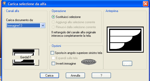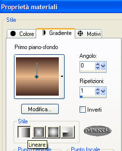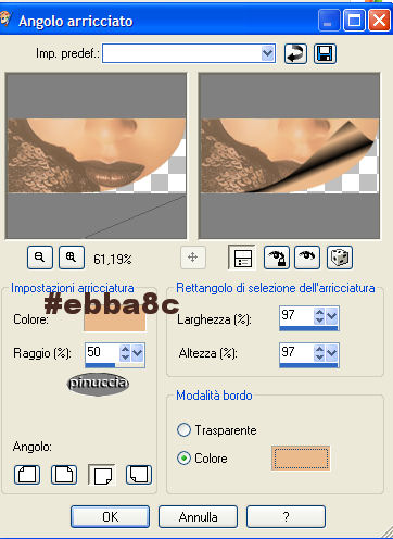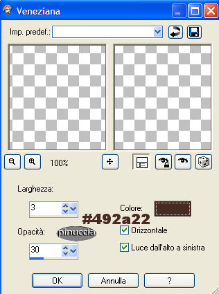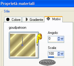qui puoi trovare qualche risposta ai tuoi dubbi. Se l'argomento che ti interessa non è presente, ti prego di segnalarmelo. Questo tutorial è stato scritto con PSP 9, ma può essere eseguito anche con le altre versioni di PSP. Occorrente: Materiale qui Filtri: VM Toolbox qui FM Tile Tools qui Questo tutorial è dedicato da Gerda a uno dei suoi favoriti autori di tubes, Filly. Grazie Filly. Non potete condividere il suo tube. 1. Imposta il colore di primo piano con #492a22 e il colore di sfondo con #ebba8c. Passa il colore di primo piano a Gradiente di primo piano/sfondo, lineare: ![]() Apri Gerdafilly.pspimage. Vedrai una tela bianca, ma non è vuota, perchè contiene una selezione salvata sul canale alfa. Riempi l'immagine con il gradiente.Apri il Motivo "Goudpatroon". Imposta questo motivo come colore di primo piano. Lo troverai cliccando sul triangolino del box dei Motivi nella paletta dei Materiali: ![]() Livelli>Nuovo livello raster. Selezione>Carica/salva selezione>Carica selezione da canale alfa. Cerca e carica la Selezione GerdaS1 ![]() Riempi la selezione con il Motivo oro.Selezione>Modifica>Contrai, di 1 pixel. Riempi la selezione con il colore chiaro.Selezione>Nessuna selezione. Effetti>Effetti 3D>Sfalsa ombra, con i seguenti settaggi, colore nero. ![]() Ripeti l'effetto Sfalsa ombra, ma cambiando verticale e orizzontale a -1. 2. Attiva la bacchetta magica , sfumatura e tolleranza 0e seleziona le tre porzioni della selezione. Apri il tube Filli1323 e vai a Modifica>Copia. Torna al tuo lavoro e vai a Modifica>Incolla>incolla come nuovo livello. Posizionalo sulla parte selezionata, come mostrato nella schermata:![]() Selezione>Inverti. Premi sulla tastiera il tasto CANC. Selezione>Nessuna selezione. Abbassa l'opacità di questo livello al 50%. 3. Posizionati sul livello di mezzo (raster 2: quello della selezione alfa). Con la bacchetta magica seleziona il blocco inferiore.![]() Nella paletta dei livelli chiudi il livello più basso. Mantieni la selezione. Posizionati su uno dei livelli attivi. Livelli>Unisci>Unisci visibile. Effetti>Effetti di immagine>Angolo arricciato, con il colore chiaro: ![]() Selezione>Nessuna selezione. Riapri il livello inferiore. 4. Posizionati sul livello superiore. Apri nuovamente il tube di Filly e vai a Modifica>copia. Ritorna al tuo lavoro e vai a Modifica>Incolla>Incolla come nuovo livello. Immagine>Rifletti. Spostalo a destra,vedi come esempio la tag finale. Posizionati sul livello centrale. Attiva lo strumento Selezione , rettangolo,e seleziona la parte come si vede nella schermata sotto: ![]() Premi sulla tastiera il tasto CANC. Selezione>Nessuna selezione. Livelli>Unisci>Unisci tutto. 5. Clicca con la bacchetta magica sul bordo chiaro.Effetti>Effetti di trama>Veneziana, con i seguenti settaggi, colore nero. ![]() Selezione>Nessuna selezione. Apri il tube Gerdaringband 8 e vai a Modifica>Copia. Torna al tuo lavoro e vai a Modifica>Incolla>Incolla come nuovo livello. Spostalo , come mostrato nella schermata:![]() Livelli>Duplica. Sposta il tube più in basso.Ripeti Livelli>Duplica. Sposta ancora più in basso il terzo tube.![]() Livelli>Unisci>Unisci tutto. 6. Apri il tube Roosgerda5 e vai a Modifica>Copia. Torna al tuo lavoro e vai a Modifica>Incolla>Incolla come nuovo livello. Spostalo sulla sinistra.Apri il tube Lipstickgerda9 e vai a Modifica>Copia. Torna al tuo lavoro e vai a Modifica>Incolla>Incolla come nuovo livello. Spostalo sopra il fiore.![]() Imposta il colore di primo piano con il Motivo oro. Livelli>nuovo livello raster. Attiva lo strumento Pennello ![]() cerca il pennello Gerdatekst128 e applicalo sull'immagine in basso a sinistra. sui Pennelli vedi qui Effetti>Effetti 3D>Sfalsa ombra, con i seguenti settaggi, colore nero. ![]() Livelli>Unisci>Unisci tutto. Immagine>Aggiungi bordatura, 1 pixel, simmetriche, con qualsiasi colore, ma che non sia presente nella tag, per esempio bianco. Seleziona il bordo con la bacchetta magica ![]() e riempilo con il Motivo oro.Aggiungi il tuo watermark e salva in formato jpg.