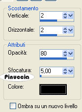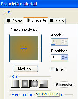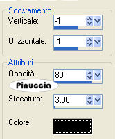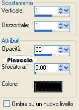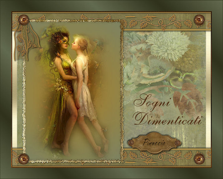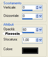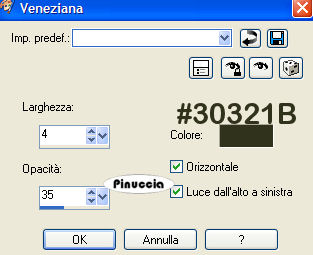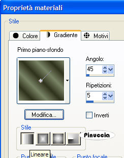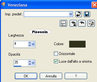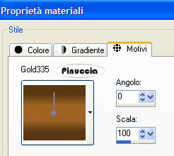 qui puoi trovare qualche risposta ai tuoi dubbi. Se l'argomento che ti interessa non è presente, ti prego di segnalarmelo. Questo tutorial è stato scritto con PSP 9, ma può essere eseguito anche con le altre versioni di PSP. Occorrente: Materiale qui Filtri: Filters Unlimited 2 qui Simple qui Per favore, rispetta il lavoro degli autori e mantieni i tubes al loro stato originale. *I tubes per lo scrap sono stati acquistati personalmente dall'autrice del tutorial. Puoi utilizzarli soltanto per questo tutorial, e per il tuo uso personale. Non puoi offrirli in vendita, o condividerli, o usarli per i tuoi tutorial, o per altri scopi commerciali. Leggi attentamente le condizioni e i termini d'uso dei disegnatori di scrap. altrimenti l'autrice smetterà di scrivere tutorial di scrap. Grazie per la tua collaborazione. Attenzione, quando attiverai i tubes, ti troverai sul livello del watermark. Ricordati, prima di andare a Modifica>Copia, di posizionarti sul livello del tube. 1. Apri una nuova immagine trasparente 640 x 500 pixels. Selezione>Seleziona tutto. Apri il file di sfondo "Achtergrond" e vai a Modifica>Copia. Torna al tuo lavoro e vai a Modifica>Incolla>Incolla nella selezione. Selezione>Nessuna selezione. 2. Apri il tube "Goldribbon", e vai a Modifica>Copia. Torna al tuo lavoro e vai a Modifica>Incolla>Incolla cme nuovo livello. Spostalo contro il bordo sinistro.Livelli>Duplica. Immagine>Rifletti. 3. Apri il tube "Leafribbon", e vai a Modifica>Copia. Torna al tuo lavoro e vai a Modifica>Incolla>Incolla cme nuovo livello. Spostalo in alto.Effetti>Effetti 3D>Sfalsa ombra, con i seguenti settaggi: ![]() Effetti>effetti di bordo>Aumenta. Livelli>Duplica. Immagine>Capovolgi. ![]() 4. Apri "Patroon_01". Effetti>Filters Unlimited 2 - Edges Square - Square Edge 17. Modifica>Copia. Torna al tuo lavoro e vai a Modifica>Incolla>Incolla come nuovo livello. Spostalo a sinistra.![]() Effetti>Effetti 3D>sfalsa ombra, con i seguenti settaggi: ![]() Effetti>Effetti di bordo>Aumenta. Metti da parte questa immagine, per il momento. 5. Apri una nuova immagine trasparente 315 x 460 pixels. Imposta il colore di primo piano con #ae8225, e il colore di sfondo con #7b8567. Passa il colore di primo piano a Gradiente di primo piano/sfondo, stile sprazzo di luce: ![]() Riempi l'immagine con questo gradiente.Regola>Sfocatura>Sfocatura gaussiana, raggio 30. ![]() Effetti>Plugins>Filters unlimited2 - edges square - square edge 17. Modifica>Copia. Torna al tuo lavoro e vai a Modifica>Incolla>Incolla come nuovo livello. Sposta l'immagine sopra il motivo oro.![]() Effetti>Effetti 3D>Sfalsa ombra, con i seguenti settaggi: ![]() 6. Apri il tube "KAT_misted_LBergkvist_spoiled". Immagine>Ridimensiona, al 50%, ricampionamento bicubica, tutti i livelli selezionato: ![]() Modifica>Copia. Torna al tuo lavoro e vai a Modifica>Incolla>Incolla come nuovo livello. Sposta il tube all'interno del riquadro.![]() Regola>Messa a fuoco>Maschera di contrasto: ![]() 7. Apri il tube "Ribbon-Tie" e vai a Modifica>Copia. Torna al tuo lavoro e vai a Modifica>Incolla>Incolla come nuovo livello. Spostalo in alto a sinistra.![]() Effetti>effetti 3D>Sfalsa ombra, con i seguenti settaggi: ![]() Regola>Messa a fuoco>Maschera di contrasto, con i settaggi precedenti. ![]() 8. Apri il tube "Leaves", e vai a Modifica>Copia. Torna al tuo lavoro e vai a Modifica>Incolla>Incolla come nuovo livello. Nella paletta dei livelli sposta questo livello sopra il livello di sfondo. Sposta il tube a destra:![]() 9. Attiva il livello superiore. Apri il tube "Eyelet" e vai a Modifica>Copia. Torna al tuo lavoro e vai a Modifica>Incolla>Incolla come nuovo livello. Spostalo sopra il tube "Ribbon-Tie".![]() Effetti>effetti 3D>Sfalsa ombra, con i seguenti settaggi: ![]() Effetti>Plugins>Simple - Top Left Mirror. ![]() clicca ok. 10. Apri il tube "Screw", e vai a Modifica>Copia. Torna al tuo lavoro e vai a Modifica>Incolla>Incolla come nuovo livello. Spostalo al centro dell'occhiello.![]() Effetti>Plugins>Simple - Top Left Mirror. 11. Apri il tube "shield" e vai a Modifica>Copia. Torna al tuo lavoro e vai a Modifica>Incolla>Incolla come nuovo livello. Spostalo in basso a destra.Effetti>Effetti 3D>Sfalsa ombra, con i seguenti settaggi. ![]() Ripeti l'Effetto Sfalsa ombra, ma cambiando verticale e orizzontale a -2. 12. Apri il tube "Nail", e vai a Modifica>Copia. Torna al tuo lavoro e vai a Modifica>Incolla>Incolla come nuovo livello. Spostalo a sinistra sul foro della targhetta.![]() Livelli>Duplica. Sposta il secondo tube sopra il foro a destra.13. Livelli>Unisci>Unisci tutto. Immagine>Aggiungi bordatura, 2 pixels, simmetriche, con il colore bianco. Seleziona il bordo con la bacchetta magica , sfumatura 0,Apri il motivo (nello zip) Gold335 e minimizzalo. Passa il colore di primo piano a Motivi, apri il menu cliccando sulla freccia a fianco del box e troverai Gold 335 nella lista. selezionalo: ![]() Riempi il bordo con questo Motivo.Effetti>effetti di bordo>Aumenta. Effetti>Effetti 3D>Sfalsa ombra, con i seguenti settaggi: ![]() Ripeti l'Effetto Sfalsa ombra, ma cambiando verticale e orizzontale a -1. Selezione>Nessuna selezione. 14. Immagine>Aggiungi bordatura, 35 pixels, simmetriche, con il colore bianco. il tutorial originale indica 25 pixels, ma io ho preferito un bordo più largo. Decidi tu, come ti sembra meglio, la misura di questo bordo. Seleziona il bordo con la bacchetta magica , sfumatura 0.Imposta il colore di primo piano su #7b8567, e il colore di sfondo su #30321b. Passa il colore di primo piano a Gradiente di primo piano/sfondo, stile lineare, con i seguenti settaggi: ![]() Riempi la selezione con questo gradiente.15. Effetti>effetti di trama>Veneziana: ![]() nel tutorial originale non è indicato il colore, io ho usato #30321b. Ripeti l'Effetto Veneziana, ma togliendo la spunta a orizzontale: ![]() Effetti>Effetti 3D>Sfalsa ombra: ![]() Selezione>Nessuna selezione. Immagine>Aggiungi bordatura, 1 pixel, simmetriche, con il colore #30321b. Per finire, un tes