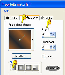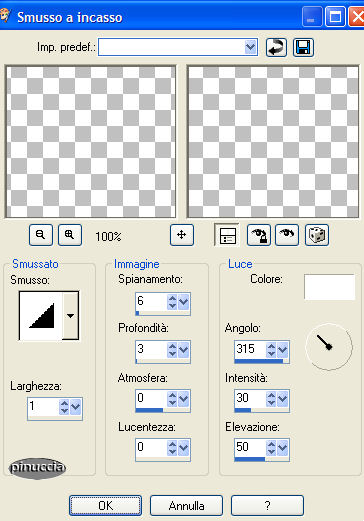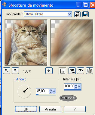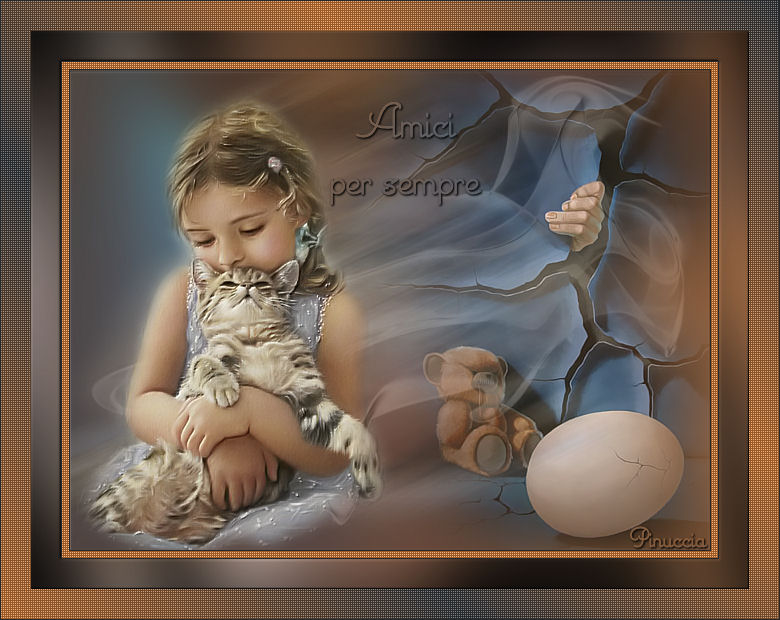 1. Apri una nuova immagine trasparente 640 x 480 pixels. Riempi con il colore #9b5a26.2. Livelli>Nuovolivello raster. Selezione>Seleziona tutto. Apri il file "Texture" e vai a Modifica>Copia. Torna al tuo lavoro e vai a Modifica>Incolla>Incolla nella selezione. Regola>Sfocatura>sfocatura gaussiana, raggio 30. ![]() Abbassa l'opacità di questo livello al 64%. Selezione>Nessuna selezione. 4. Apri il tube "Marif_2006_octobre_misted_fantasy038" e vai a Modifica>Copia. Torna al tuo lavoro e vai a Modifica>Incolla>Incolla come nuovo livello. Spostalo in basso a destra.5. Apri il tube "misted_embrace-foxleap" e vai a Modifica>Copia. Torna al tuo lavoro e vai a Modifica>Incolla>Incolla come nuovo livello. Spostalo a sinistra.Regola>Sfocatura>Sfocatura di movimento. ![]() 6. Attiva lo strumento Deformazione ,"tira" il livello, spostandolo tutto a sinistra. ![]() Clicca sulla manina per liberarti della griglia della deformazione.7. Abbassa l'opacità del livello al 35%. Effetti>Effetti di bordo>Aumenta. 8. Modifica>Incolla>incolla come nuovo livello (il tube è ancora in memoria). Effetti>Plugins>FM Tile Tools - Blend Emboss, con i settaggi standard. ![]() Regola>Correzione fotografica>Rimozione disturbo fotocamera digitale, con i settaggi standard. ![]() Livelli>Duplica. 9. Livelli>Nuovo livello raster. Selezione>Seleziona tutto. 10. Apri il tube "MarieL_2006_10Octobre_smoke03t" e vai a Modifica>Copia. Torna al tuo lavoro e vai a Modifica>Incolla>Incolla nella selezione. Nella paletta dei livelli cambia la modalità di miscelatura in Luminanza (esistente) e abbassa l'opacità al 44%. Sposta questo livello sotto il secondo livello della bambina. Selezione>Nessuna selezione. Livelli>Unisci>Unisci tutto. Duplica l'immagine (shift+D) e metti da parte, per il momento, la copia, che ti servirà più tardi. 12. Immagine>Aggiungi bordatura, 1 pixel, simmetriche, con il colore #26292c. Immagine>Aggiungi bordatura, 7 pixels, simmetriche, con il colore #9b5a26. Seleziona il bordo con la bacchetta magica , sfumatura 0.Effetti>Plugins>Penta.com - Color dot, con i settaggi standard. ![]() Selezione>Nessuna selezione. Immagine>Aggiungi bordatura, 1 pixel, simmetriche, con il colore #26292c. 13. Immagine>Aggiungi bordatura, 30 pixels, simmetriche, con il colore bianco. Seleziona il bordo con la bacchetta magica , sfumatura 0.Attiva la copia che hai messo da parte prima e vai a Modifica>Copia. Torna al tuo lavoro e vai a Modifica>Incolla>Incolla nella selezione. 14. Regola>Sfocatura>Sfocatura gaussiana, raggio 30. Effetti>Plugins>Graphics Plus - Cross Shadow, con i settaggi standard. ![]() 15. Mantieni selezionato. Effetti>Effetti 3D>Smusso a incasso, con i seguenti settaggi: ![]() Selezione>Nessuna selezione. 16. Immagine>Aggiungi bordatura, 30 pixels, simmetriche, con il colore bianco. Seleziona il bordo con la bacchetta magica , sfumatura 0.Imposta il colore di primo piano con #9b5a26 e il colore di sfondo con #26292c. Crea un gradiente lineare, con i seguenti settaggi: ![]() Riempi il bordo con questo gradiente.Effetti>Plugins>Penta.com - Color Dot, con i settaggi standard. Selezione>Nessuna selezione. 17. Immagine>Aggiungi bordatura, 1 pixel, simmetriche, con il colore #26292c. 18. Imposta sia il colore di primo piano che il colore di sfondo con #9b5a26. Attiva lo strumento Testo , font MonteCarloScript, con i seguenti settaggi:![]() Scrivi il testo: Friends Forever, oppure in italiano Amici per sempre, oppure quello che preferisci. Livelli>Converti in livello raster. 19. Cambia la modalità di miscelatura di questo livello in Luminanza. Effetti>Effetti 3D>Sfalsa ombra, con i seguenti settaggi: ![]() Aggiungi la tua firma. Ridimensiona, se necessario, e salva in formato jpg. ![]() ![]() Se hai problemi o dubbi, o trovi un link non funzionante, o anche soltanto per un saluto, scrivimi. Novembre 2006 |