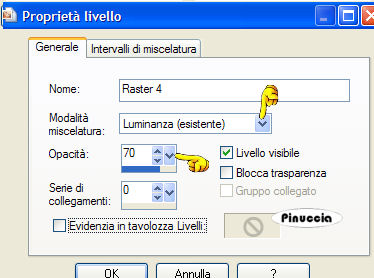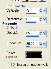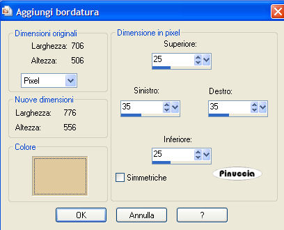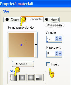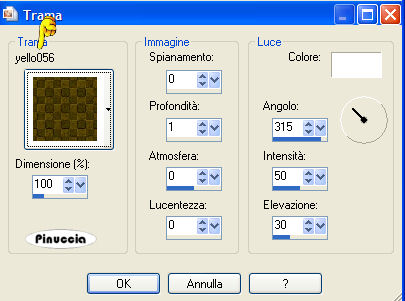 qui puoi trovare qualche risposta ai tuoi dubbi. Se l'argomento che ti interessa non è presente, ti prego di segnalarmelo. Occorrente: Materiale qui I tubes sono di Marif e Swanja . Grazie per il permesso di usare i loro bellissimi tubes. Apri i tubes in PSP. Metti il materiale nelle rispettive cartelle. Scegli dal tube un colore chiaro come colore di primo piano e un colore scuro come colore di sfondo. Passa il colore di primo piano a gradiente di primo piano/sfondo, lineare, con i seguenti settaggi: ![]() Apri una nuova immagine trasparente 700 x 500 pixels e riempila con questo gradiente.Apri il tube Marif_2006_octobre_misted_paysage026 e vai a Modifica>Copia. Torna al tuo lavoro e vai a Modifica>Incolla>Incolla come nuovo livello. Spostalo in alto.![]() Apri il tube Marif_2006_octobre_misted_decor082 e vai a Modifica>Copia. Torna al tuo lavoro e vai a Modifica>Incolla>Incolla come nuovo livello. Spostalo in basso a sinistra.![]() Nella paletta dei livelli abbassa l'opacità all'80%. Livelli>Duplica. Immagine>Rifletti. Apri il tube Swanja_SteveWalker_telling e vai a Modifica>Copia. Torna al tuo lavoro e vai a Modifica>Incolla>incolla come nuovo livello. Spostalo in basso (vedi la tag finale).Livelli>Proprietà>modalità di miscelatura Luminanza esistente e opacità 70. ![]() Apri il tube Marif_2006_octobre_misted_fantasy051 e vai a Modifica>Copia. Torna al tuo lavoro e vai a Modifica>Incolla>Incolla come nuovo livello. Spostalo in alto a destra.Abbassa l'opacità di questo livello al 46%. Livelli>Unisci>Unisci tutto. Immagine>Aggiungi bordatura, 3 pixels, simmetriche, con il colore scuro. Immagine>Aggiungi bordatura, simmetriche non selezionato, con i seguenti settaggi e con il colore chiaro. ![]() Seleziona il bordo con la bacchetta magica ![]() Effetti>Effetti di trama>Trama: cerca e seleziona la trama yello056 (se preferisci, puoi scegliere un'altra trama) con i seguenti settaggi: ![]() Effetti>Effetti 3D>Sfalsa ombra, con i seguenti settaggi, colore nero: ![]() Selezione>inverti. Effetti>Effetti 3D>Sfalsa ombra, con i settaggi precedenti. Selezione>Nessuna selezione. Immagine>Aggiungi bordatura, 3 pixels, simmetriche, con il colore scuro. Attiva lo strumento Pennello ![]() e cerca il pennello agiBrush70_romance. Applicalo in alto a sinistra con il colore scuro. Aggiungi il tuo nome o il tuo watermark. Io ho usato il font Miss Packgope, dimensione 72. Livelli>Unisci>Unisci tutto e salva in formato jpg. ![]() Se hai problemi o dubbi, o trovi un link non funzionante, o anche soltanto per un saluto, scrivimi. Ottobre 2006 |
