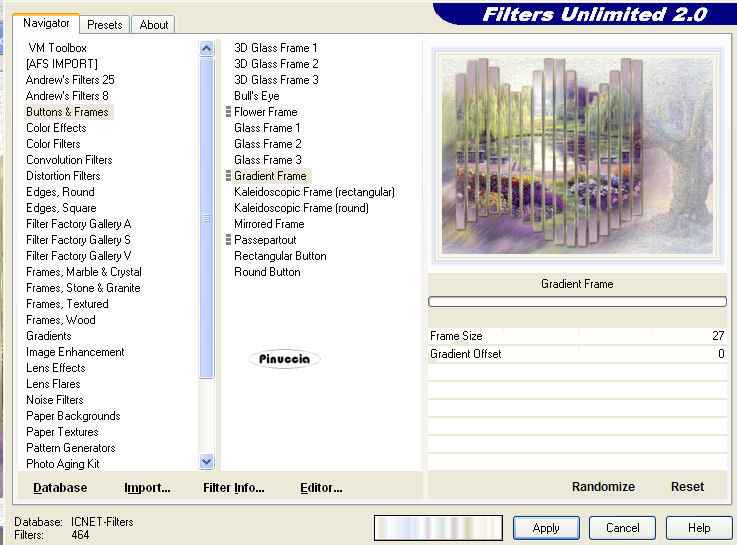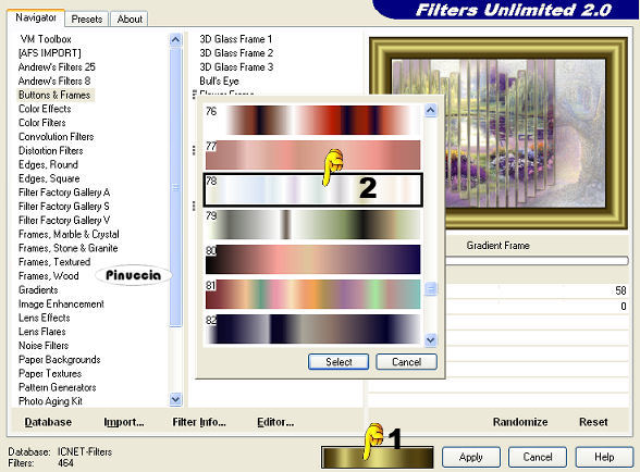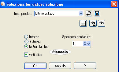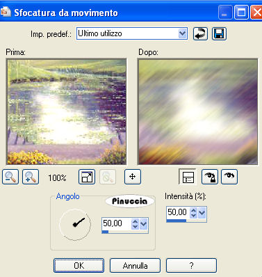 qui puoi trovare qualche risposta ai tuoi dubbi. Se l'argomento che ti interessa non è presente, ti prego di segnalarmelo. Questo tutorial è stato scritto e tradotto con PSP X, ma può essere eseguito anche con le altre versioni di PSP. Occorrente: Materiale qui Filtri: Filters Unlimited 2.0 qui 1. Apri una nuova immagine BIANCA 600 x 450 pixels. 2. Effetti>Plugins>Filters Unlimited 2.0 - Paper Background - Canvas White Coarse (1 o 2, scegli tu): ![]() Effetti>Plugins>Filters Unlimited 2.0 - Paper Texture - Wallpaper, Fine, con i seguenti settaggi: ![]() 3. Selezione>Seleziona tutto. Livelli>Nuovo livello raster. Apri il tube Romanticsee e vai a Modifica>Copia. Torna al tuo lavoro e vai a Modifica>Incolla nella selezione. Selezione>Deseleziona. 4. Regola>Sfocatura>Sfocatura da movimento: ![]() Sposta l'immagine a sinistra,e abbassa l'opacità del livello al 70%. 5. Apri il tube con l'albero: JosefineWall_tree_reverie, e vai a Modifica>Copia. Torna al tuo lavoro e vai a Modifica>Incolla come nuovo livello. Spostalo a destra.Abbassa l'opacità di questo livello al 40%. ![]() 6. Apri la slat (ga_slats_01) e vai a Modifica>Copia. Torna al tuo lavoro e vai a Modifica>Incolla come nuovo livello. Puoi lasciarla dove sta, per il momento. La sposterai dopo. Selezione>Seleziona tutto. Selezione>Mobile. Selezione>Immobilizza. In questo modo hai selezionato la slat. 7. Livelli>Nuovo livello raster. Imposta il colore di primo piano con un gradiente a scelta o con un colore scelto dall'immagine, e riempi la selezione con questo colore.Adesso puoi cancellare il livello nero della slat. Clicca con il tasto destro del mouse sul livello e scegli elimina. Mantieni selezionato. 8. Apri nuovamente il tube Romanticsee e vai a Modifica>Copia. Torna al tuo lavoro e vai a Modifica>Incolla come nuovo livello. Selezione>Inverti. Premi sulla tastiera il tasto CANC ![]() Livelli>Unisci>Unisci giù. 9. Selezione>Inverti. Selezione>Modifica>Seleziona bordature selezione. ![]() Imposta il colore di primo piano con un motivo oro, o con un colore preso dall'immagine. Riempi la selezione del bordo con il motivo o con il colore che hai scelto.se hai problemi a riempire la selezione così ristretta, ingrandiscila usando la rotellina del mouse Selezione>Deseleziona. Effetti>Effetti 3D>Sfalsa ombra, con i seguenti settaggi. ![]() Posiziona correttamente la slat e controlla che tutto sia al posto giusto.Quando sei soddisfatto: Livelli>Unisci>Unisci tutto. 10. Effetti>Plugins>Filters Unlimited 2 - Buttons & Frames - Gradient Frame: clicca sul menu dei gradienti (1) e dalla lista che apparirà seleziona il gradiente 78 (2), quindi clicca Select: ![]() Imposta il settaggio a 27/0, e clicca Apply. ![]() 11. Selezione>Seleziona tutto. Selezione>Modifica>Contrai, di 25 pixels. Selezione>Inverti. Effetti>Effetti 3D>Smusso a incasso: ![]() Ripeti l'Effetto Smusso a incasso. Apri il tube con gli uccelli e vai a Modifica>Copia. Torna al tuo lavoro e vai a Modifica>Incolla come nuovo livello. Effetti>Effetti 3D>Sfalsa ombra: ![]() Apri il tube con le farfalle. Troverai che ogni farfalla si trova in un proprio livello. Posizionati sul livello che hai scelto e vai a Modifica>Copia. Torna al tuo lavoro e vai a Modifica>Incolla come nuovo livello. Immagine>Ridimensiona, a tuo piacimento. Posiziona la farfalla dove preferisci.Quando hai finito, firma il tuo lavoro e salva in formato jpg. ![]() Se hai problemi o dubbi, o trovi un link non funzionante, scrivimi. 13 Giugno 2007 |