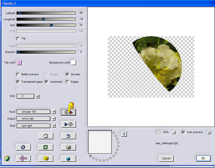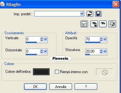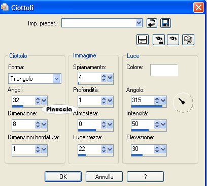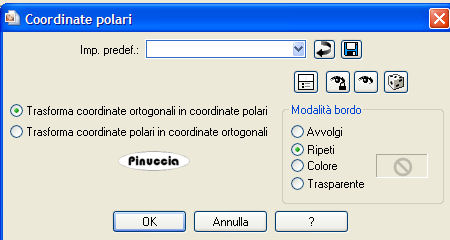 qui puoi trovare qualche risposta ai tuoi dubbi. Se l'argomento che ti interessa non è presente, ti prego di segnalarmelo. Questo tutorial è stato scritto e tradotto con PSP X, ma può essere eseguito anche con le altre versioni di PSP. Un ringraziamento agli autori dei tubes Occorrente: Materiale qui Filtro: Flaming Pear Flexify 2 qui Metti il preset sax_halbkugel.q2q nella cartella dei preset di Flexify. 1. Apri una nuova immagine trasparente 700 x 500 pixels. Selezione>Seleziona tutto. 2. Apri l'immagine Primel e vai a Modifica>copia. Torna al tuo lavoro e vai a Modifica>Incolla nella selezione. Livelli>Duplica. Selezione>Deseleziona. 3. Attiva il livello superiore (il duplicato). Effetti>Plugins>Flaming Pear - Flexify 2: clicca sull'icona indicata dalla manina, cerca e seleziona il preset sax_halbkugel.q2q nella cartella dove lo hai salvato. ![]() Non occorre fare altro. Clicca ok. Effetti>Plugins>FM Tile Tools - Blend Emboss, con i settaggi standard. ![]() Effetti>Effetti 3D>Sfalsa ombra: ![]() Livelli>Duplica. Immagine>Rifletti. 4. Attiva il livello inferiore (Raster 1). Effetti>Effetti di distorsione>Coordinate polari: ![]() Sistema le due semisfere (vedi il mio esempio).5. Apri il tube della donna Marif_2007_03Mars_face03 e vai a Modifica>Copia. Torna al tuo lavoro e vai a Modifica>Incolla come nuovo livello. Effetti>Effetti 3D>Sfalsa ombra, con i settaggi precedenti. 6. Immagine>Aggiungi bordatura, 2 pixels, simmetriche, con un colore scuro preso dall'immagine. Immagine>Aggiungi bordatura, 2 pixels, simmetriche, con un colore chiaro preso dall'immagine. Immagine>Aggiungi bordatura, 2 pixels, simmetriche, con il colore scuro. Immagine>Aggiungi bordatura, 30 pixels, simmetriche, con il colore chiaro. 7. Seleziona il bordo con la bacchetta magica ![]() Effetti>Effetti di trama>Ciottoli: ![]() 8. Selezione>Inverti. Selezione>Modifica>Contrai, di 6 pixels. Selezione>Mobile. Effetti>Effetti 3D>Ritaglio: ![]() Selezione>Deseleziona. 9. Attiva lo strumento Testo , scegli un bel font,e scrivi il tuo testo. Effetti>Effetti 3D>Sfalsa ombra, con i settaggi precedenti, 2 volte. Aggiungi il tuo watermark, se vuoi. Livelli>Unisci>Unisci tutto. Salva in formato jpg. ![]() Se hai problemi o dubbi, o trovi un link non funzionante, scrivimi 13 Giugno 2007 |
