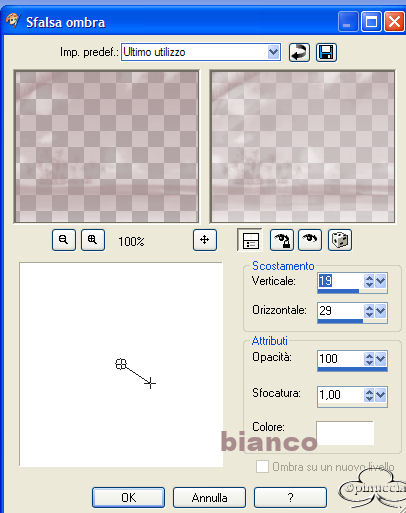 5. Effetti>Effetti 3D>Sfalsa ombra, con i seguenti settaggi, colore bianco: