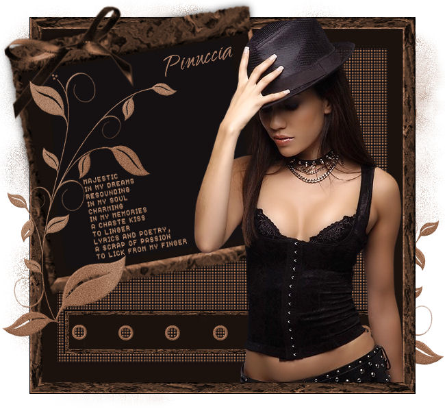 qui puoi trovare qualche risposta ai tuoi dubbi. Se l'argomento che ti interessa non è presente, ti prego di segnalarmelo. Questo tutorial fa parte della serie "Tag facili" di Gerda. Occorrente: Materiale qui Il tube è di Jet Il pennello di testo è di aRavensbrush. Metti il pennello nella cartella Pennelli. Se hai problemi con i pennelli vedi i miei appunti qui 1. Apri una nuova immagine trasparente 650 x 600 pixels. Riempi l'immagine trasparente con il colore bianco.Apri il tube GerdaSEcharming1, e vai a Modifica>Copia. Torna al tuo lavoro e vai a Modifica>Incolla>Incolla come nuovo livello. E' già correttamente posizionato. Apri il tube GerdaSEcharming2 e vai a Modifica>Copia. Torna al tuo lavoro e vai a Modifica>Incolla>Incolla come nuovo livello. E' già correttamente posizionato. Apri il tube GerdaSEcharming3 e vai a Modifica>Copia. Torna al tuo lavoro e vai a Modifica>Incolla>Incolla come nuovo livello. E' già correttamente posizionato. Apri il tube GerdaSEcharming4 e vai a Modifica>Copia. Torna al tuo lavoro e vai a Modifica>Incolla>Incolla come nuovo livello. Posiziona questo tube come mostrato nell'esempio sotto.![]() 2. Apri il nastro GerdaSEcharming5 e vai a Modifica>Copia. Torna al tuo lavoro e vai a Modifica>Incolla>Incolla come nuovo livello. Sposta il nastro sulla cornice.Apri il tube GerdaSEcharming6 e vai a Modifica>Copia. Torna al tuo lavoro e vai a Modifica>Incolla>Incolla come nuovo livello. Sposta il tube in basso.Apri il tube GerdaSEcharming7 e vai a Modifica>Copia. Torna al tuo lavoro e vai a Modifica>Incolla>Incolla come nuovo livello. Sposta il tube come nel mio esempio,fai attenzione a lasciare lo spazio per l'ombra. ![]() 3. Attiva il livello della cornice (il mio è il livello Raster 5). Imposta il colore di primo piano con #a47b60. Livelli>Nuovo livello raster. Attiva lo strumento Pennello ![]() cerca e seleziona il pennello aRavenBrush poem !majestic, dimensione 162: ![]() e applicalo, cliccando due volte, sulla cornice. Immagine>Ruota>Ruota per gradi, 10 gradi a sinistra, tutti i livelli non selezionato. ![]() Regola>Messa a fuoco>Metti a fuoco. Attiva il livello superiore. Apri il tube di Jet e vai a Modifica>Copia. Torna al tuo lavoro e vai a Modifica>Incolla>Incolla come nuovo livello. Immagine>Ridimensiona, al 90%, tutti i livelli non selezionato. Posiziona il tube a destra.Aggiungi il tuo nome (io ho usato il font Ambiance). Livelli>Unisci>Unisci tutto e salva in formato jpg. ![]() Se hai problemi o dubbi, o trovi un link non funzionante, o anche soltanto per un saluto, scrivimi 17 Dicembre 2007 |