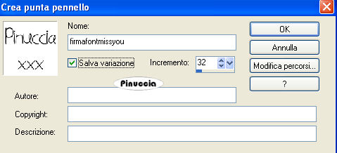 qui puoi trovare qualche risposta ai tuoi dubbi. Se l'argomento che ti interessa non è presente, ti prego di segnalarmelo. Questo tutorial fa parte della serie "Tag facili" di Gerda. Occorrente: Un tube a scelta. Il resto del materiale qui Il tube che ho usato è di TsGina. 1. Apri il file di sfondo Gerdavaleriebg. Questa sarà la base del tuo lavoro. Apri Gerdarvalerielijst, e vai a Modifica>Copia. Torna al tuo lavoro e vai a Modifica>Incolla come nuovo livello. Apri GerdarvalerieEffect1, e vai a Modifica>Copia. Torna al tuo lavoro e vai a Modifica>Incolla come nuovo livello. E' già correttamente posizionato. Non occorre spostarlo. Apri GerdavalerieEffect2, e vai a Modifica>Copia. Torna al tuo lavoro e vai a Modifica>Incolla come nuovo livello. Spostalo in basso a destra, come nell'esempio.![]() Apri gerdarvalerie muur, e vai a Modifica>Copia. Torna al tuo lavoro e vai a Modifica>Incolla come nuovo livello. Spostalo in alto a sinistra, vedi il mio esempio.2. Apri gerdarvalerieframe. Duplica due volte l'immagine usando sulla tastiera la combinazione di tasti shift(maiuscola)+D, e chiudi l'originale. Attiva lo strumento Bacchetta magica ![]() e clicca all'interno della cornice per selezionarlo. Apri il tuo tube, e vai a Modifica>Copia. Torna alla cornice selezionata e vai a Modifica>Incolla come nuovo livello. Posiziona il tube nella cornice con la parte che vuoi rimanga visibile.Selezione>Inverti. Premi sulla tastiera il tasto CANC. Selezione>Deseleziona. Abbassa l'opacità di questo livello al 60%. Livelli>Unisci>Unisci visibile. Torna al tuo lavoro e vai a Modifica>Incolla come nuovo livello. Sposta la cornice in alto a destra.Immagine>Ruota per gradi - 7 gradi a destra. 3. Apri il tube del fiore, e vai a Modifica>Copia. Torna al tuo lavoro e vai a Modifica>Incolla come nuovo livello. Livelli>Disponi>Sposta giù, e posiziona il fiore sotto la cornice,in modo che si veda soltanto una piccola parte (vedi l'esempio finale). 4. Attiva la seconda copia della cornice e ripeti il passo 2, ma lasciando nella cornice una parte diversa del tube, e ruotando la cornice 7 gradi a sinistra. 5. Attiva nuovamente il tube del fiore e vai a Modifica>Copia. Torna al tuo lavoro e vai a Modifica>Incolla come nuovo livello. Livelli>Disponi>Sposta giù, e posiziona il fiore sotto la cornice in basso a sinistra,(vedi l'esempio finale). 6. Attiva nuovamente il tuo tube e vai a Modifica>copia. Torna al tuo lavoro e vai a Modifica>Incolla come nuovo livello. Effetti>Effetti 3D>Sfalsa ombra, con i seguenti settaggi, colore nero: ![]() 7. Adesso possiamo aggiungere il nome o un testo come pennello personalizzato. Livelli>Unisci>Unisci visibile. 8. Chiudi il colore di primo piano e imposta il colore di sfondo con il nero. Attiva lo strumento Testo e scegli un font.Io ho usato Everytime I miss you. Scrivi il tuo testo, crea come vettore. Livelli>Converti in livello raster. Modifica>Copia. Modifica>Incolla come nuova immagine. File>Esporta>Pennello personalizzato - assegna un nome al pennello e clicca ok. ![]() Torna al tuo lavoro. Elimina il livello del testo. Livelli>Nuovo livello raster. Imposta il colore di primo piano con il bianco. Attiva lo strumento Pennello ![]() cerca e seleziona il pennello che hai appena esportato, imposta la dimensione a 90, e applicalo cliccando con il tasto sinistro del mouse per usare il colore di primo piano. Immagine>Ruota per gradi - 7 gradi a sinistra. Livelli>Unisci>Unisci tutto, e salva in formato jpg. ![]() Se hai problemi o dubbi, o trovi un link non funzionante, o anche soltanto per un saluto, scrivimi 22 Aprile 2008 |