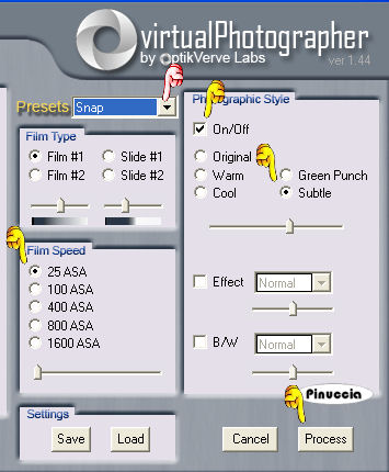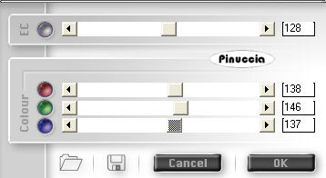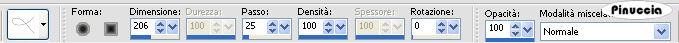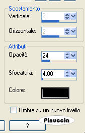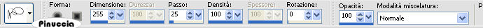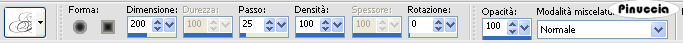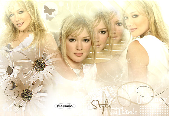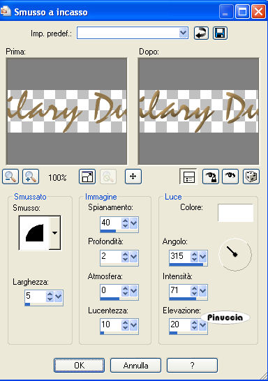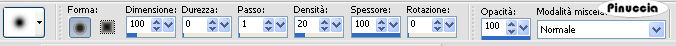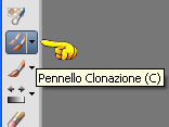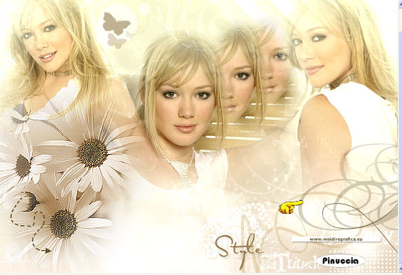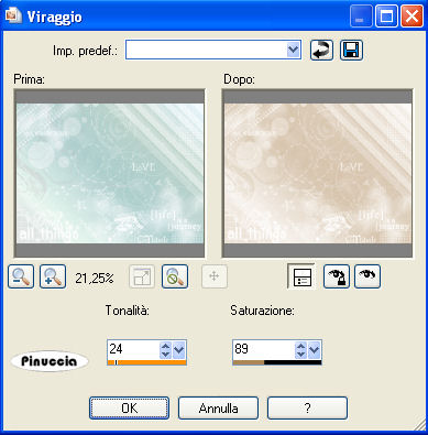 qui puoi trovare qualche risposta ai tuoi dubbi. Se l'argomento che ti interessa non è presente, ti prego di segnalarmelo. Questo tutorial è stato realizzato con PSP X. Occorrente: 4 tubes (tre ritratti di donna e 1 fiore). I tubes utilizzati per questo tutorial appartengono a Joosje e a Patry. Materiale qui Filtri: Fotomatic / Skygrad qui PhotoEffex qui. OptikVerve Labs / VirtualPhotographer qui Eye Candy 3.01 qui 1. Apri i tuoi tubes, duplicali (shift+D) e chiudi gli originali. 2. Ai 3 tubes devi applicare la maschera 20/20. Per tutte e tre i tubes lo stesso procedimento: 3. Livelli>Carica/Salva maschera>Carica maschera da disco (inverti trasparenza non selezionato): ![]() Livelli>Unisci>Unisci gruppo. 4. Quando hai finito di applicare la maschera ai tre tubes (non dimenticare di unire ogni volta il gruppo), minimizza i tubes e metti da parte per il momento. 5. Apri la trama "Texture17zf" (questo sarà il file sul quale lavorerai, quindi d'ora in poi lo chiamerò "tuo lavoro") e il tube del fiore "Patrymists_06_Daisy_02". Devi colorizzarli. Regola>Tonalità e Saturazione>Viraggio: ![]() 6. Apri il tube "Joosje_HilaryDuffl21_012006" (quello che hai messo da parte con la maschera applicata). Modifica>Copia. Riprendi il tuo lavoro e vai a Modifica>Incolla come nuovo livello, e posiziona il tube come nell'esempio.7. Apri il tube "Joosje_HilaryDuff_Km411_012006" (con la maschera applicata). Modifica>Copia. Ritorna al tuo lavoro e vai a Modifica>Incolla come nuovo livello e posiziona il tube sulla destra.8. Apri il tube "Joosje_HilaryDuff_Km431_012006" (maschera applicata) e vai a Modifica>Copia. Sul tuo lavoro vai a Modifica>Incolla come nuovo livello e posiziona il tube a sinistra.Questo è quello che dovresti avere: ![]() Livelli>Unisci>Unisci visibile. 9. Effetti>Plugins>Filtro Optikverve Labs>Virtual Photographer / Snap, con i seguenti settaggi: clicca sul triangolino a fianco della finestra dei preset (manina rossa) e seleziona il preset Snap, controlla le altre impostazioni e clicca su "process" per applicare il filtro: ![]() 10. Effetti>Plugins>Photomatic/Skygrad, con i seguenti settaggi: ![]() Livelli>Nuovo livello raster. 11. Apri il tube del fiore "Patrymists_06_Daisy_02" e vai a Modifica>Copia. Torna al tuo lavoro e vai a Modifica>Incolla come nuovo livello. Posizionalo in basso a sinistra.![]() Effetti>Plugins>PhotoEffex/Background Blur: ![]() 12. Effetti>Effetti di bordo>Aumenta. Livelli>Unisci>Unisci visibile. 13. Attiva lo strumento Pennello clonazione .(Per chi usa PSP 9: )Imposta lo strumento con i seguenti settaggi: ![]() Devi clonare la parte di viso dall'immagine centrale di Hilary. Clicca con il tasto sinistro o destro del mouse sulla parte da clonare tenendo premuto il tasto shift. Rimarrà visibile un cerchio con una croce al centro: ![]() Chi usa PSP 9 vedrà soltanto un cerchio: ![]() Con l'aiuto del cerchio per trovare la posizione giusta, passa con il tasto sinistro del mouse (come fai quando usi lo strumento pennello normale) di fianco al viso per ottenere più o meno questo risultato: ![]() Non sarà molto semplice (soprattutto se è la prima volta che usi questo strumento) e ti sembrerà di non essere mai soddisfatto del risultato. Non preoccuparti. Vai a Modifica>Annulla pennello clonazione, e ripeti l'operazione finchè non sei completamente soddisfatto. Livelli>Nuovo livello raster. Adesso applica i pennelli. 14. Nella paletta dei colori, imposta il colore di primo piano con #91764b. Attiva lo strumento Pennello ![]() e seleziona il pennello "phoenix_psp_butterflies004", dimensione 80, ![]() e applicalo sulla destra del ritratto di sinistra. Nella paletta dei livelli abbassa l'opacità al 61%. ![]() Livelli>Nuovo livello raster. 15. Nella paletta dei colori imposta come colore di primo piano #63532e. Seleziona il pennello "phoenix_psp_pentool006", dimensione 255, ![]() e applicalo sotto il braccio del ritratto di centro. Nella paletta dei livelli abbassa l'opacità di questo livello al 30% e cambia la modalità di miscelatura in Luce netta. ![]() Dovresti avere questo: ![]() Livelli>Nuovo livello raster. 16. Nella paletta dei colori, mantieni come colore di primo piano #63532e. Seleziona il pennello "phoenix_psp__arrow005" (la freccia), dimensione 128, ![]() e applicalo sulla sinistra della tag. Dovresti avere questo: ![]() Livelli>Nuovo livello raster. 17. Nella paletta dei colori, mantieni come colore di primo piano #63532e. Seleziona il pennello "phoenix_psp_pencil015", dimensione 206, ![]() e applicalo sulla destra della tag. ![]() Livelli>Nuovo livello raster. 18. Nella paletta dei colori, imposta come colore di primo piano #91764b, seleziona il pennello "agi_wb_style", dimensione 160, ![]() e applicalo in basso a destra della tag. ![]() Livelli>Nuovo livello raster. 19. Selezione>Carica/Salva selezione>Carica selezione da disco. Cerca e carica la selezione "yuna_hilary" ![]() 20. Nella paletta dei colori, imposta il bianco come colore di primo piano. Con lo strumento Riempimento riempi la selezione.21. Mantieni selezionato. Effetti>Effetti 3D>Sfalsa ombra, con i seguenti settaggi: ![]() Selezione>Deseleziona (per chi usa PSP 9: Selezione>Nessuna selezione). 22. Nella paletta dei colori, imposta come colore di sfondo #63532e chiudi il colore di primo piano. Attiva lo strumento Testo , seleziona il font Verdana, dimensione 8.Scrivi l'indirizzo del tuo sito se ne possiedi uno. ![]() Livelli>Nuovo livello raster. 23. Nella paletta dei colori, imposta come colore di primo piano #63532e, seleziona il pennello "kmpswirlset1 001", dimensione 200 ![]() e applicalo in basso a destra della tag (vedi schermata qui sotto). Nella paletta dei livelli abbassa l'opacità al 51%. Dovresti avere questo: ![]() Livelli>Nuovo livello raster. 24. Nella paletta dei colori, imposta come colore di sfondo #91764b e chiudi il colore di primo piano. Attiva lo strumento Testo , seleziona il font "Bickampscript Fancy 2"con i seguenti settaggi: ![]() Firma il tuo lavoro in basso a 