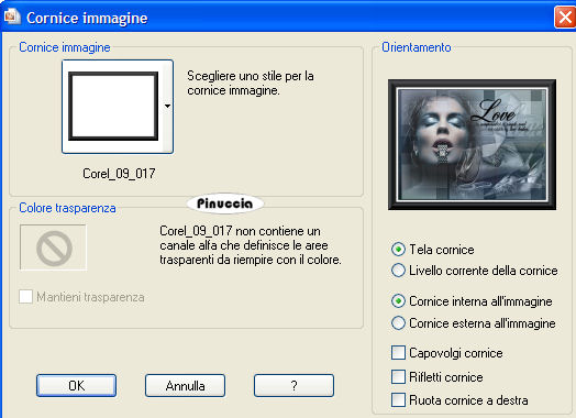cerca e seleziona la cornice Corel_09_017, con i seguenti settaggi: