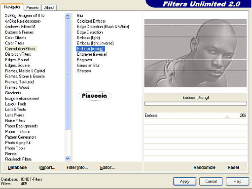 Effetti>Plugins>Filters Unlimited 2.0 - Convolution Filters - Emboss (strong), con i settaggi standard.