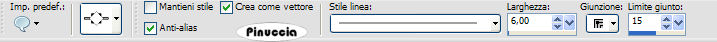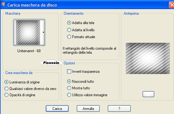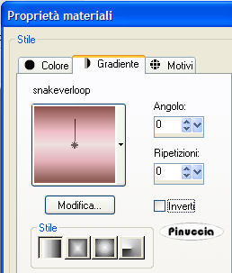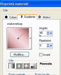 qui puoi trovare qualche risposta ai tuoi dubbi. Se l'argomento che ti interessa non è presente, ti prego di segnalarmelo. Occorrente: Materiale qui Filtro Simple qui Il tube usato per questo tutorial è di Marcio C. Il tube usato per l'esempio in fondo al tutorial è di Patry. L'elemento scrap è di http://tech.groups.yahoo.com/group/ScrappyExpressions/" Metti il gradiente (snakeverloop) nella cartella Gradienti di PSP. Metti le forme (mcHT_Shape01) nella cartella Forme predefinite di PSP. Metti la maschera (Unbenannt-68) nella cartella Maschere di PSP. Apri i tubes in PSP. Apri una nuova immagine trasparente 700 x 500 pixels. Imposta il colore di primo piano su Gradiente, cerca e seleziona il gradiente Snakeverloop, angolo 0, ripetizioni 0: ![]() Riempi l'immagine con questo gradiente.Livelli>Nuovo livello raster. Cambia i settaggi del gradiente: angolo 45, ripetizioni 0: ![]() Riempi il nuovo livello con il gradiente.Livelli>Carica/Salva maschera>Carica maschera da disco. Cerca e carica la maschera unbenannt-68: ![]() Livelli>Unisci>Unisci gruppo. Regola>Messa a fuoco>Metti a fuoco. Effetti>Plugins>Simple - Diamonds. Effetti>Effetti di bordo>Aumenta. Attiva il tube MC2769 e vai a Modifica>Copia. Torna al tuo lavoro e vai a Modifica>Incolla>Incolla come nuovo livello. Non occorre spostarlo. E' già correttamente posizionato. Attiva l'elemento scrap (HS-element-stitch) e vai a Modifica>Copia. Torna al tuo lavoro e vai a Modifica>Incolla>Incolla come nuovo livello. Spostalo a destra.Livelli>Duplica. Immagine>Rifletti. Attiva lo strumento Forme predefinite ![]() Cerca e seleziona la forma 22: ![]() Imposta come colore di primo piano il gradiente e come colore di sfondo #885a50. Traccia la forma in basso da sinistra a destra. ![]() Livelli>Converti in livello raster. Effetti>Effetti 3D>Sfalsa ombra, con i seguenti settaggi, colore nero: ![]() Attiva GL lace. Posizionati sul livello GL0607 e vai a Modifica>Copia. Torna al tuo lavoro e vai a Modifica>Incolla>Incolla come nuovo livello. Spostalo a sinistra.Livelli>Duplica. Immagine>Rifletti. Livelli>Unisci>Unisci tutto. Imposta il colore di primo piano con il bianco e il colore di sfondo con il gradiente. Scrivi il tuo nome all'interno della forma. Io ho usato il font Vivaldi (standard di Windows), dimensione 48. Effetti>Effetti 3D>Sfalsa ombra, con i settaggi precedenti. Immagine>Aggiungi bordatura, 5 pixels, simmetriche, con il colore bianco. Seleziona il bordo bianco con la bacchetta magica ![]() e riempilo con il gradiente.Selezione>Nessuna selezione. Aggiungi il tuo watermark e salva in formato jpg. ![]() ![]() Se hai problemi o dubbi, o trovi un link non funzionante, o anche soltanto per un saluto, scrivimi. 7 Aprile 2007 |