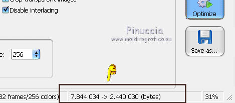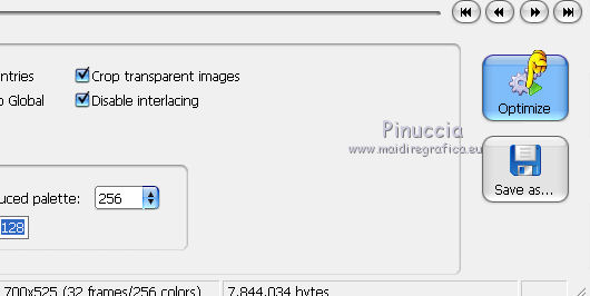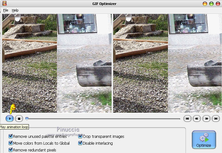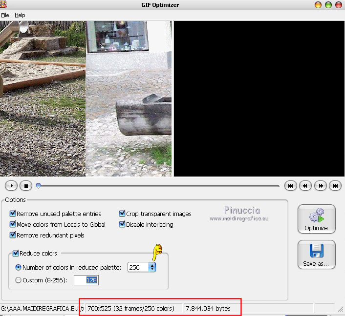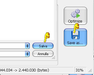 Gif Optimizer è un piccolo software free, utile per ridurre il peso, a volte eccessivo, delle animazioni. Puoi scaricarlo anche dal sito qui L'installazione è molto semplice. Clicca sull'icona del programma per far partire l'installazione. ![]() Apparirà il consueto avviso di protezione. Clicca Esegui... ![]() ... e continua per installare il software. Una volta installato, apri Gif optmizer e clicca su File>Open per cercare e aprire l'immagine da ridimensionare. ![]() Aperta l'immagine, visualizzerai - nella barra inferiore - le relative informazioni: dimensioni, numero di fotogrammi, colori e peso. ![]() Puoi lasciare i settaggi (Options) come stanno. Devi soltanto decidere se ridurre o no il numero dei colori. Di default Gif optimizer indica 128 colori, ma spesso questo settaggio rovina molto il risultato. Questo risultato, però, non è sempre negativo. Volendo puoi fare un tentativo: se poi non sei soddisfatto ripeti l'ottimizzazione a 256 colori, che è il settaggio ottimale. Selezionato il numero dei colori clicca su Optimize (ottimizza). ![]() e attendi il completamento del procedimento. ![]() Terminato il processo di ridimensionamento, vedrai in basso il nuovo peso dell'animazione, con la percentuale (che varia a seconda dell'animazione). ![]() Nella finestra a destra, puoi verificare il risultato. Cliccando su play puoi vedere anche l'animazione. ![]() Se tutto va bene, clicca su Save as per salvare la nuova animazione. ![]() Scheda creata il 22 Giugno 2011. |